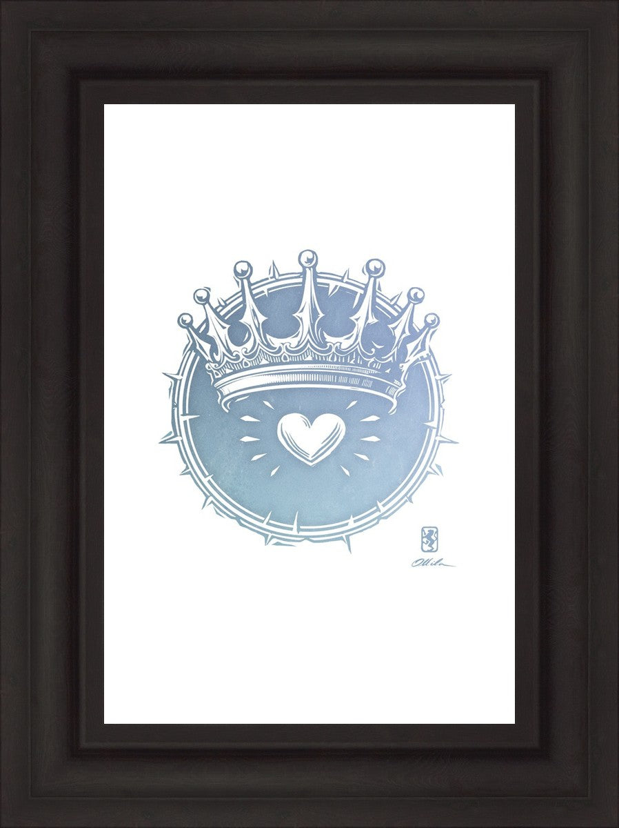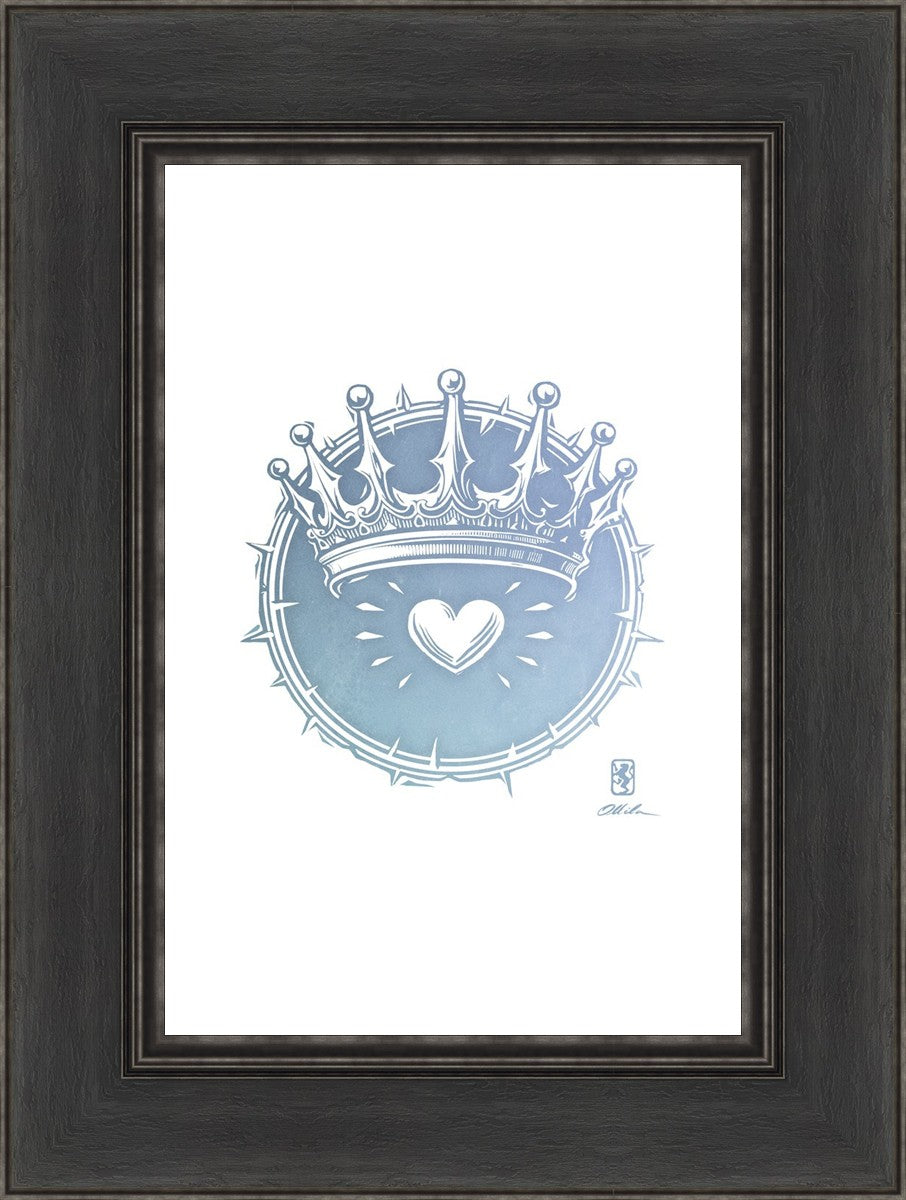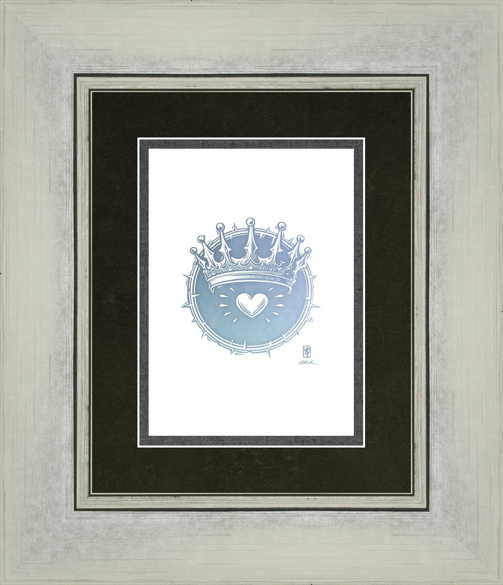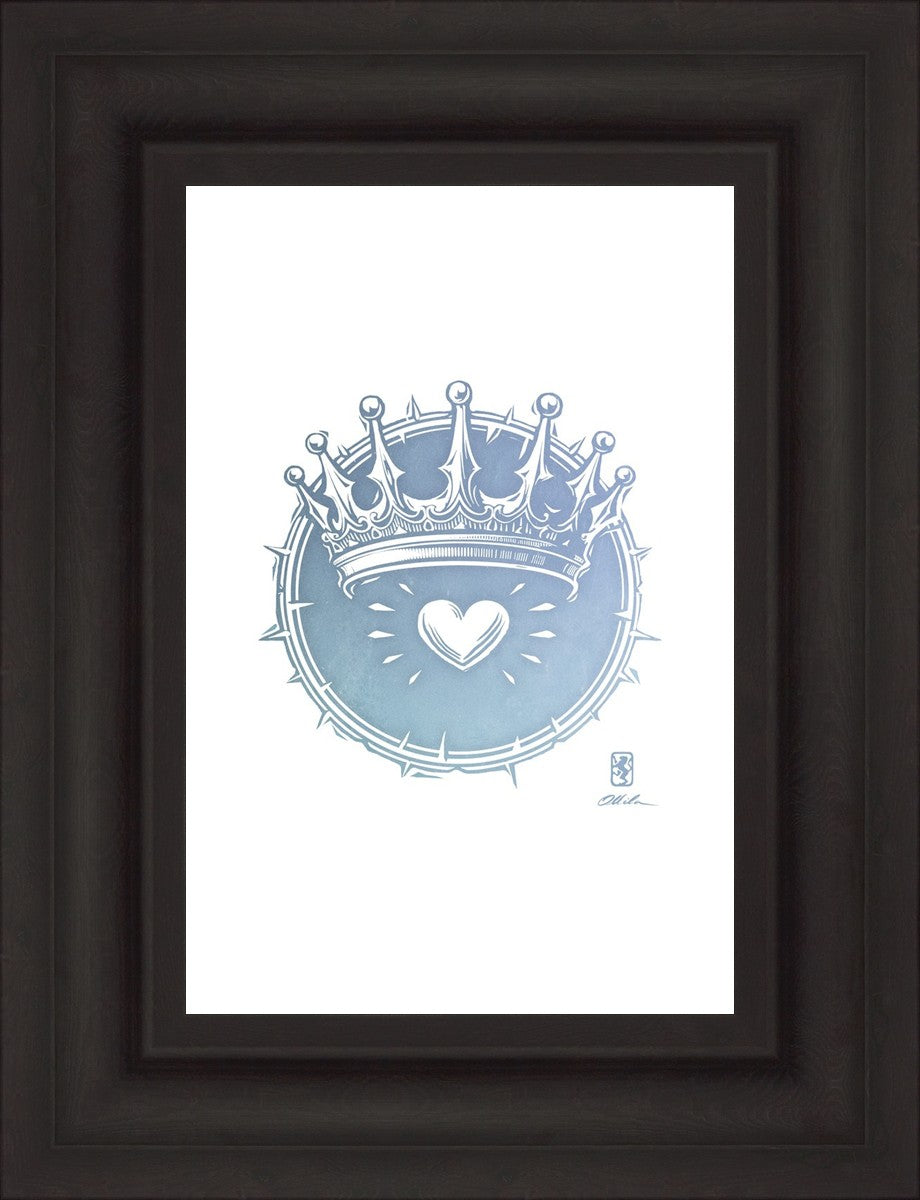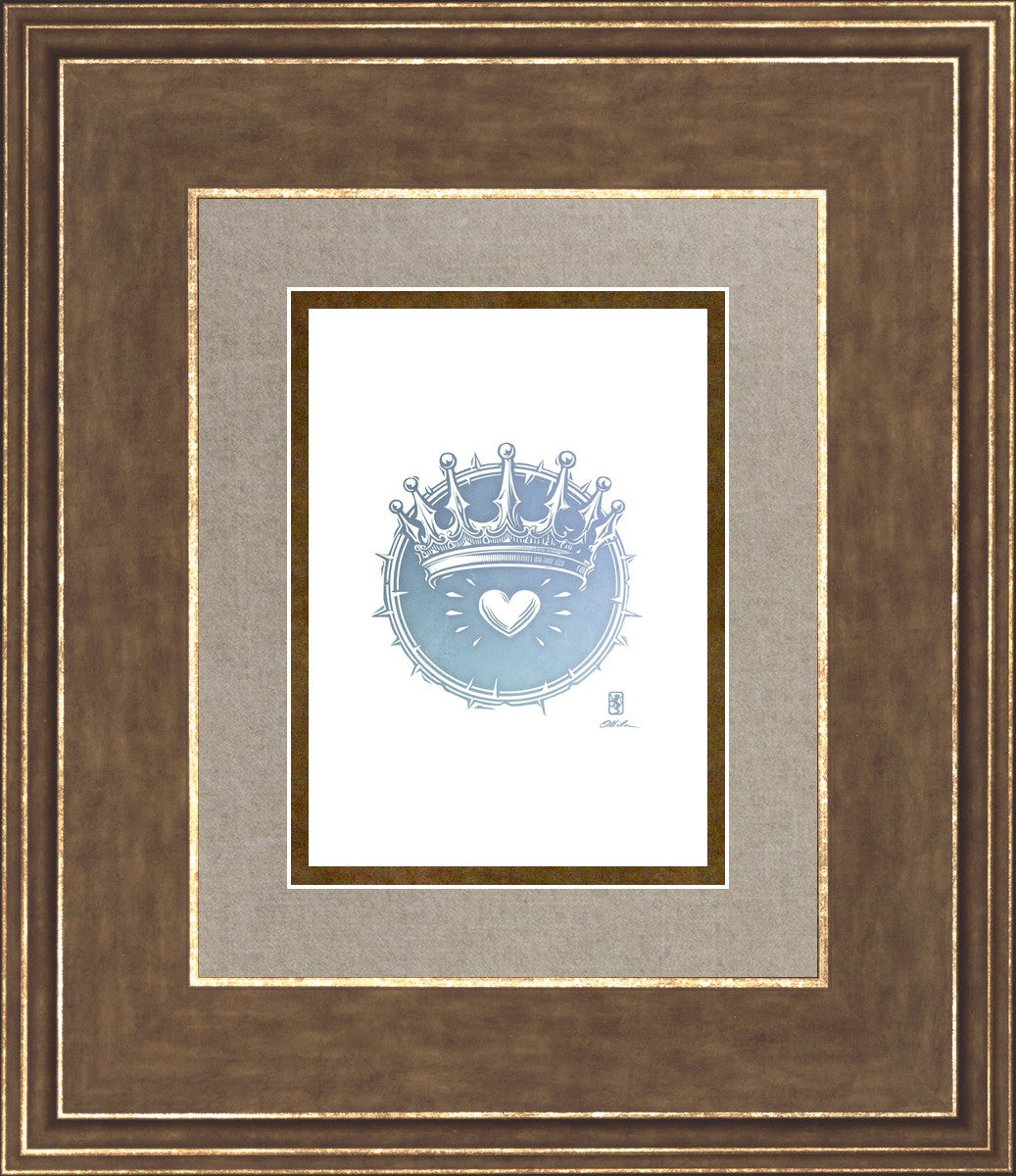 Two Crowns was created as a hand carved woodcut relief print. The artist took inspiration from the symbolic crown that Christ wears as King of Kings, and yet the only crown He wore on earth was the crown of thorns, which you may notice represented here upon second glance. This work was created as a reminder of His love and enduring sacrifice made on our behalf.