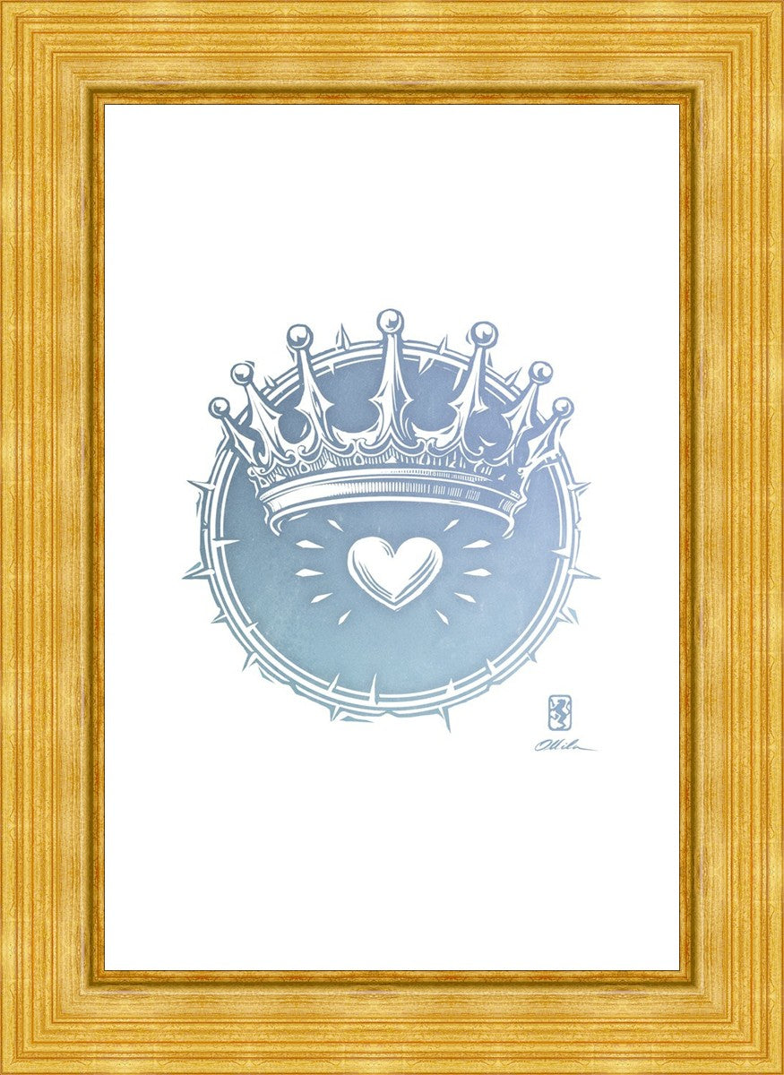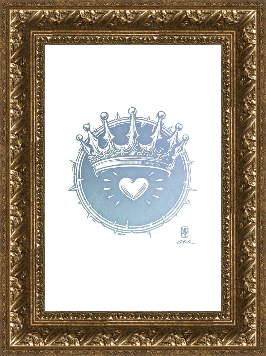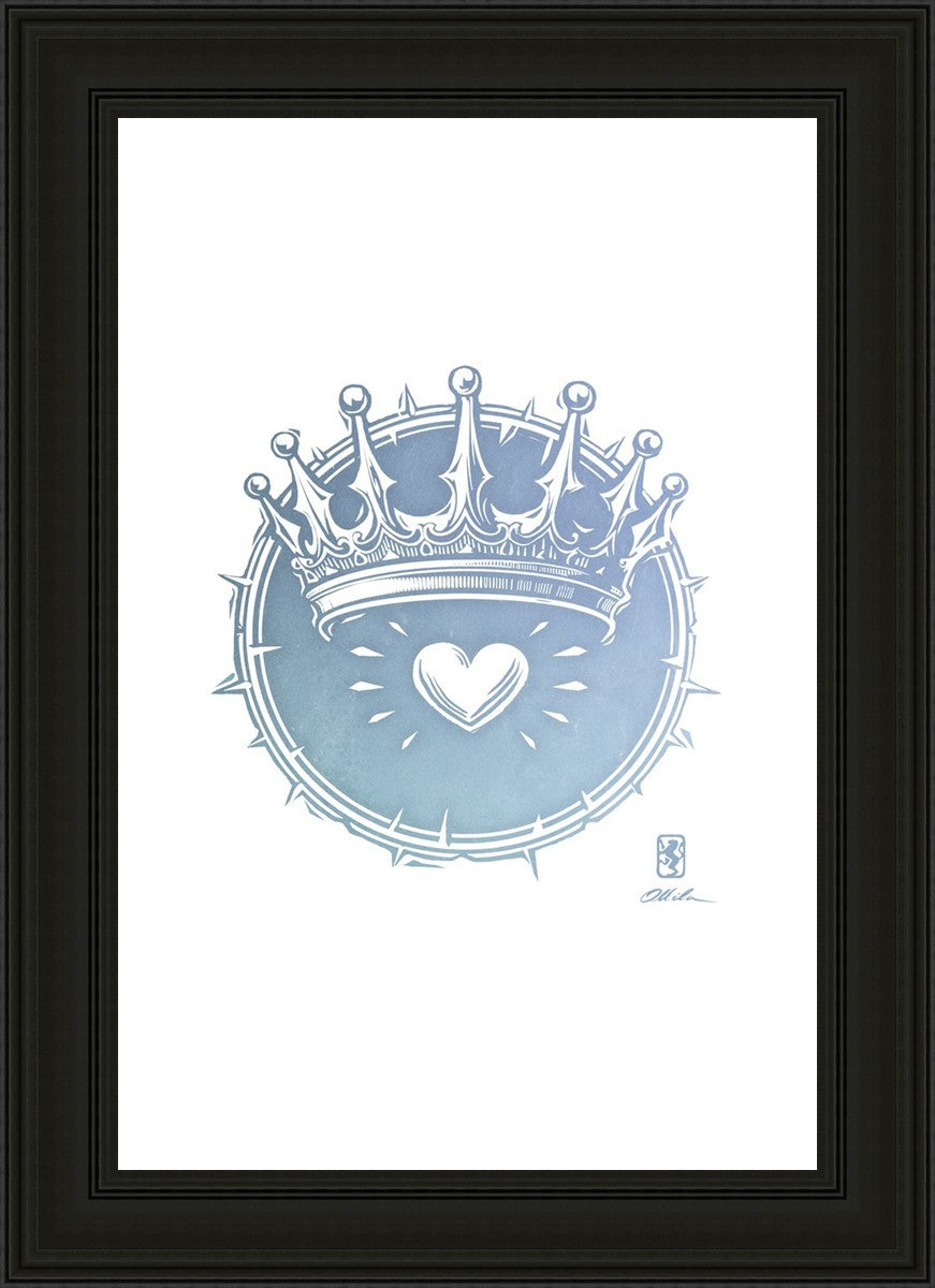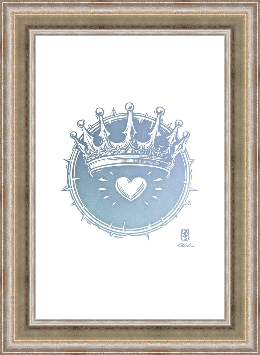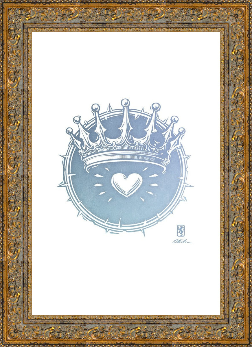 Two Crowns was created as a hand carved woodcut relief print. The artist took inspiration from the symbolic crown that Christ wears as King of Kings, and yet the only crown He wore on earth was the crown of thorns, which you may notice represented here upon second glance. This work was created as a reminder of His love and enduring sacrifice made on our behalf.