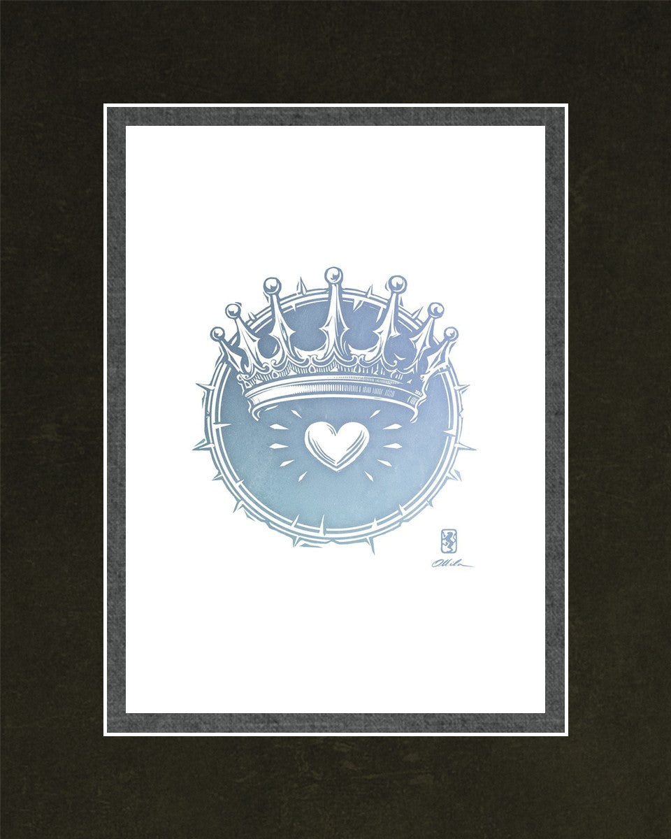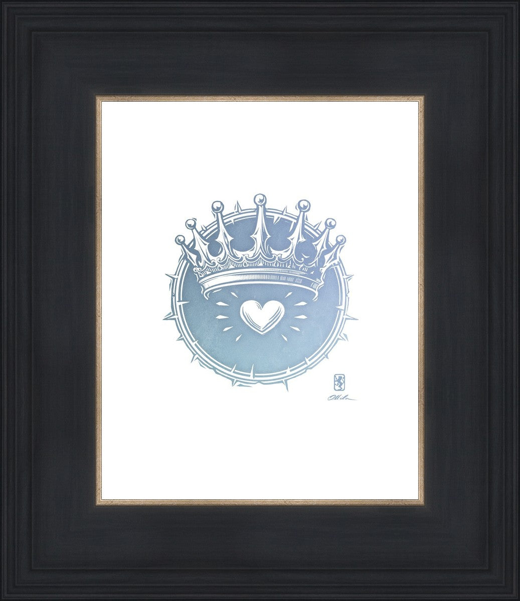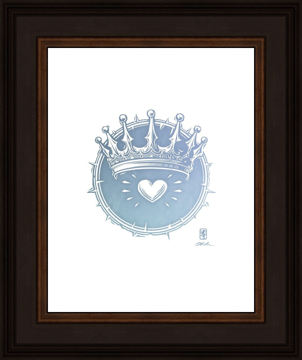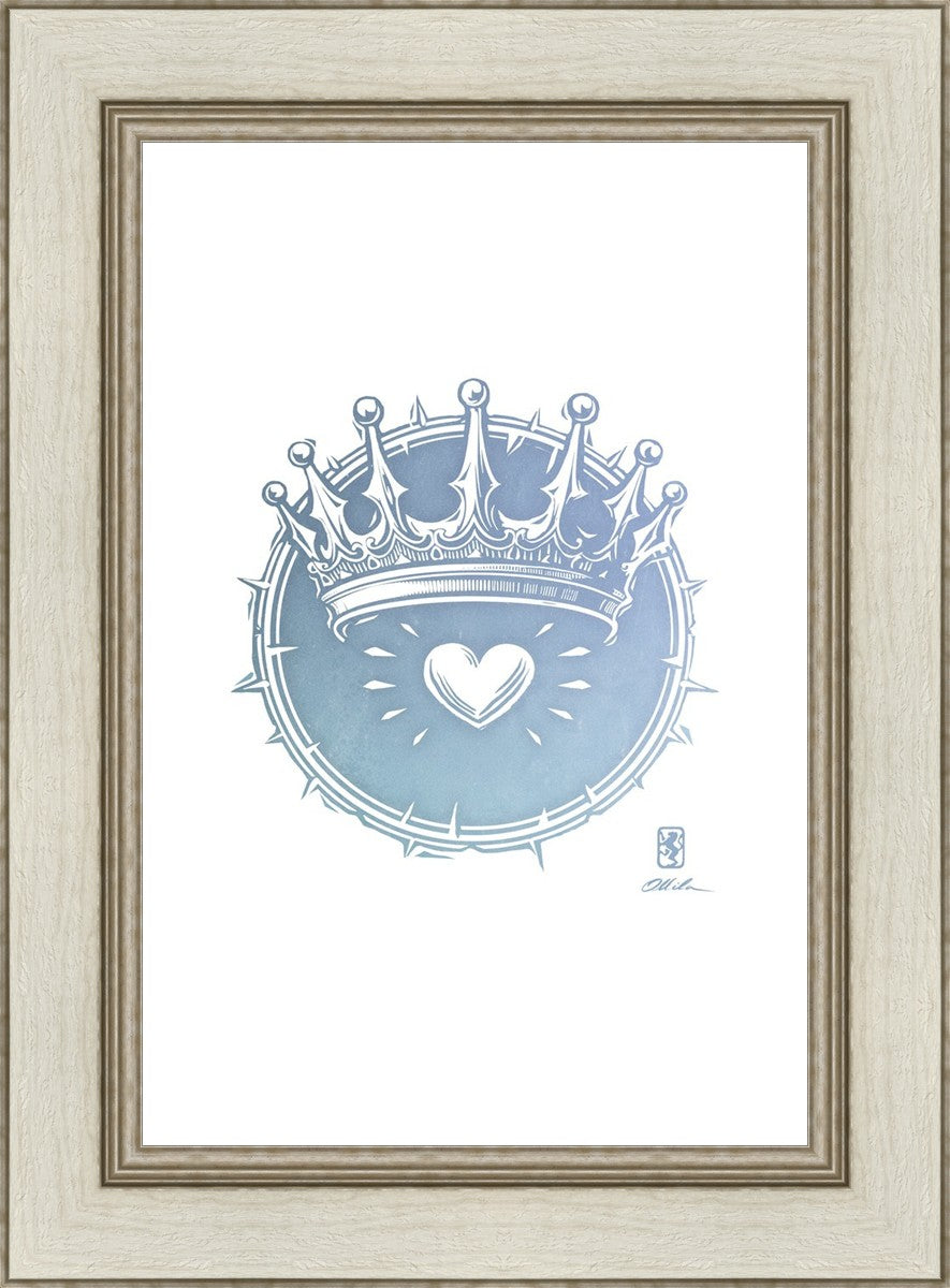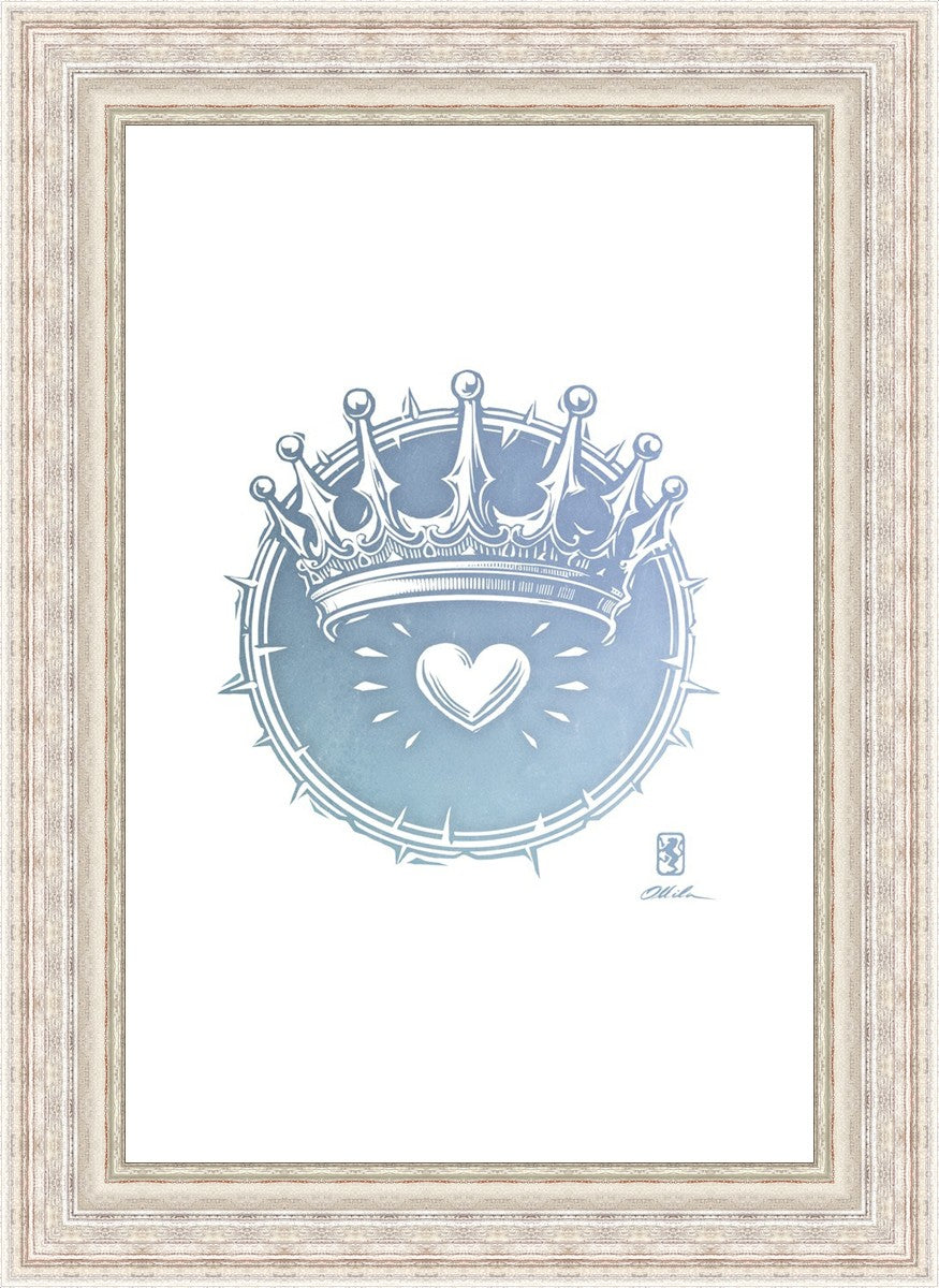 Two Crowns was created as a hand carved woodcut relief print. The artist took inspiration from the symbolic crown that Christ wears as King of Kings, and yet the only crown He wore on earth was the crown of thorns, which you may notice represented here upon second glance. This work was created as a reminder of His love and enduring sacrifice made on our behalf.