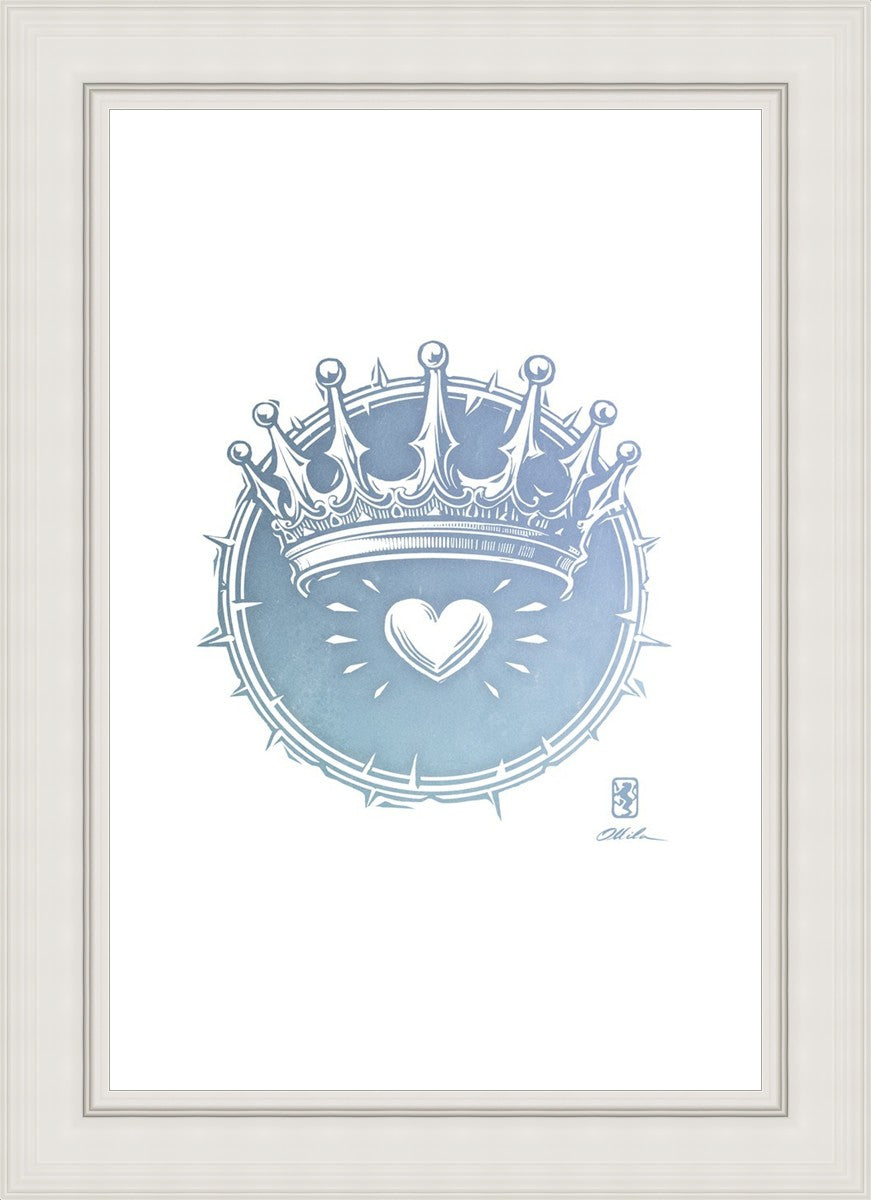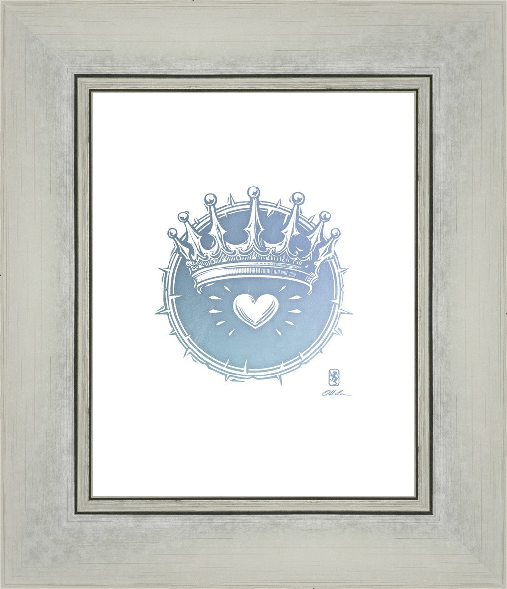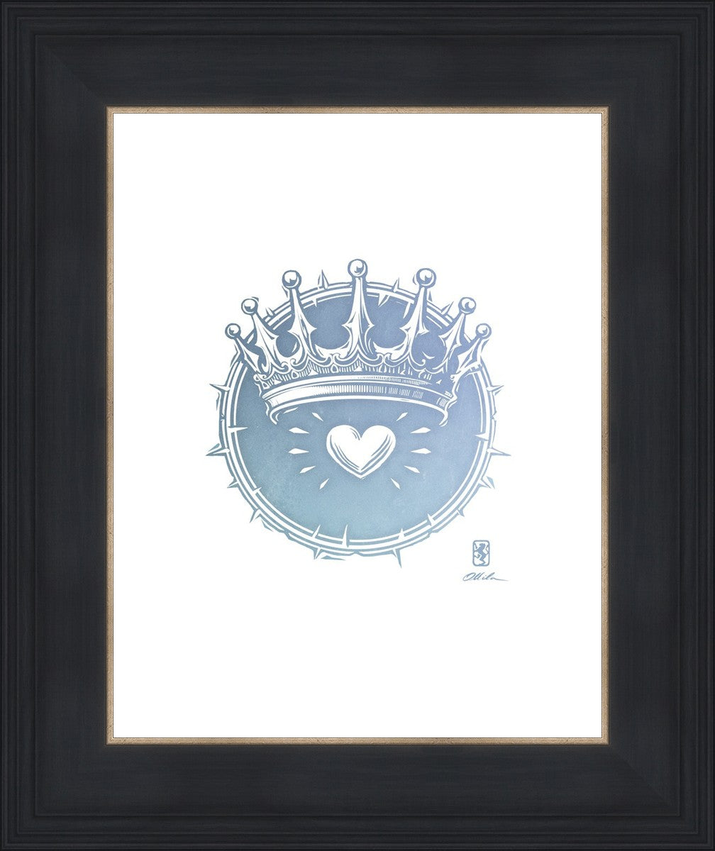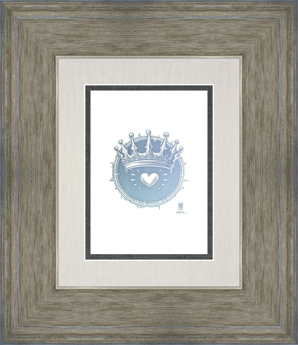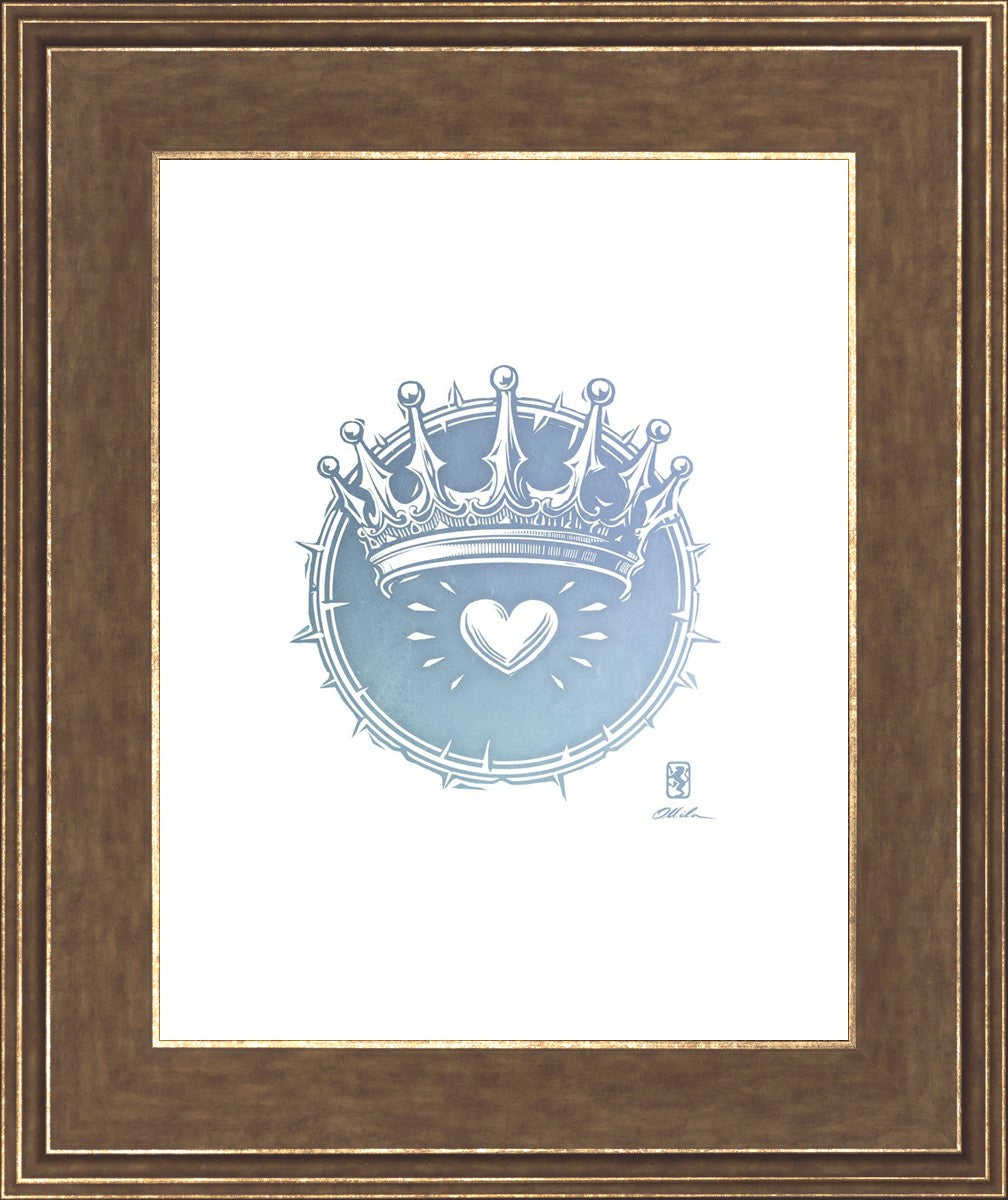 Two Crowns was created as a hand carved woodcut relief print. The artist took inspiration from the symbolic crown that Christ wears as King of Kings, and yet the only crown He wore on earth was the crown of thorns, which you may notice represented here upon second glance. This work was created as a reminder of His love and enduring sacrifice made on our behalf.