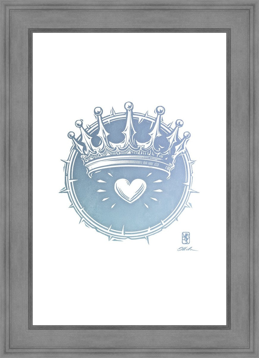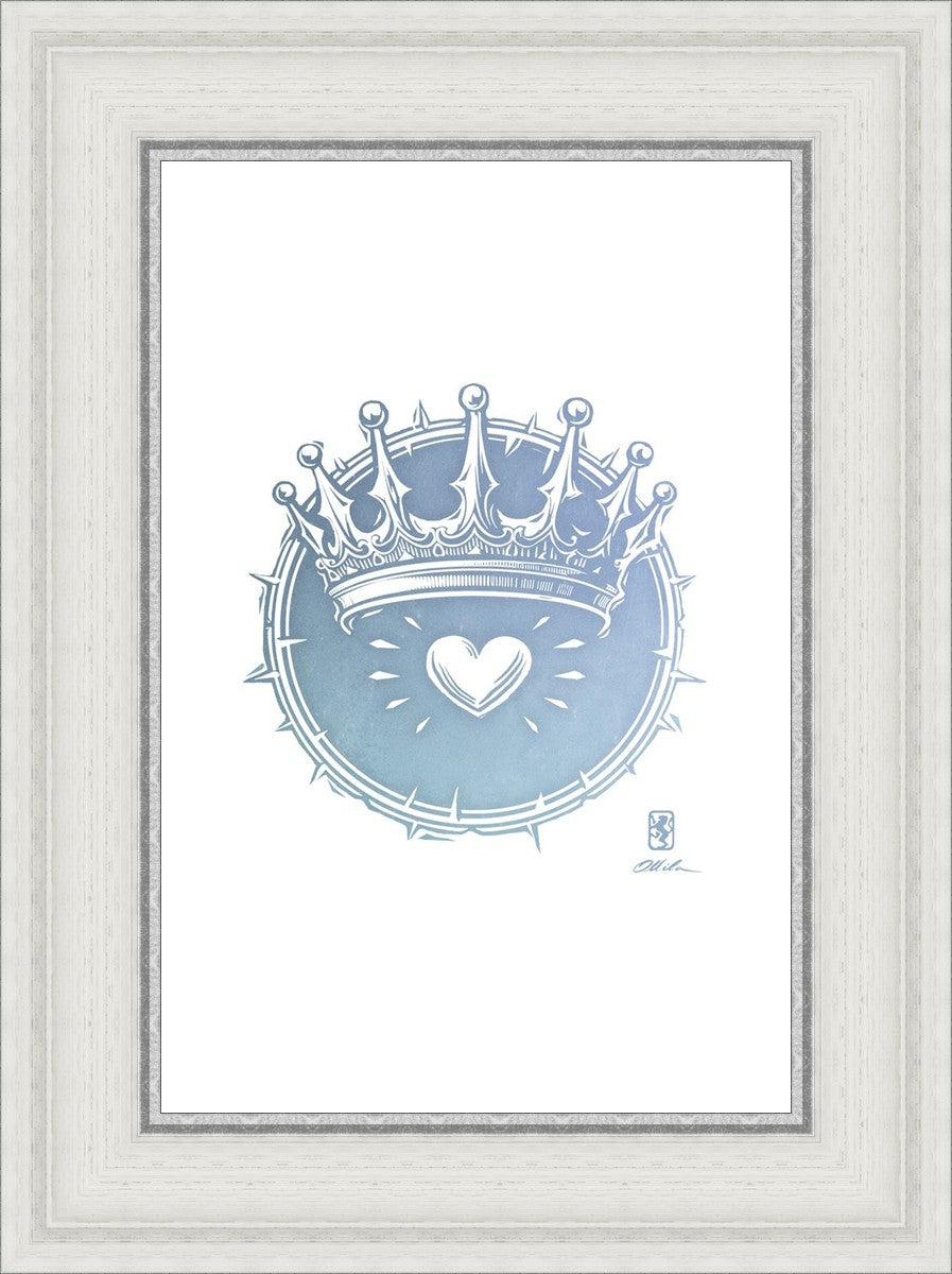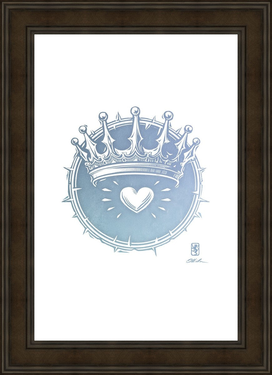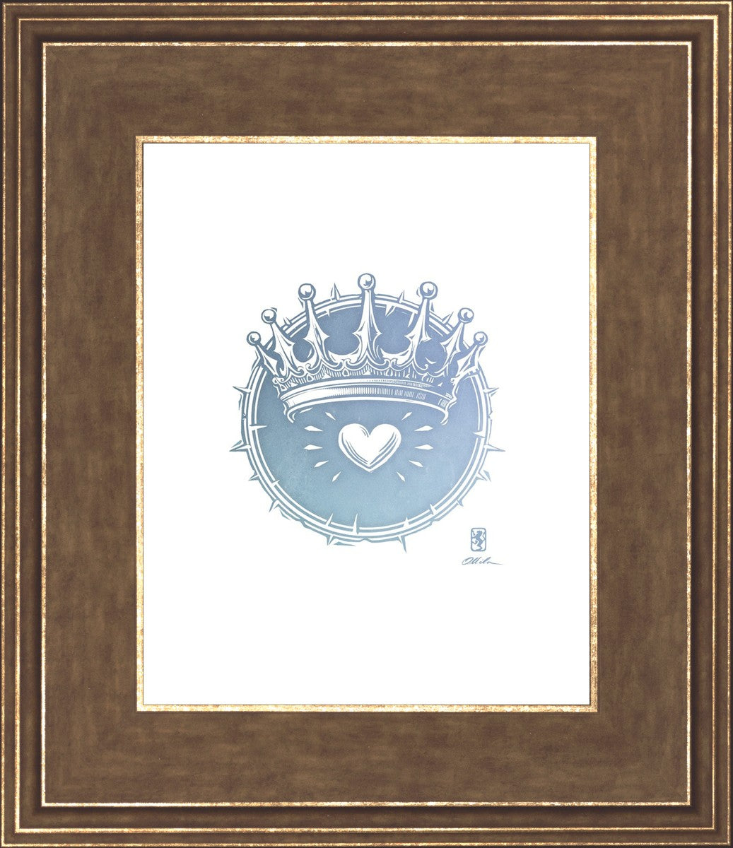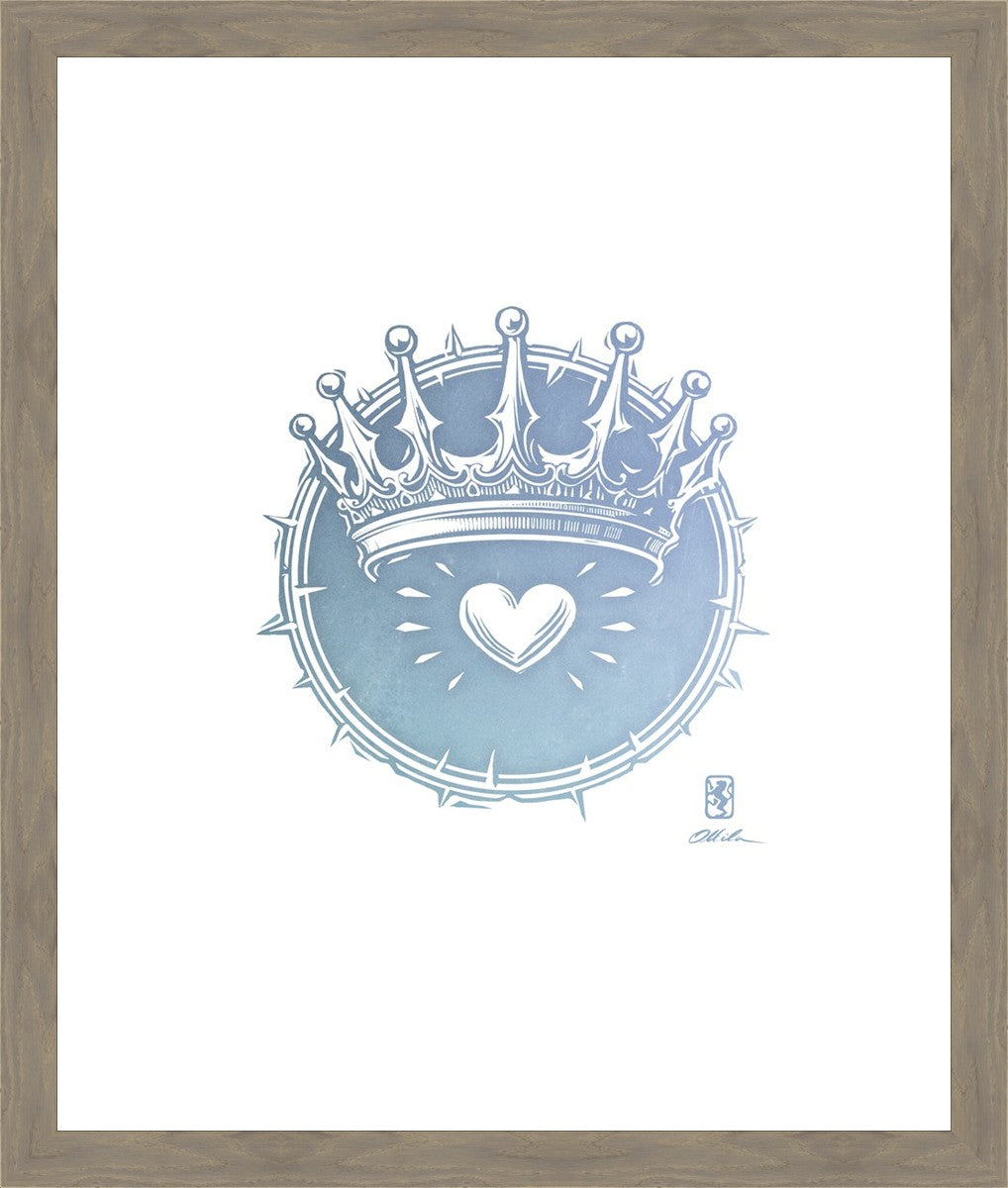 Two Crowns was created as a hand carved woodcut relief print. The artist took inspiration from the symbolic crown that Christ wears as King of Kings, and yet the only crown He wore on earth was the crown of thorns, which you may notice represented here upon second glance. This work was created as a reminder of His love and enduring sacrifice made on our behalf.