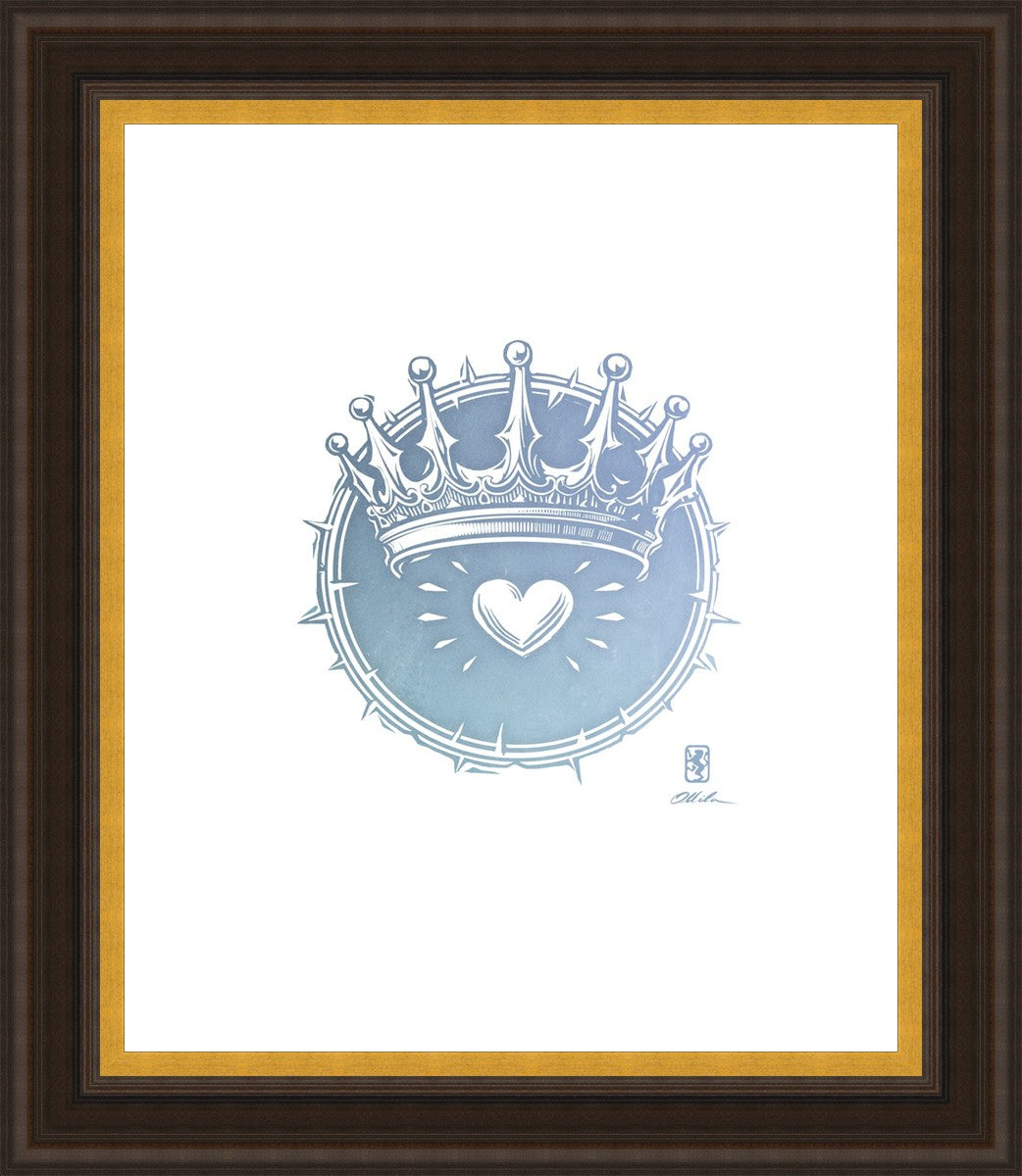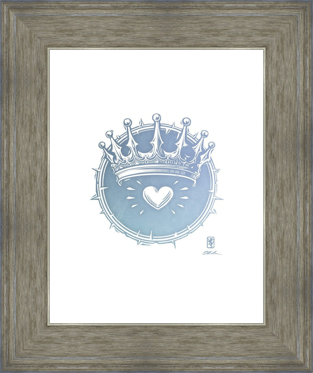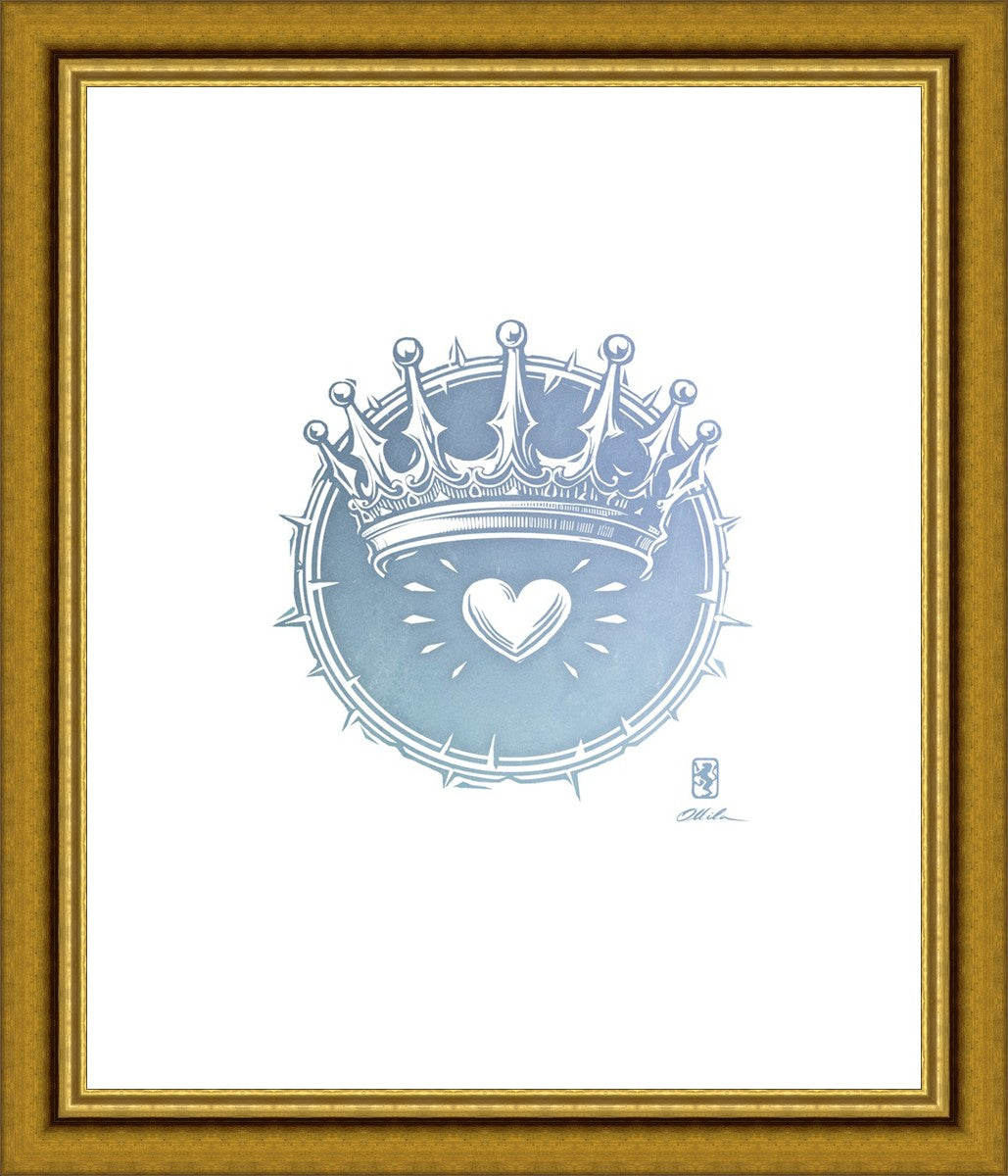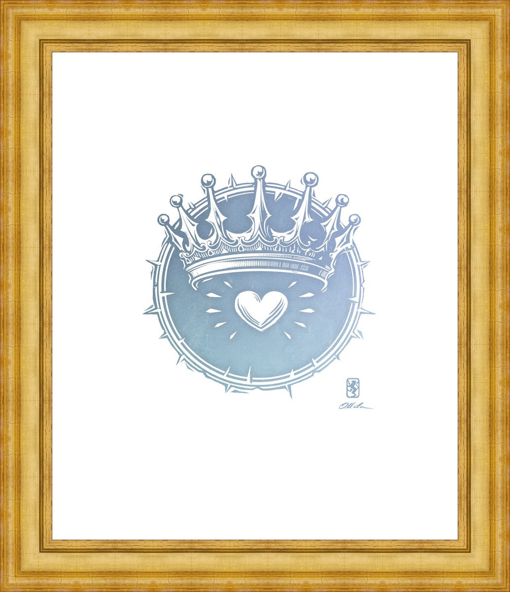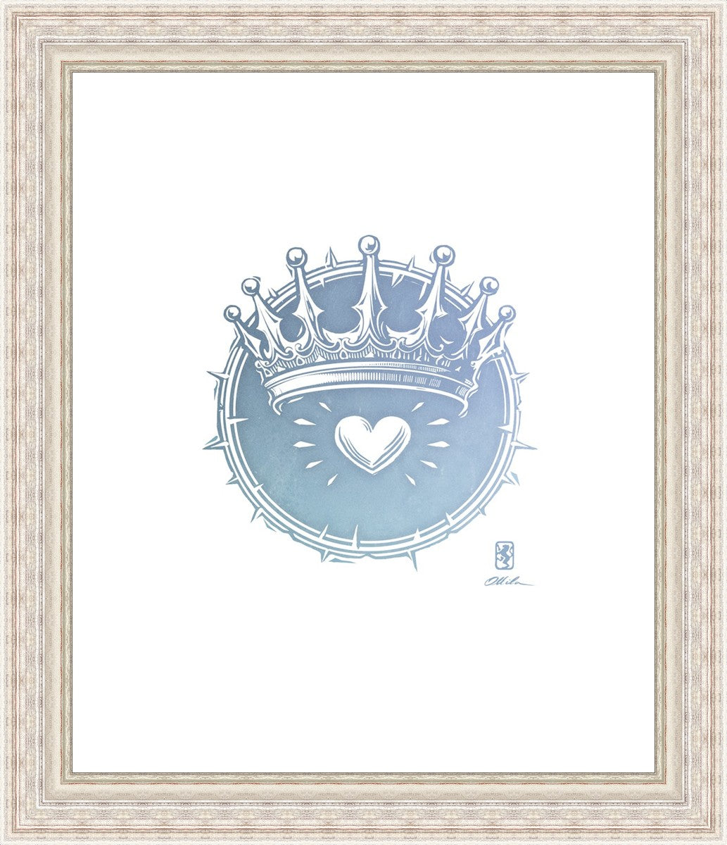 Two Crowns was created as a hand carved woodcut relief print. The artist took inspiration from the symbolic crown that Christ wears as King of Kings, and yet the only crown He wore on earth was the crown of thorns, which you may notice represented here upon second glance. This work was created as a reminder of His love and enduring sacrifice made on our behalf.