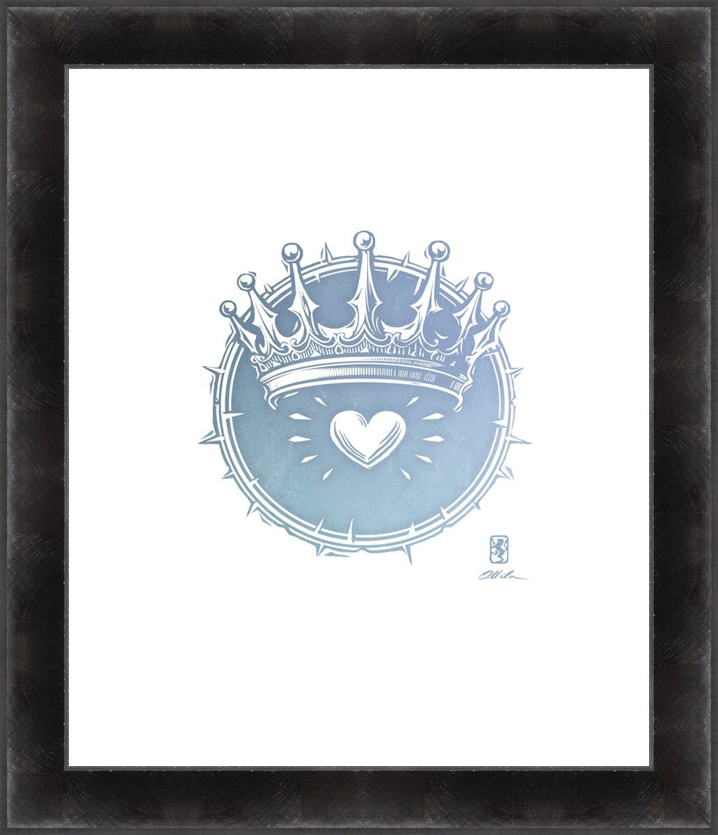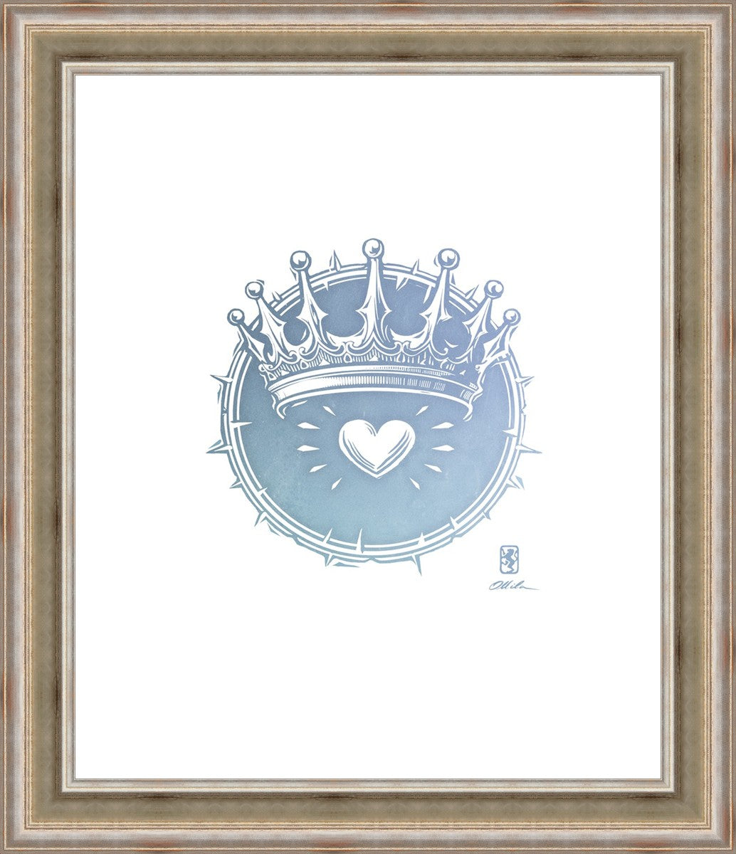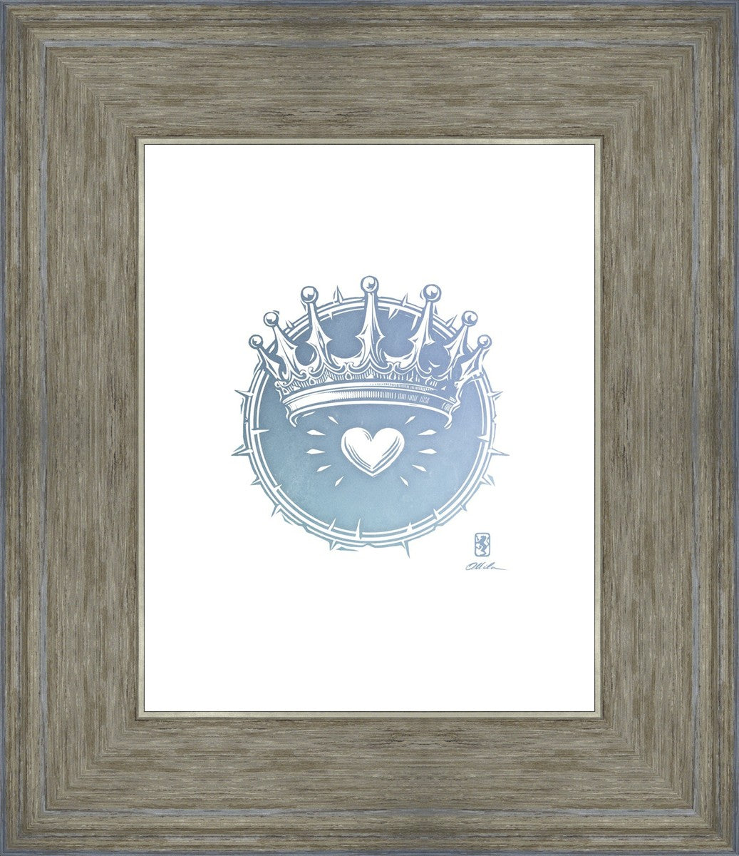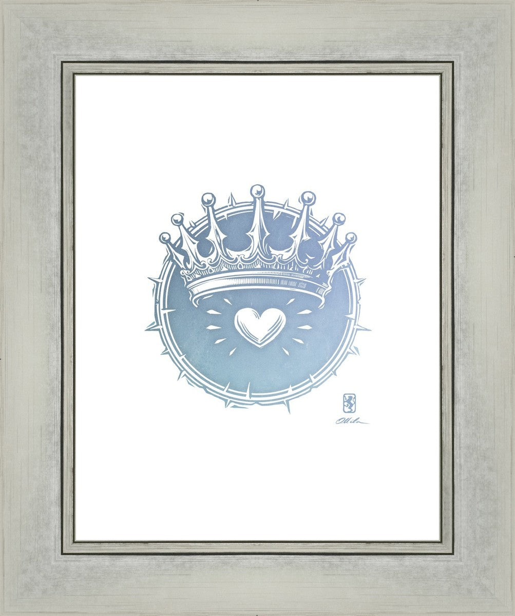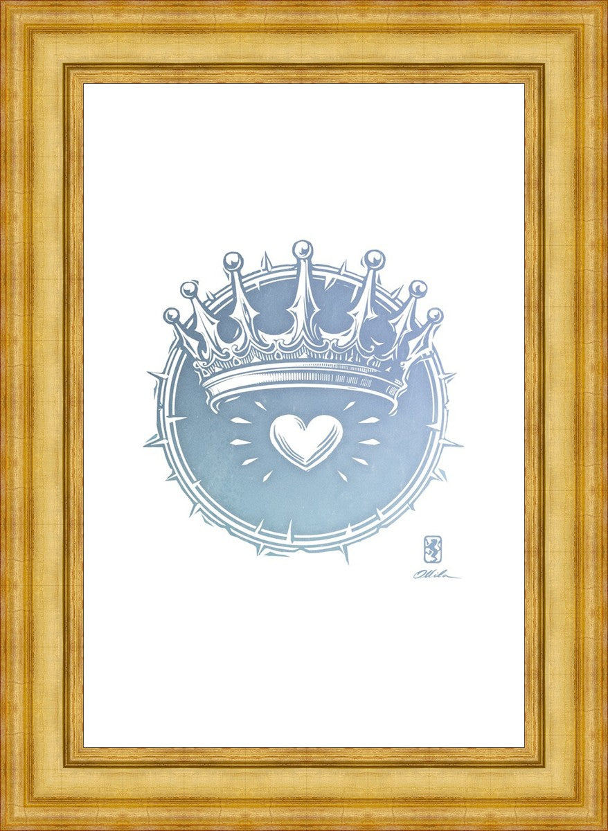 Two Crowns was created as a hand carved woodcut relief print. The artist took inspiration from the symbolic crown that Christ wears as King of Kings, and yet the only crown He wore on earth was the crown of thorns, which you may notice represented here upon second glance. This work was created as a reminder of His love and enduring sacrifice made on our behalf.