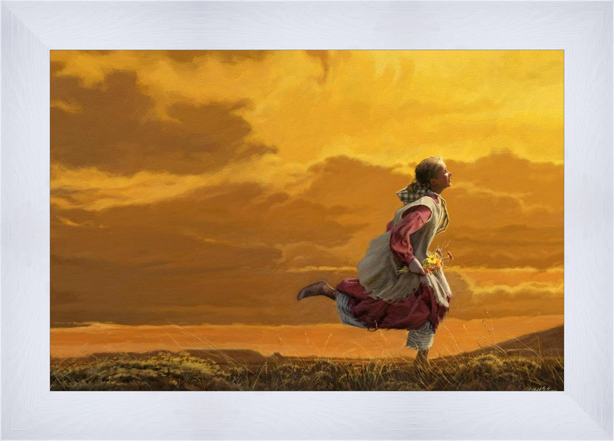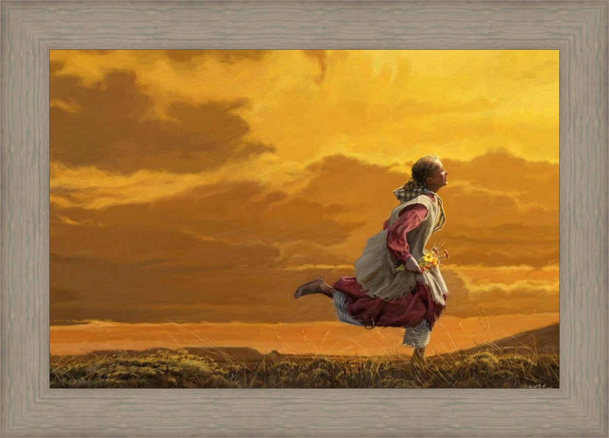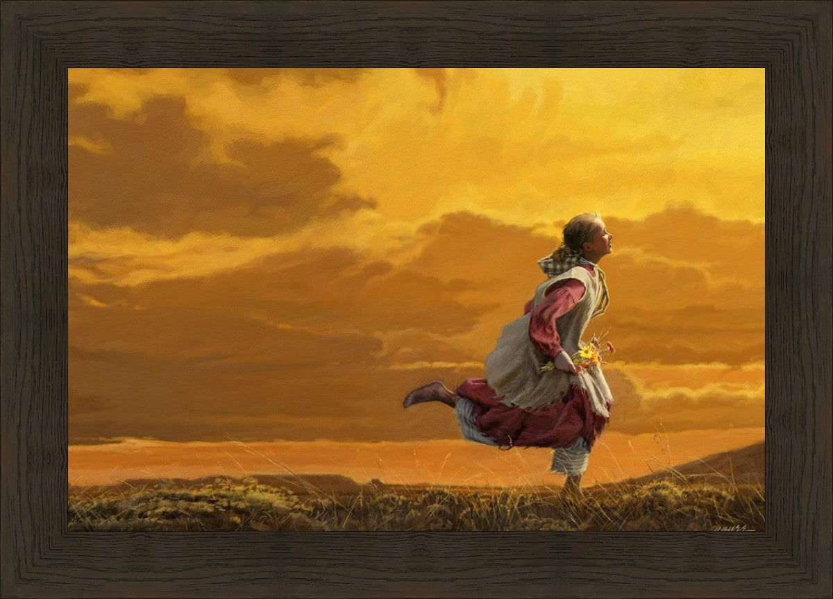 Young pioneer girl running with a handful of wildflowers. This painting was originally part of the book The White Ox I later added the flowers and it was used as a cover for the Friend Magazine.