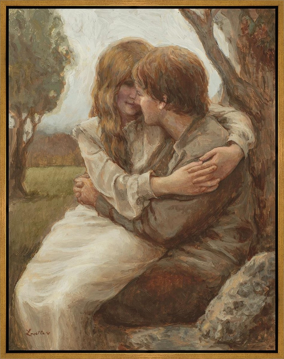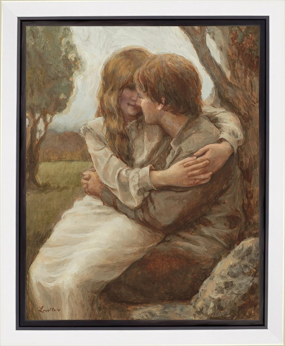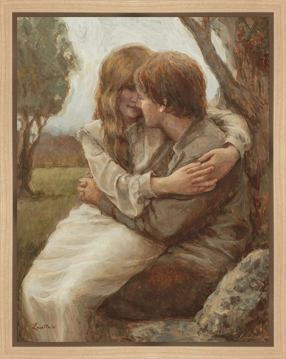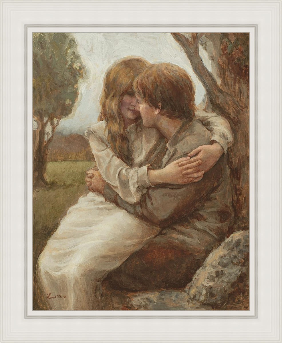 A young couple cuddle on a rock next to a tree. Their arms wrap around one another, forming a version of the infinity sign. I love pondering how relationships evolve and this painting celebrates new and fresh love with the hope of an eternal connection.