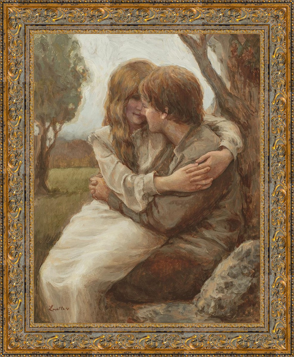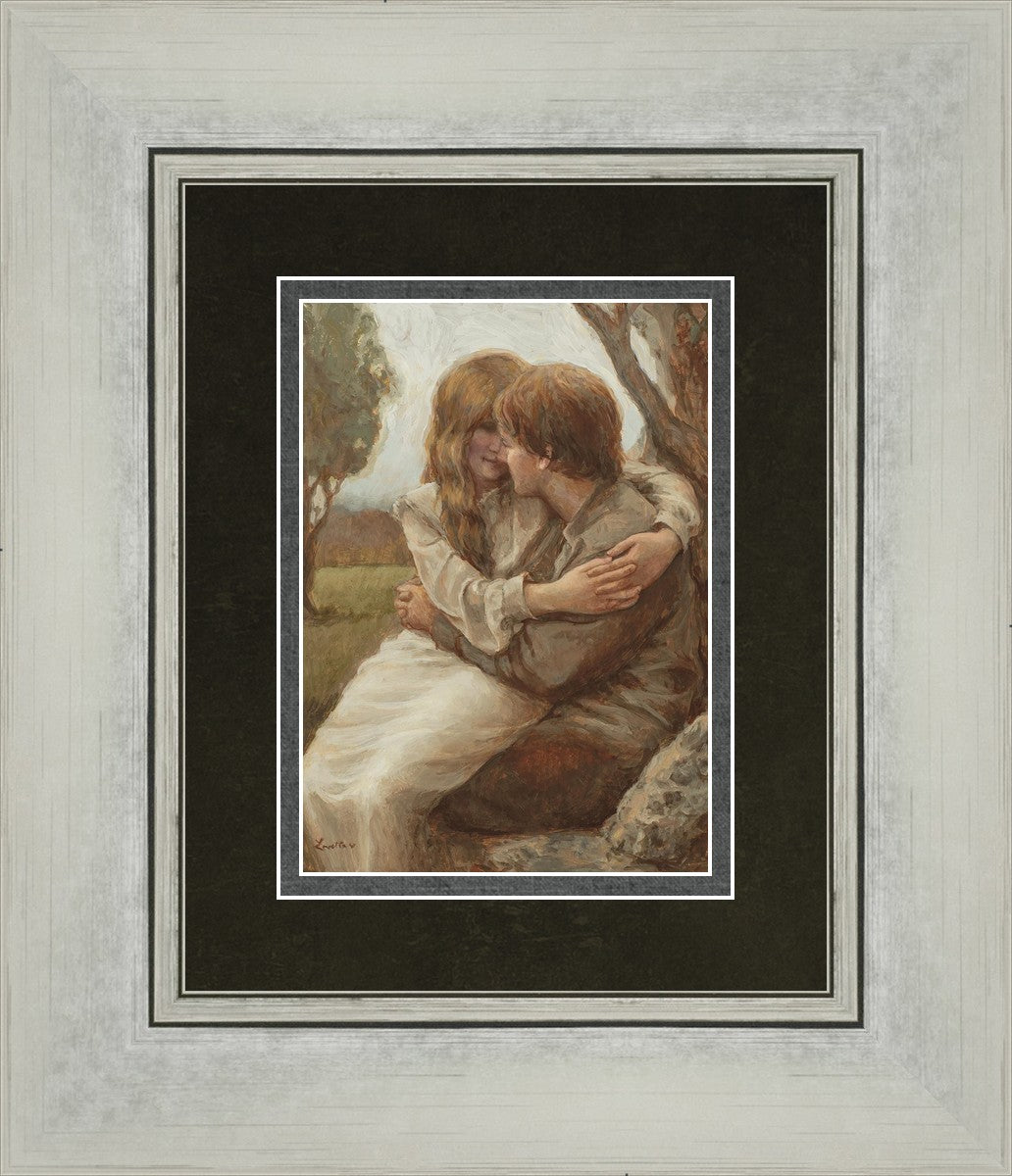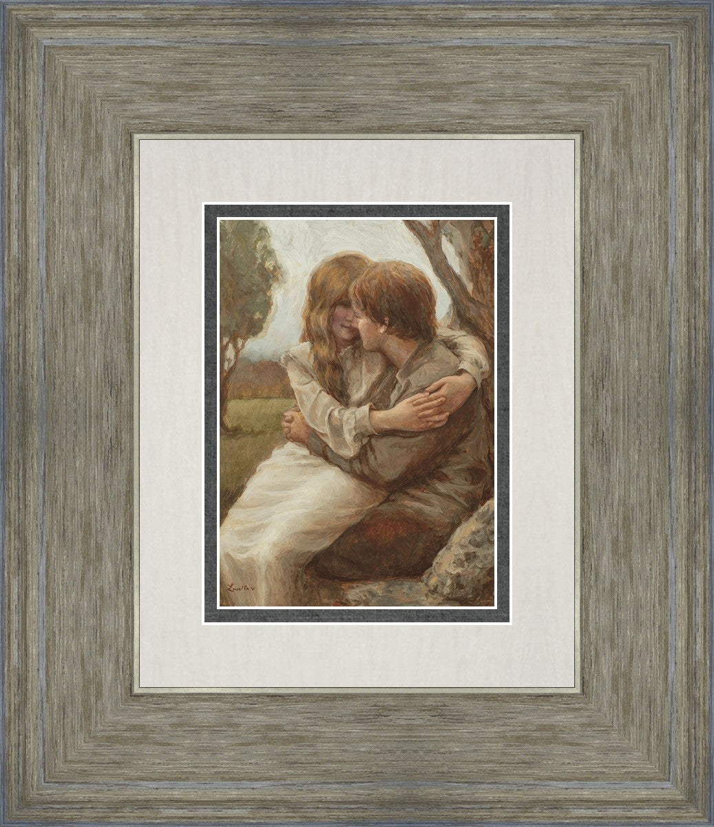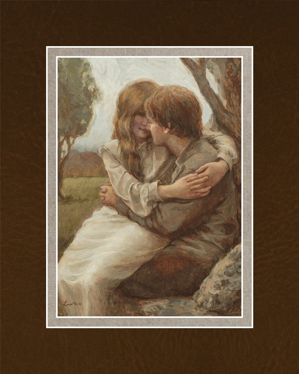 A young couple cuddle on a rock next to a tree. Their arms wrap around one another, forming a version of the infinity sign. I love pondering how relationships evolve and this painting celebrates new and fresh love with the hope of an eternal connection.