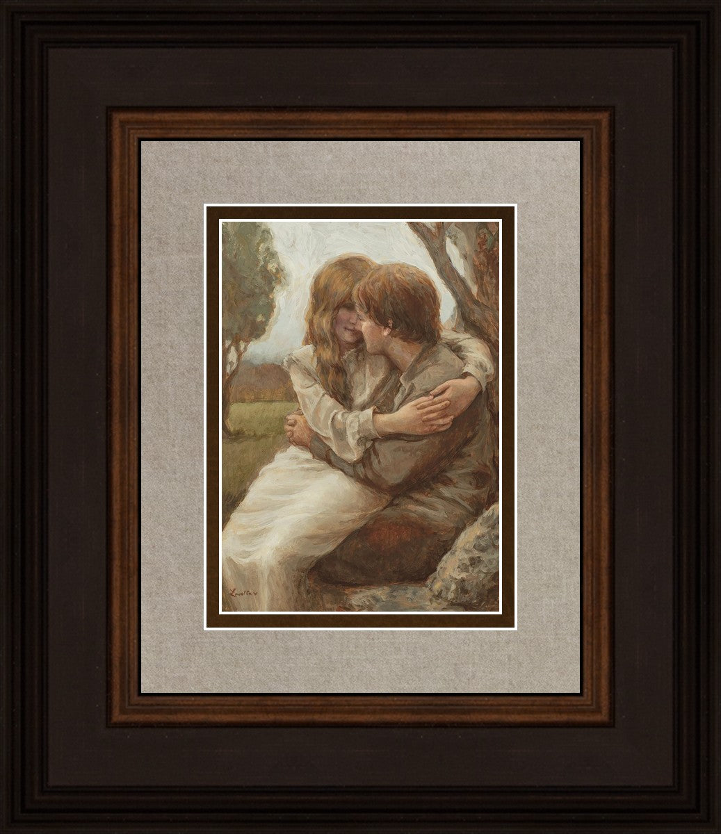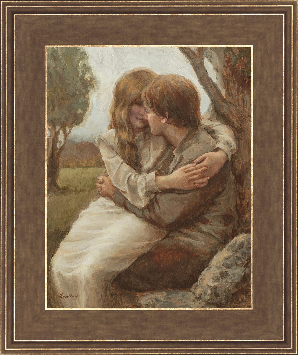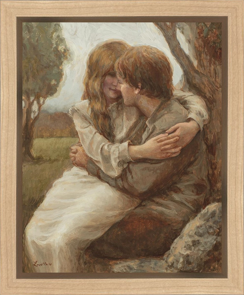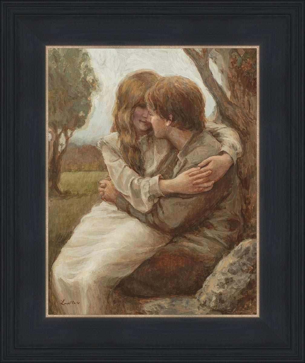 A young couple cuddle on a rock next to a tree. Their arms wrap around one another, forming a version of the infinity sign. I love pondering how relationships evolve and this painting celebrates new and fresh love with the hope of an eternal connection.