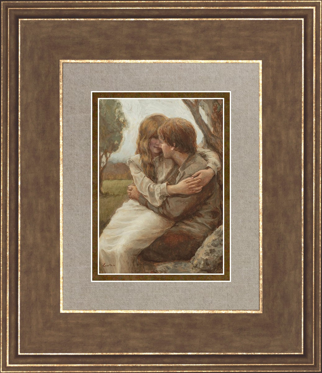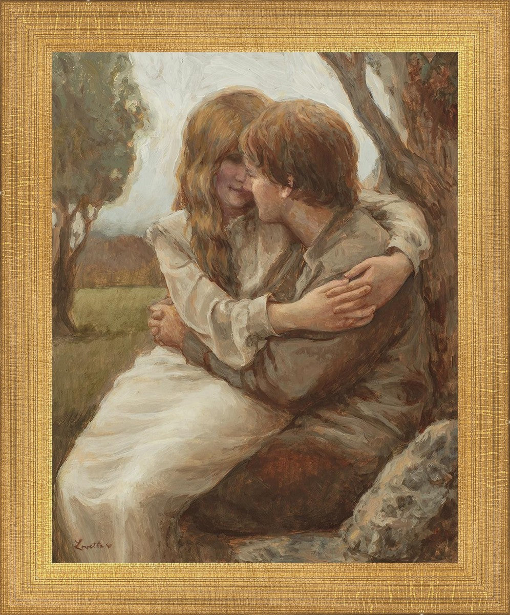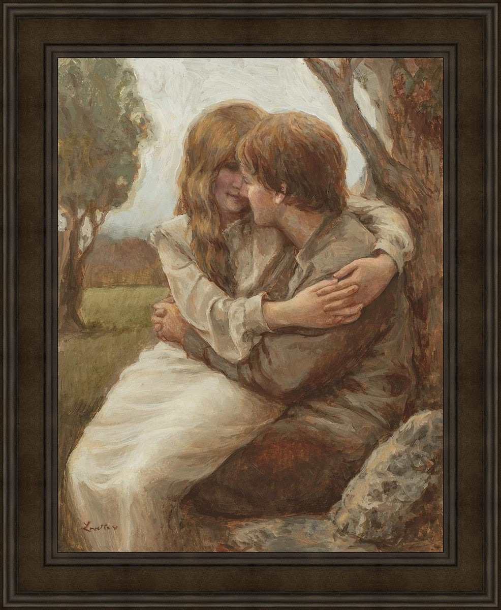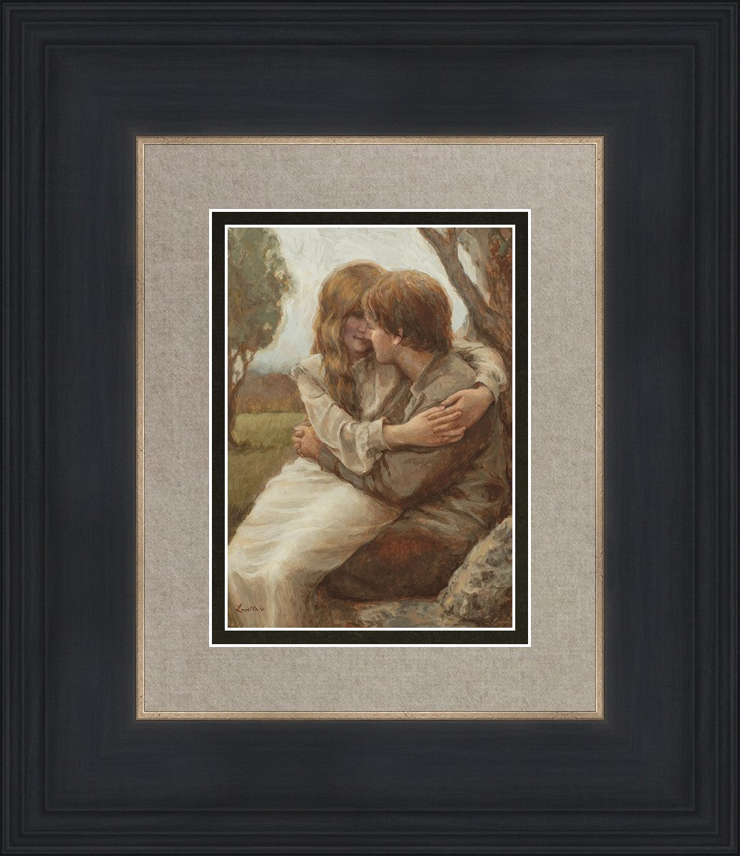 A young couple cuddle on a rock next to a tree. Their arms wrap around one another, forming a version of the infinity sign. I love pondering how relationships evolve and this painting celebrates new and fresh love with the hope of an eternal connection.