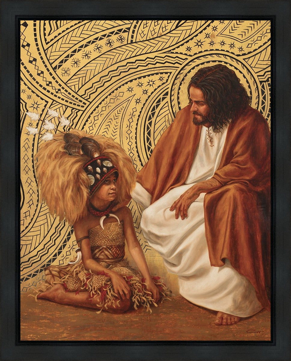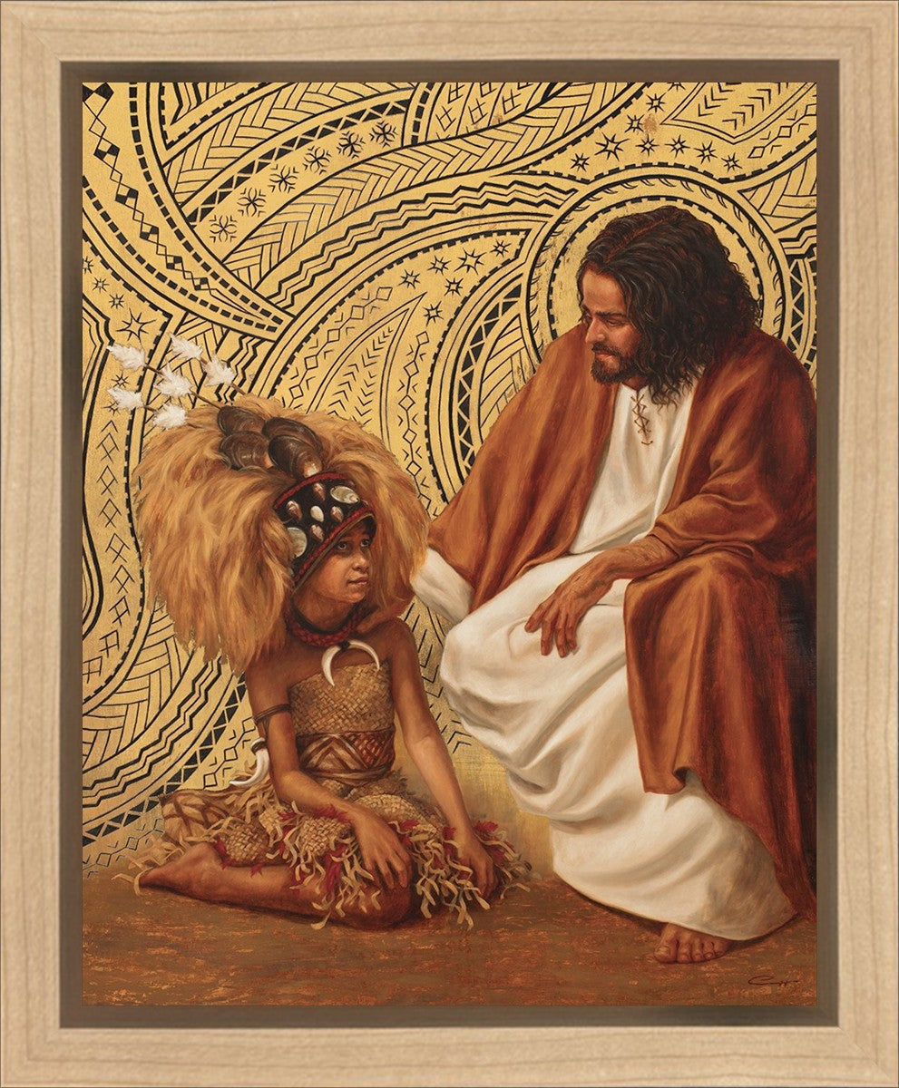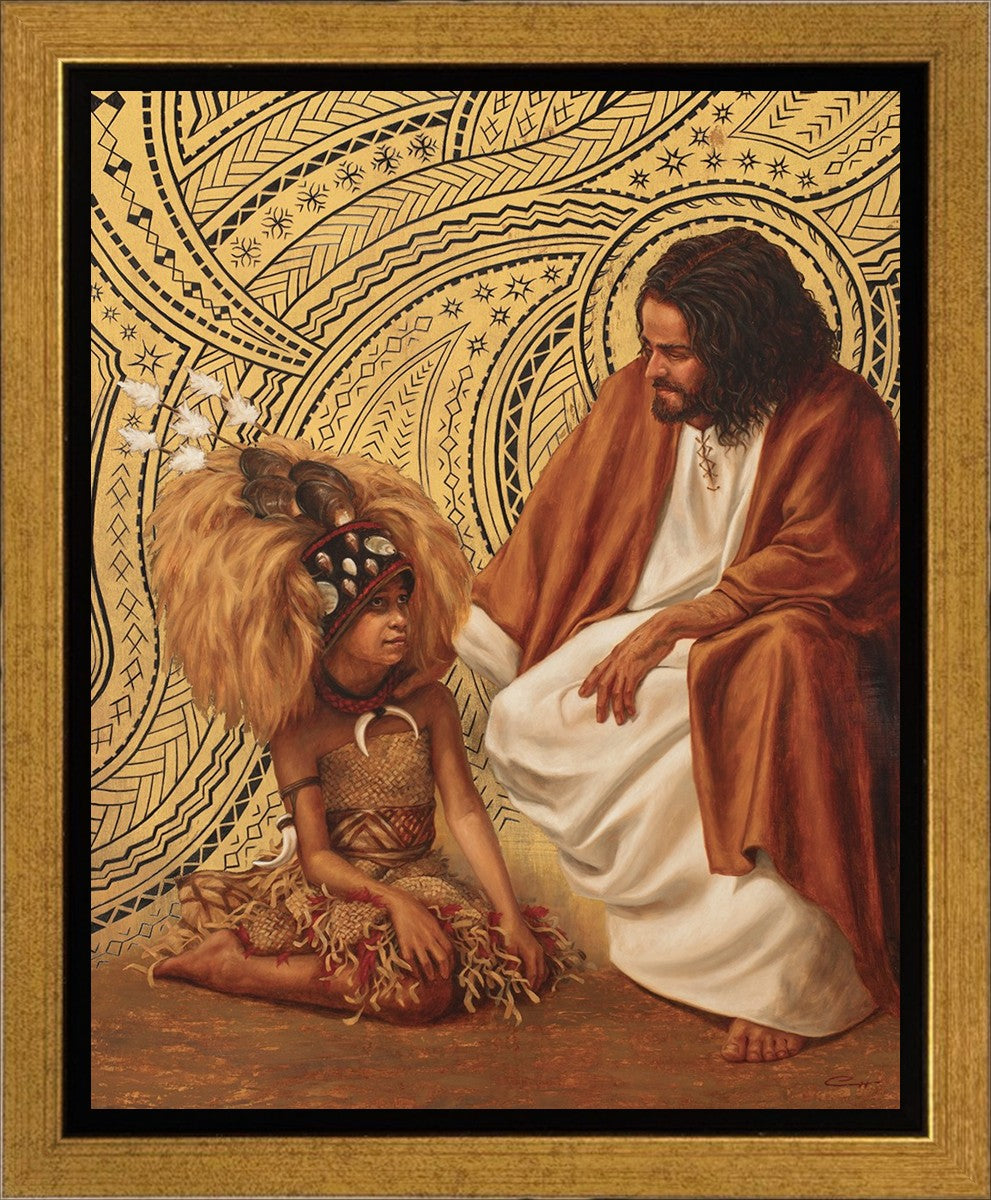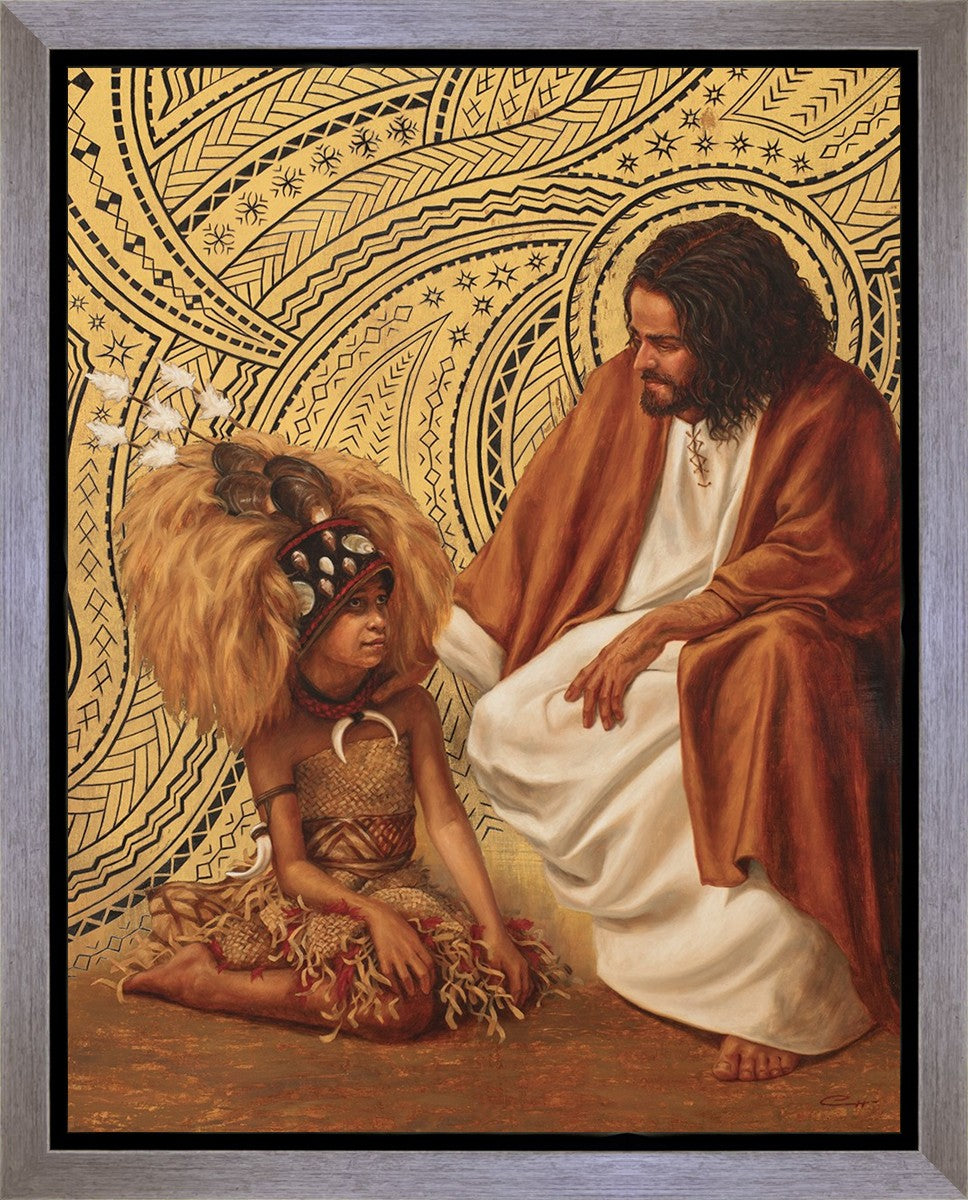 All of us hold within us the spark of royal divinity. This piece utilizes traditional Samoan imagery to communicate this. The young girl sitting at Christ's feet wears the attire of a taupou, signifying her royal rank and role in sharing and perpetuating culture. The designs, which were originally carved into the background, are taken from the age old tradition of ceremonial tatau (tattoos) and each symbolizes an aspect of royalty, pursuit of righteousness, divine protection, spiritual guidance, and sacrifice