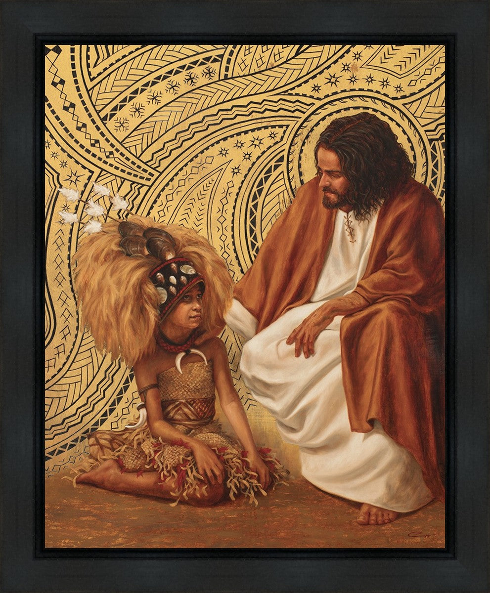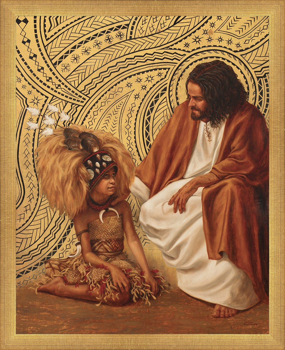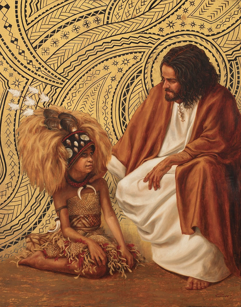 All of us hold within us the spark of royal divinity. This piece utilizes traditional Samoan imagery to communicate this. The young girl sitting at Christ's feet wears the attire of a taupou, signifying her royal rank and role in sharing and perpetuating culture. The designs, which were originally carved into the background, are taken from the age old tradition of ceremonial tatau (tattoos) and each symbolizes an aspect of royalty, pursuit of righteousness, divine protection, spiritual guidance, and sacrifice