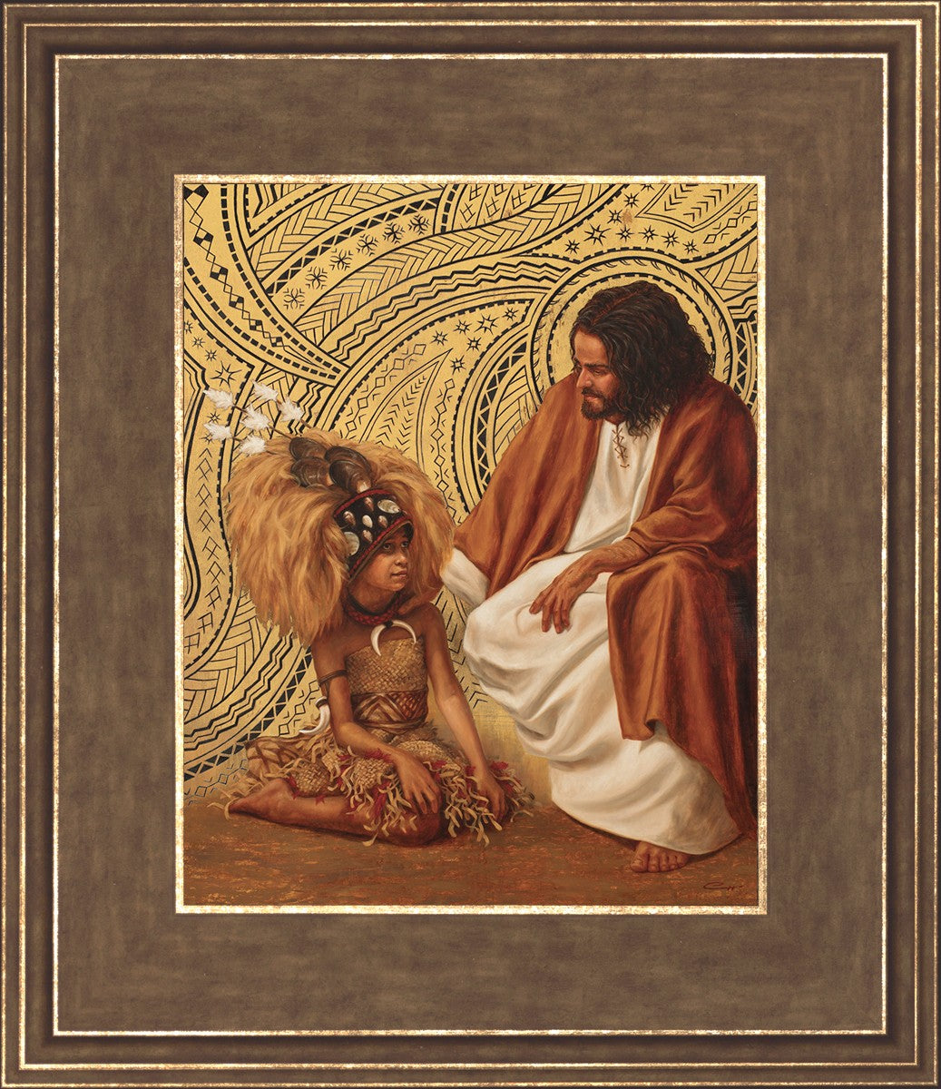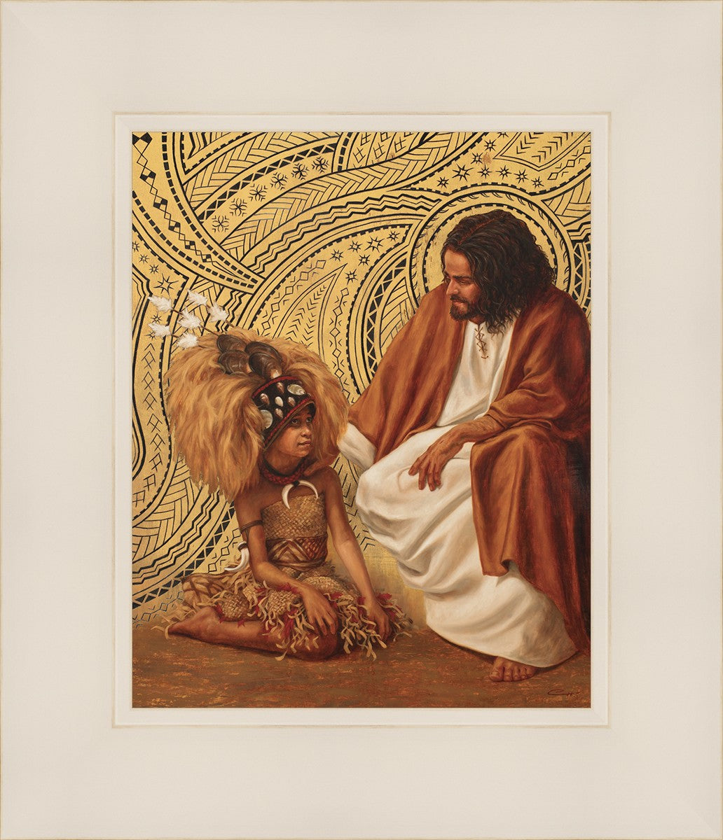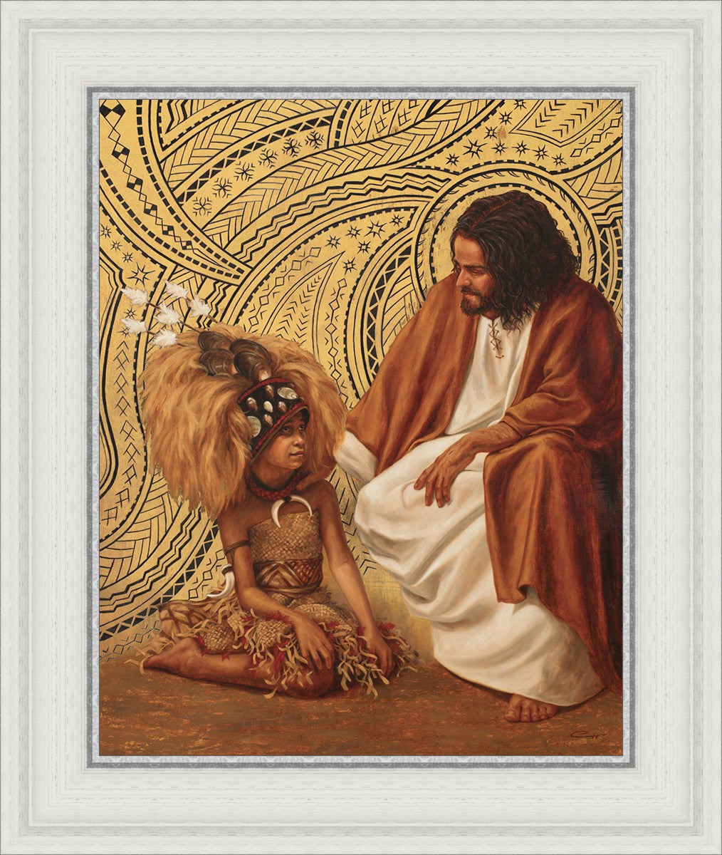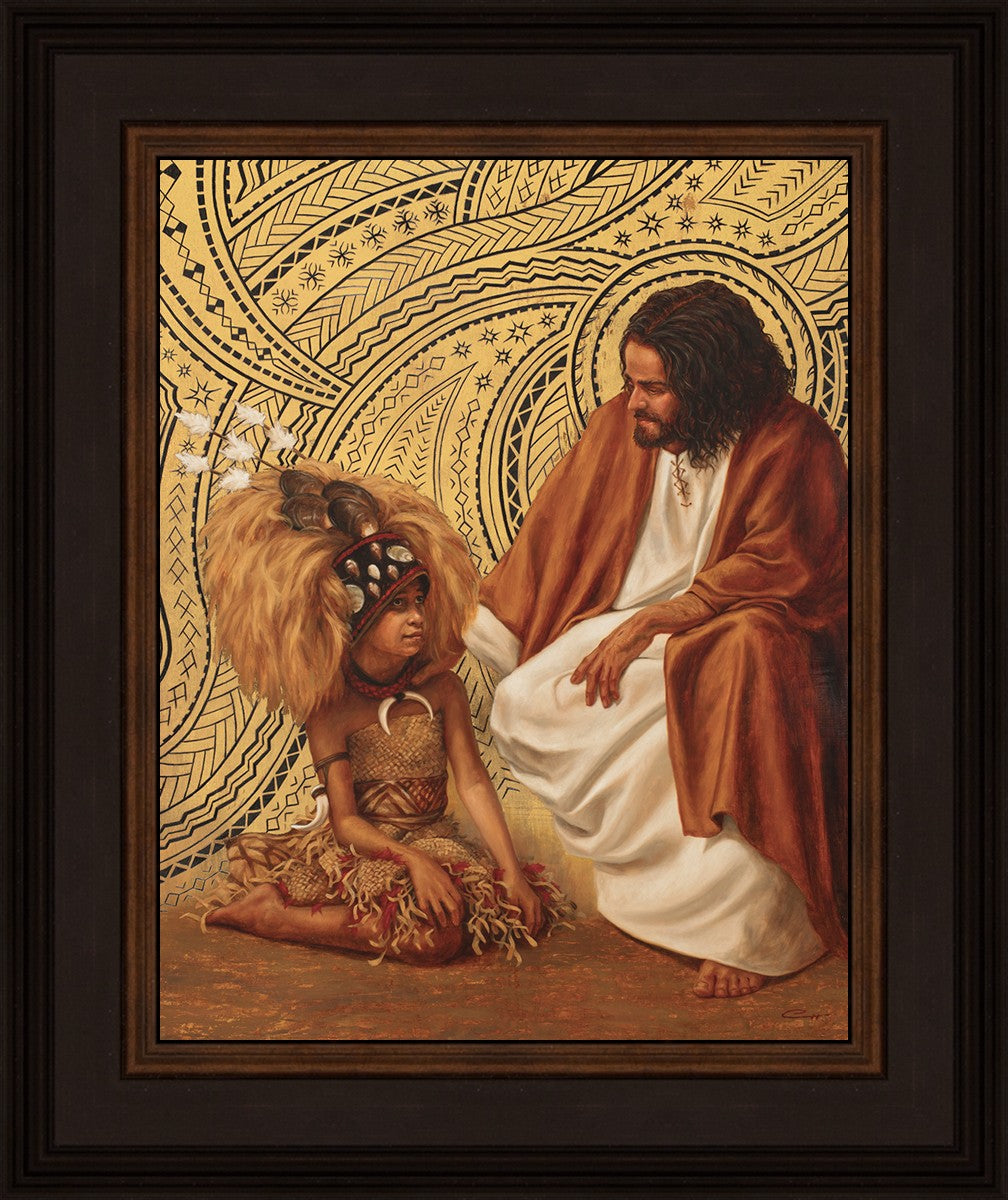 All of us hold within us the spark of royal divinity. This piece utilizes traditional Samoan imagery to communicate this. The young girl sitting at Christ's feet wears the attire of a taupou, signifying her royal rank and role in sharing and perpetuating culture. The designs, which were originally carved into the background, are taken from the age old tradition of ceremonial tatau (tattoos) and each symbolizes an aspect of royalty, pursuit of righteousness, divine protection, spiritual guidance, and sacrifice
