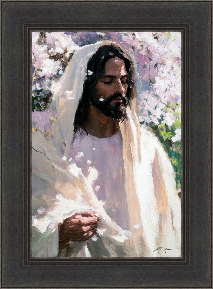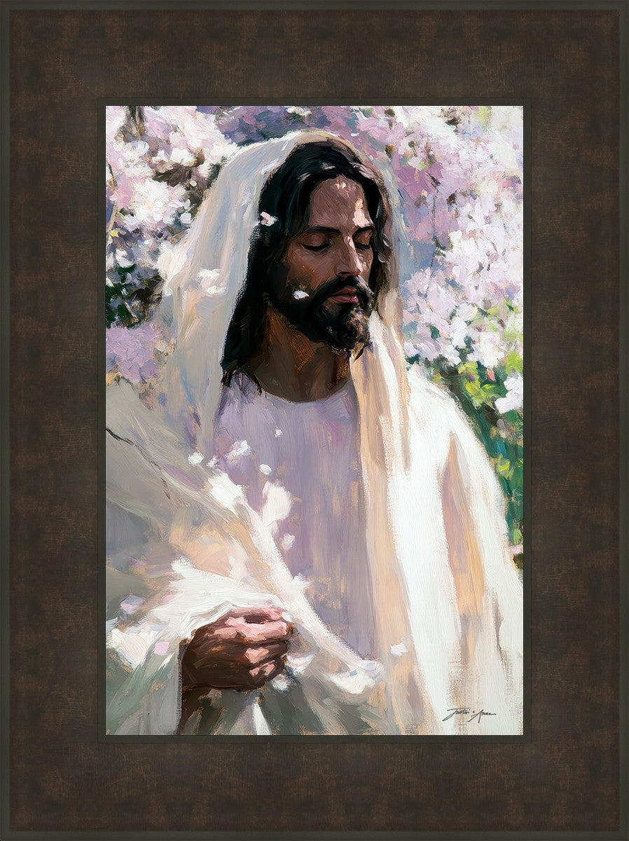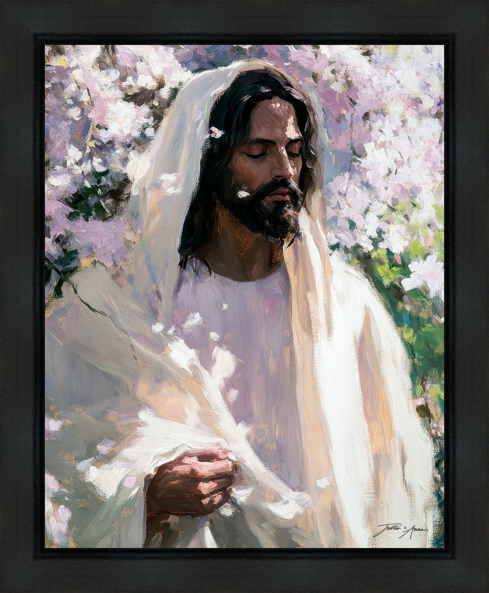 With this piece, we wanted to create more than an image—we wanted to capture a setting you can truly feel: the warmth of sunlight on your skin, the sound of a gentle breeze in the trees, and the soft fragrance of blossoms. The Savior often invites His followers to “be still,” and in that stillness, we can find peace in simply abiding with Him.
