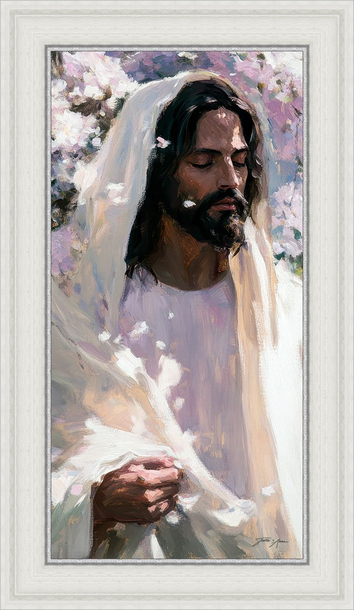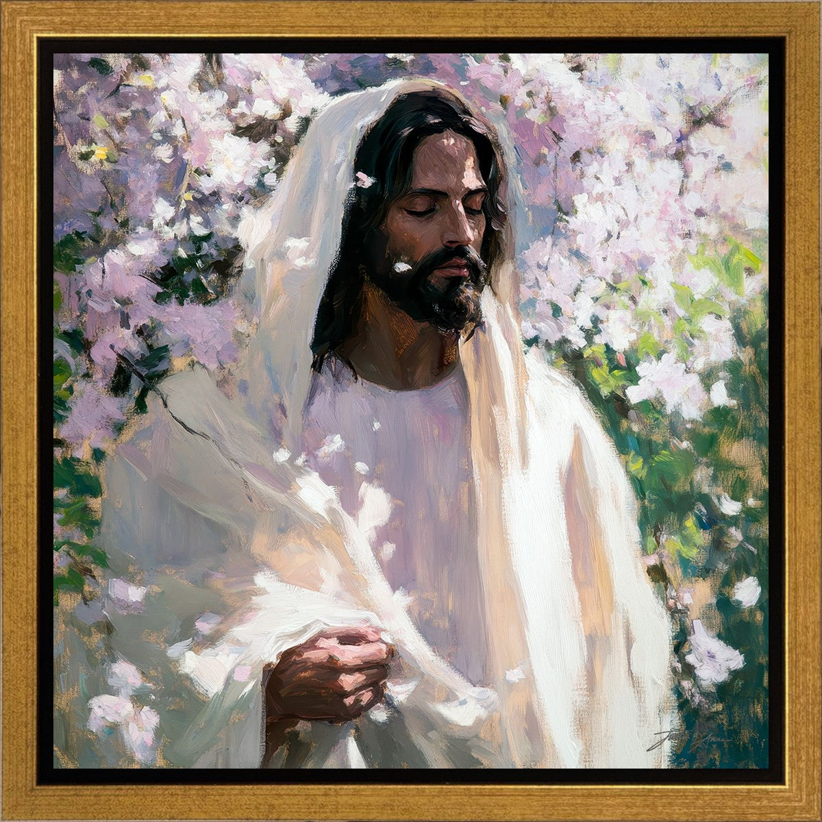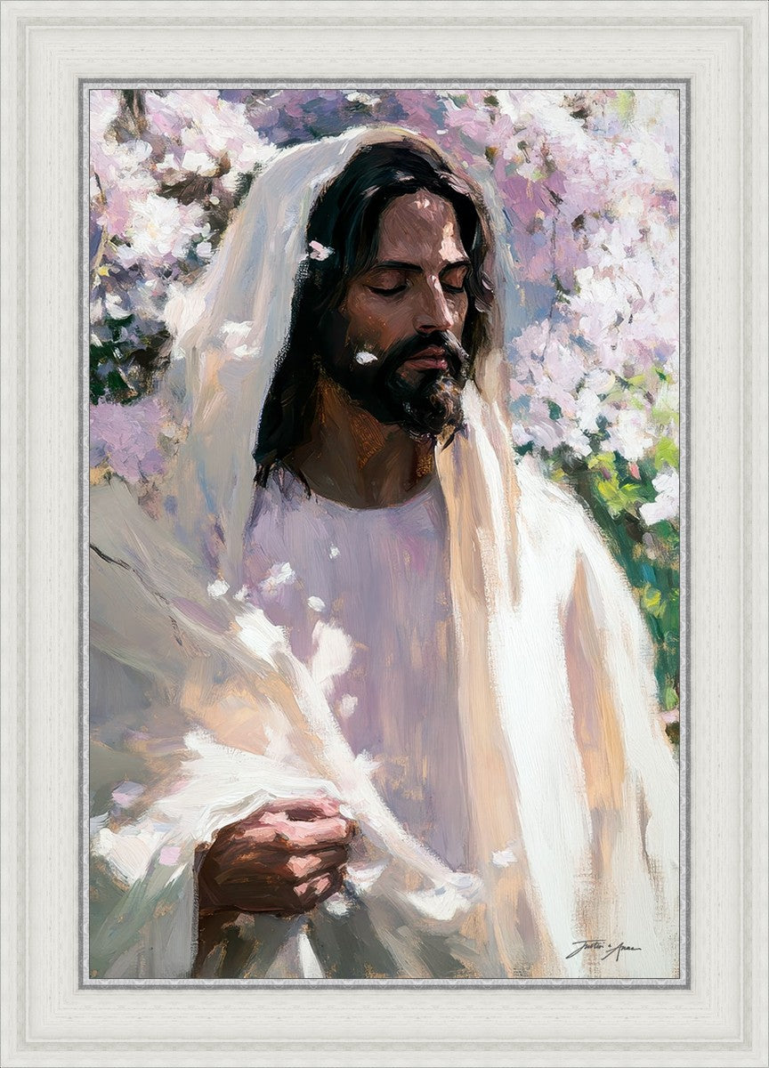With this piece, we wanted to create more than an image—we wanted to capture a setting you can truly feel: the warmth of sunlight on your skin, the sound of a gentle breeze in the trees, and the soft fragrance of blossoms. The Savior often invites His followers to “be still,” and in that stillness, we can find peace in simply abiding with Him.