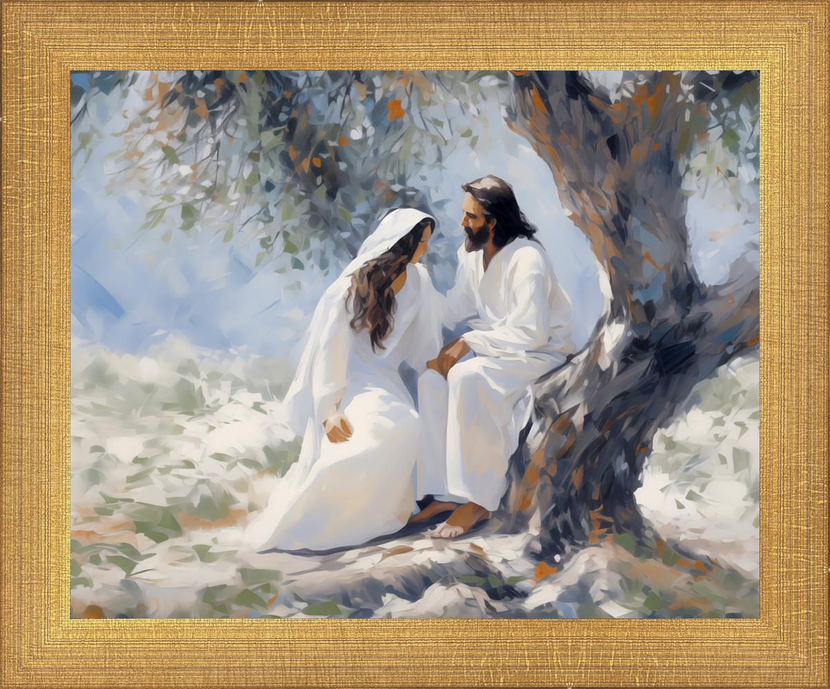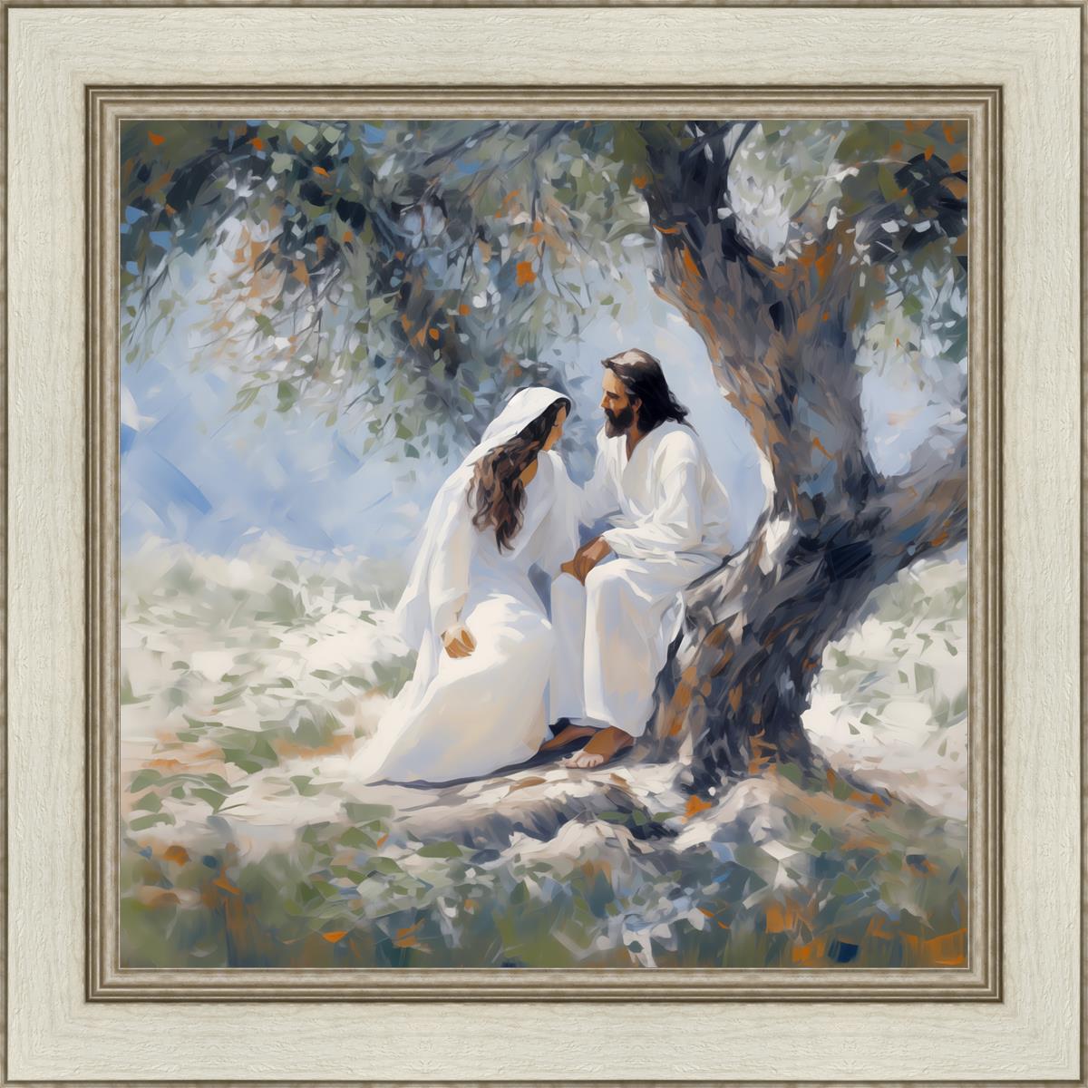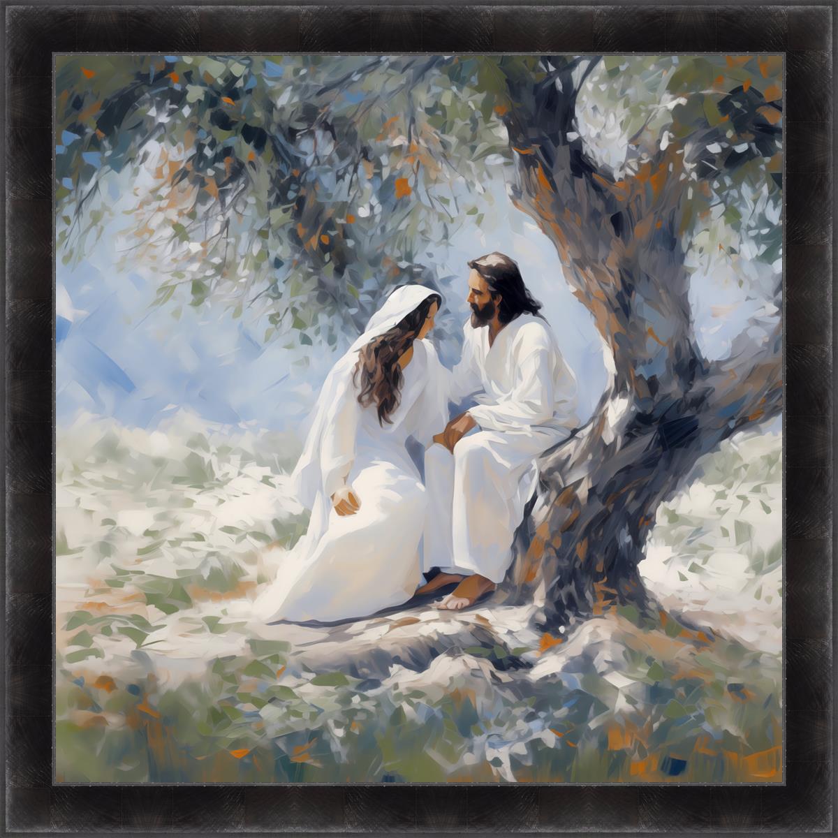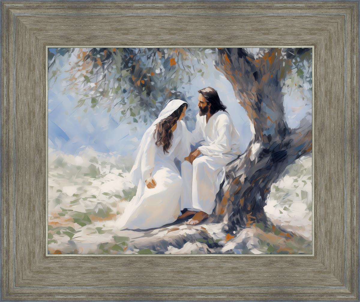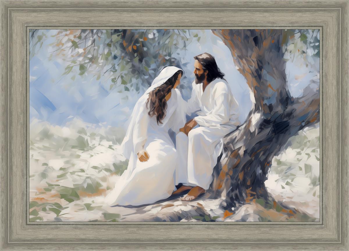 In this image, I wanted to depict Christ in the Garden with a woman, any woman, who would accept his sacrifice. It could be Mary Magdalene or it could be you. I believe that the image of those who would accept his message strengthened him as he bore our afflictions and carried our burdens.