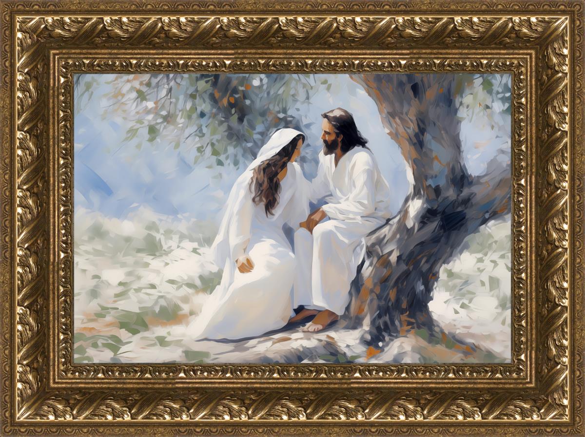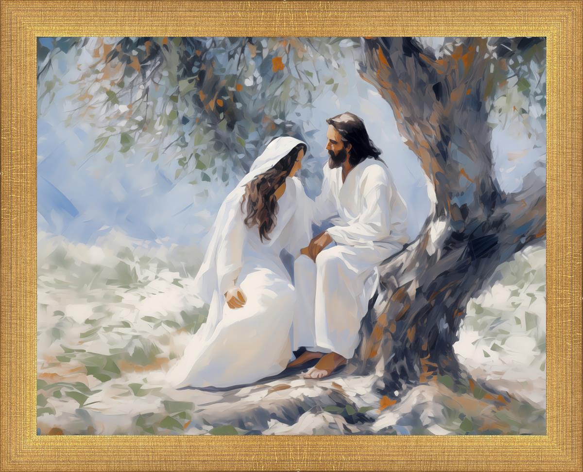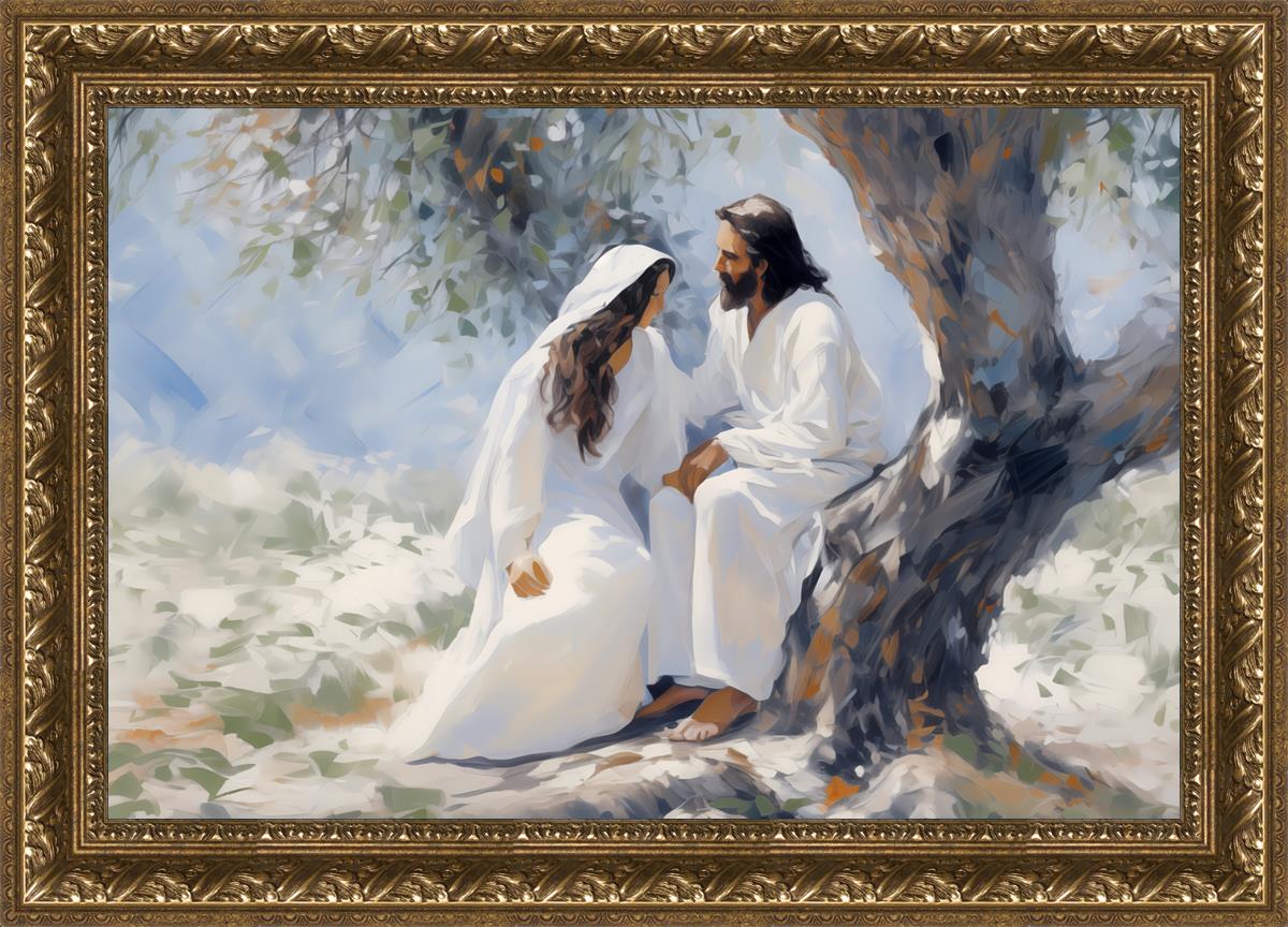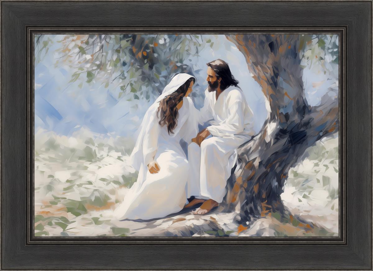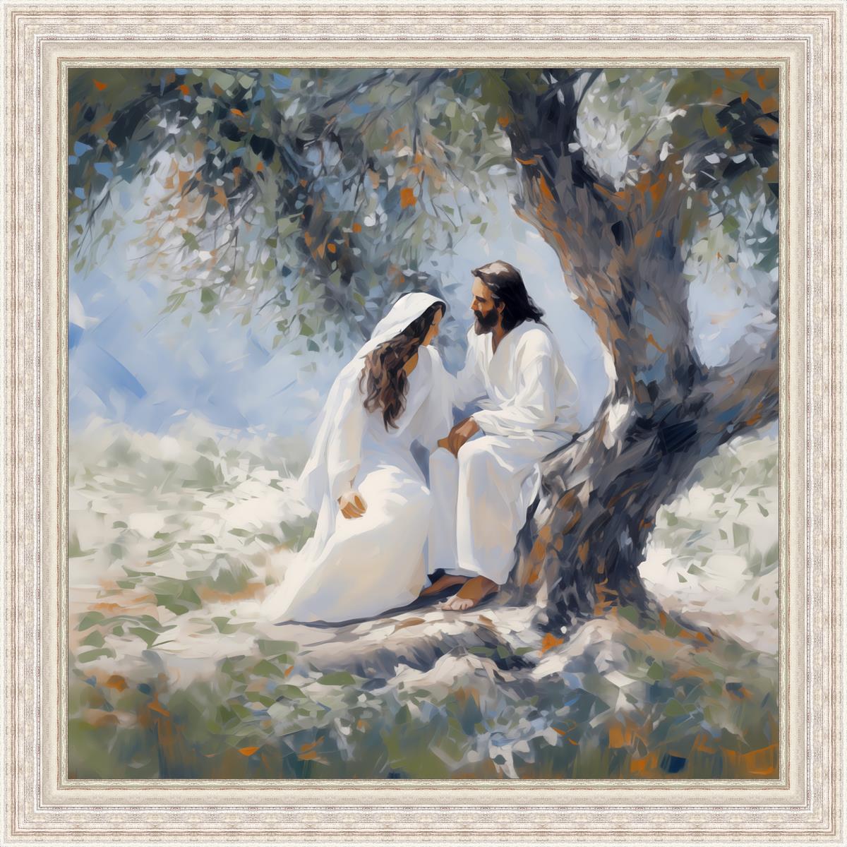 In this image, I wanted to depict Christ in the Garden with a woman, any woman, who would accept his sacrifice. It could be Mary Magdalene or it could be you. I believe that the image of those who would accept his message strengthened him as he bore our afflictions and carried our burdens.