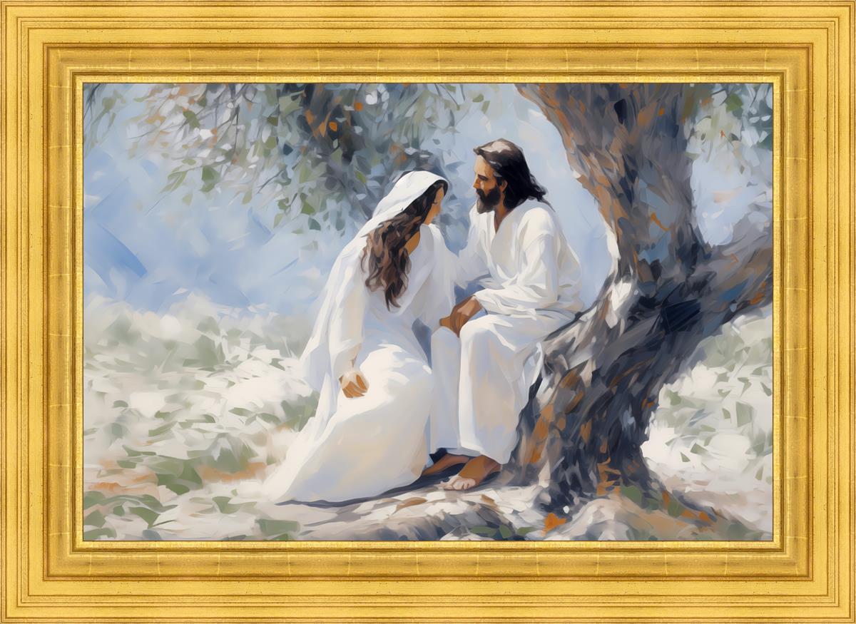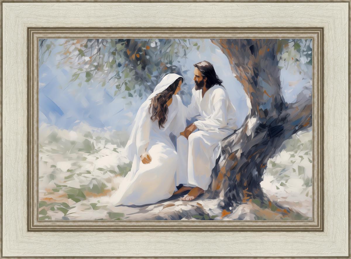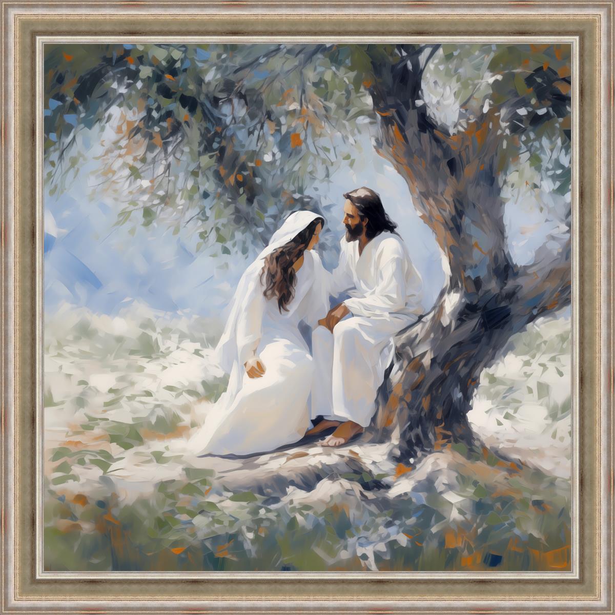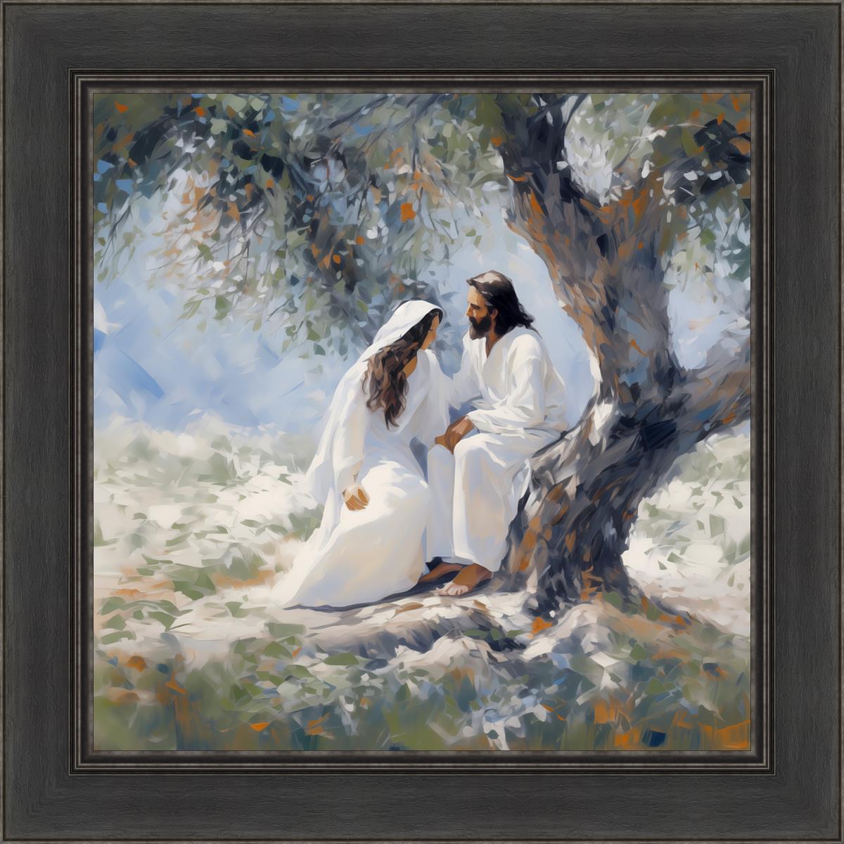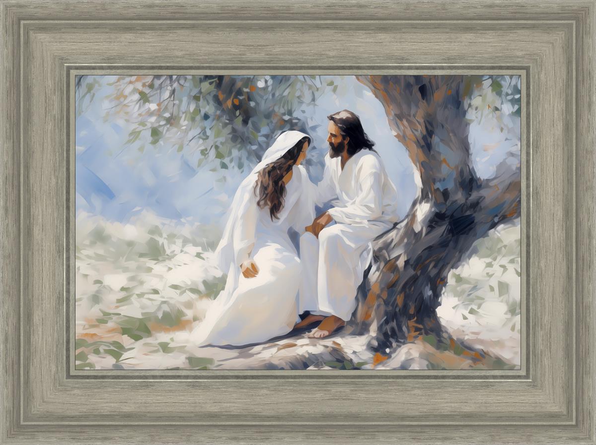 In this image, I wanted to depict Christ in the Garden with a woman, any woman, who would accept his sacrifice. It could be Mary Magdalene or it could be you. I believe that the image of those who would accept his message strengthened him as he bore our afflictions and carried our burdens.