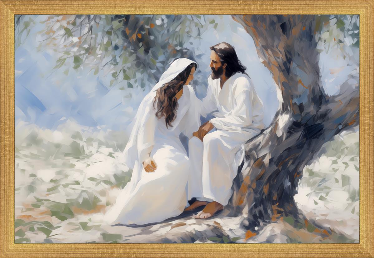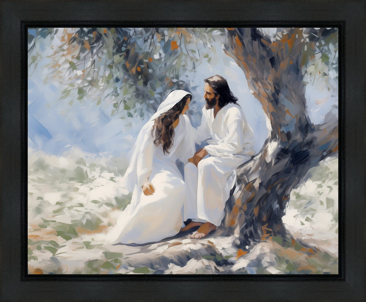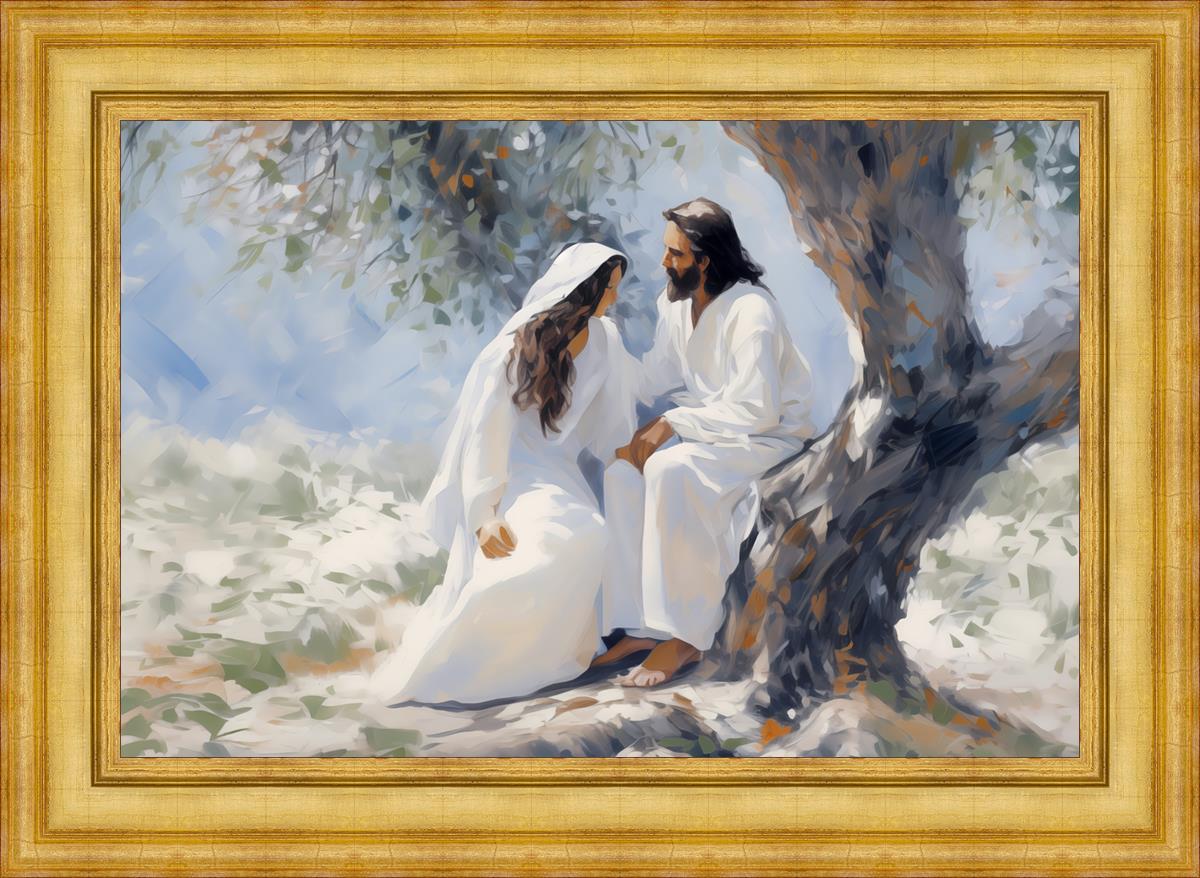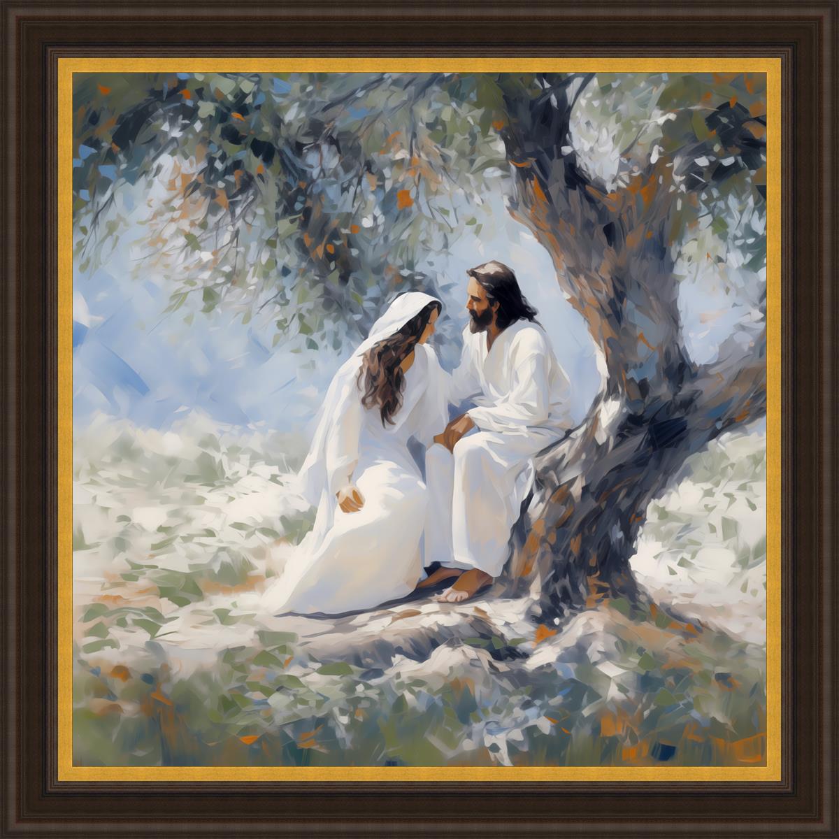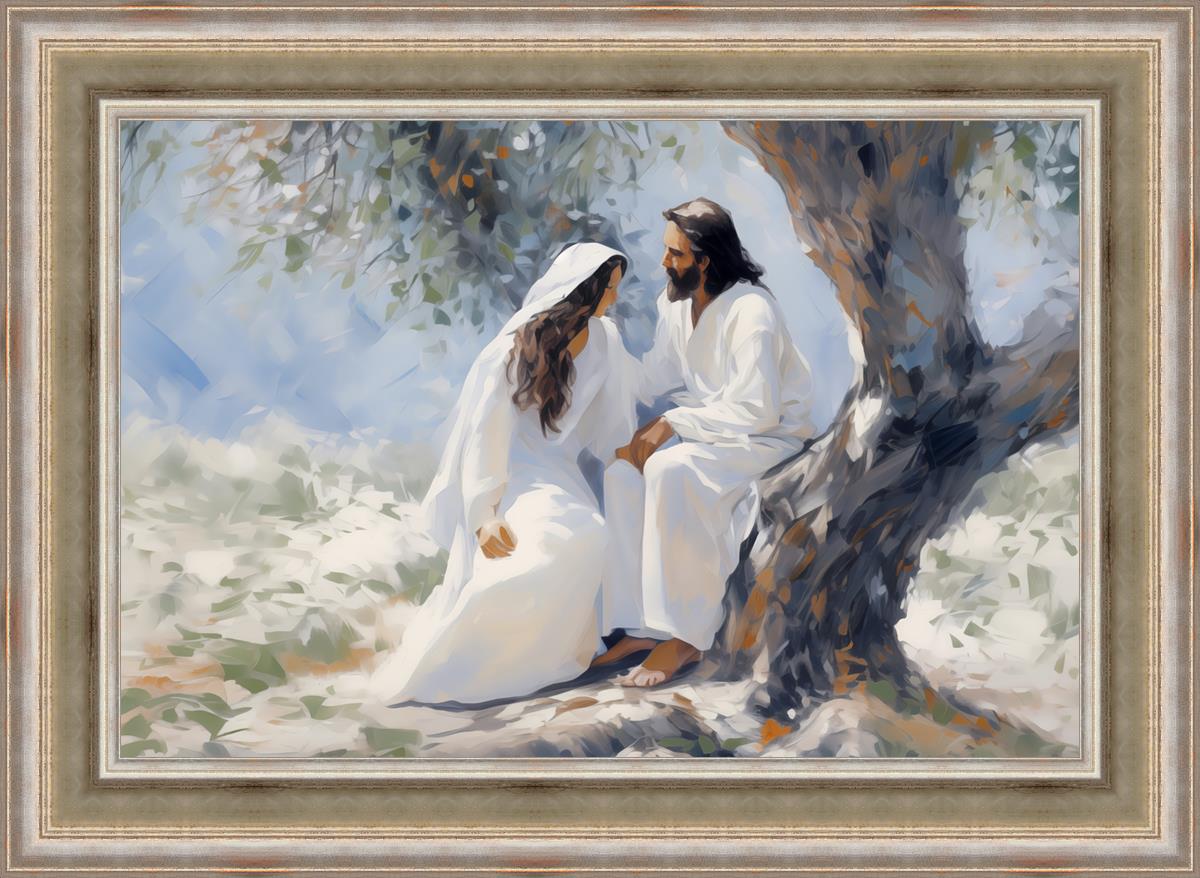 In this image, I wanted to depict Christ in the Garden with a woman, any woman, who would accept his sacrifice. It could be Mary Magdalene or it could be you. I believe that the image of those who would accept his message strengthened him as he bore our afflictions and carried our burdens.