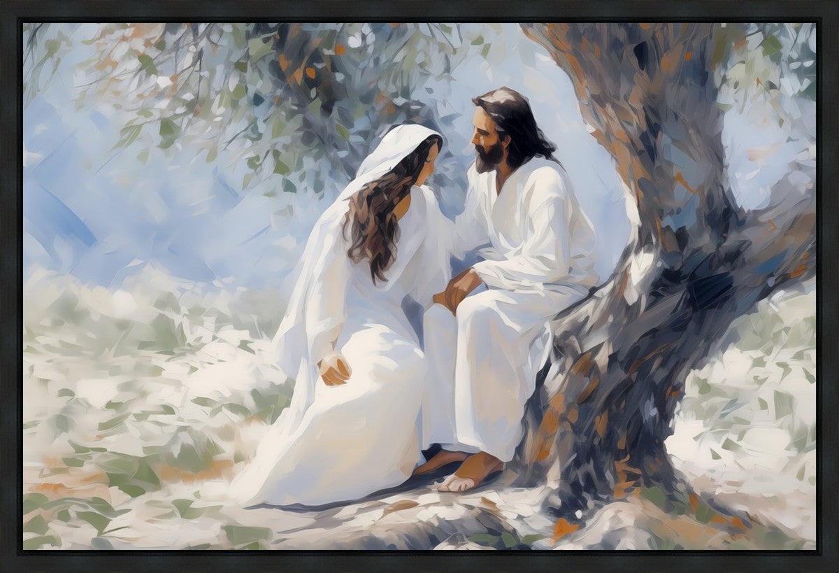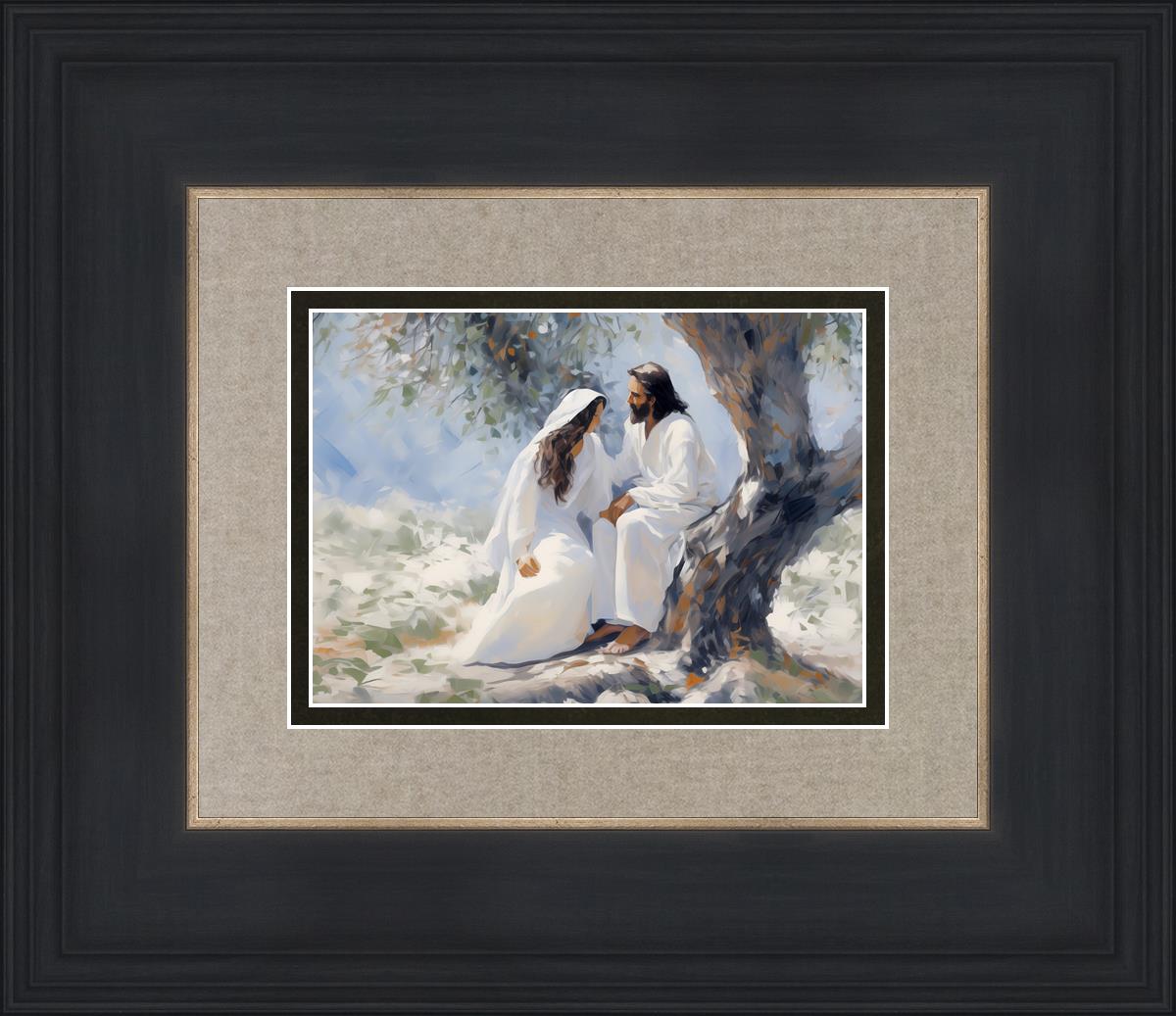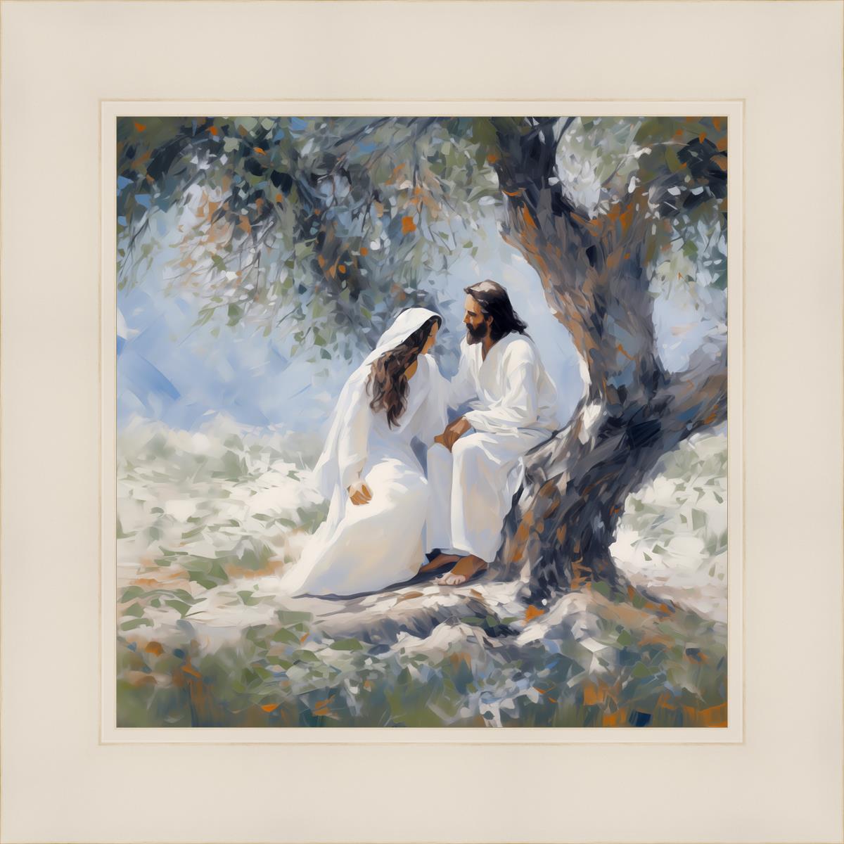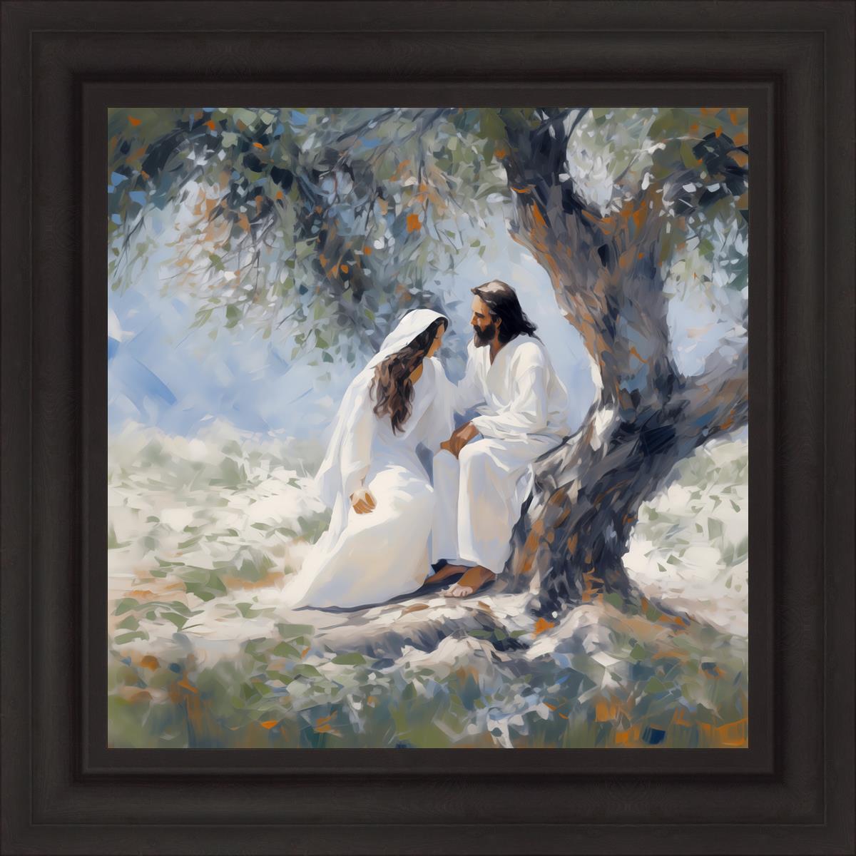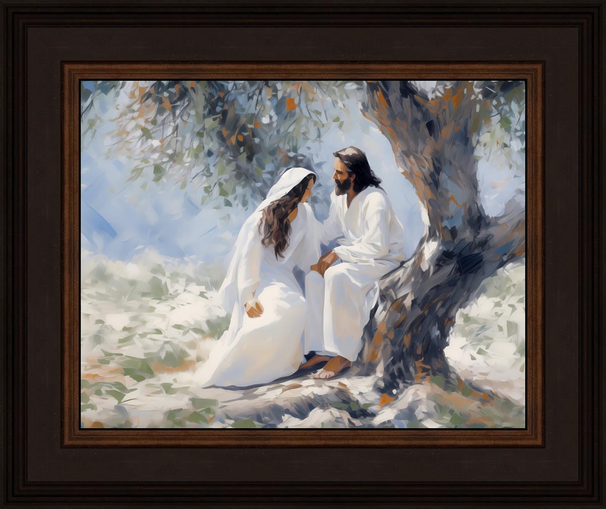In this image, I wanted to depict Christ in the Garden with a woman, any woman, who would accept his sacrifice. It could be Mary Magdalene or it could be you. I believe that the image of those who would accept his message strengthened him as he bore our afflictions and carried our burdens.