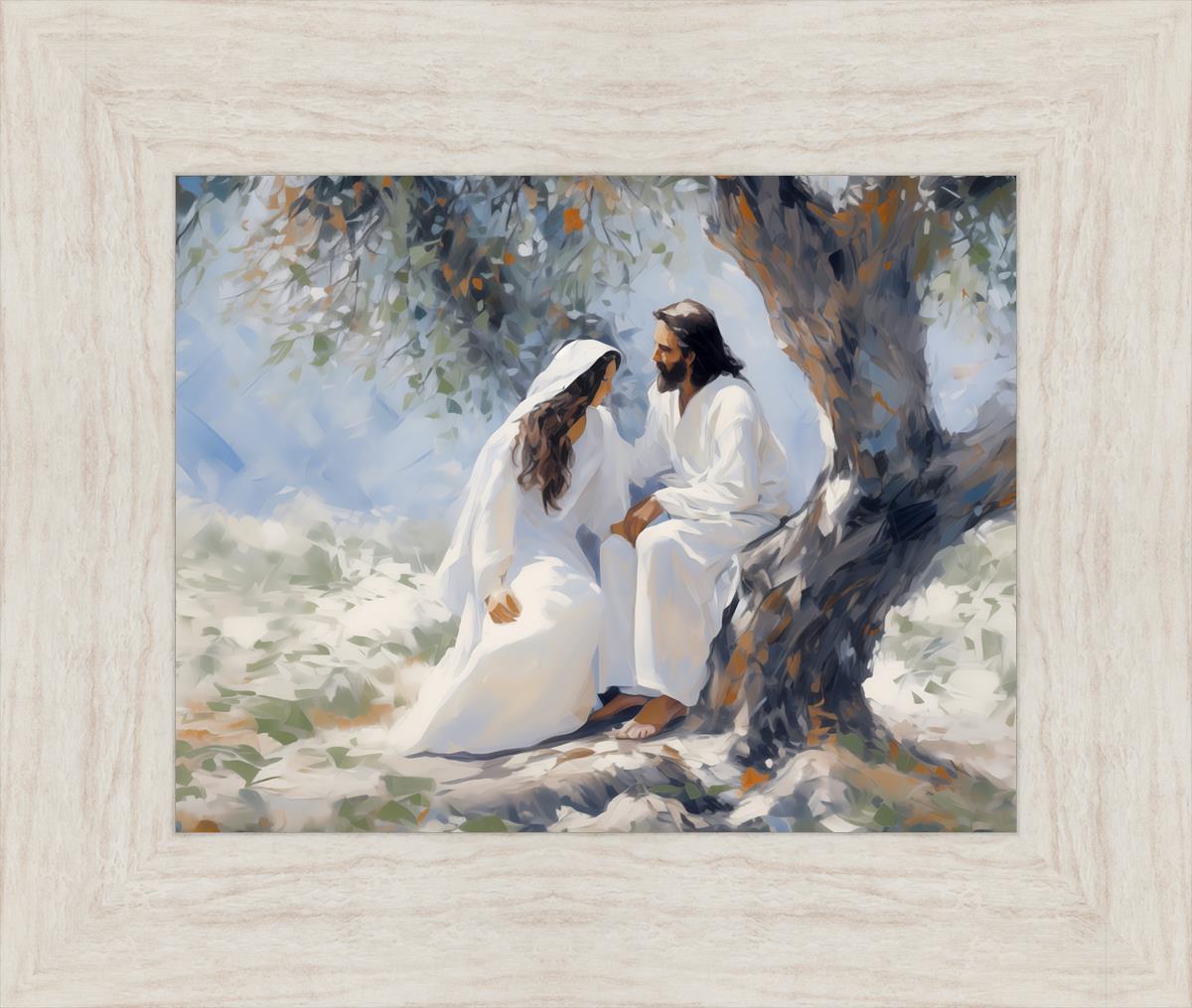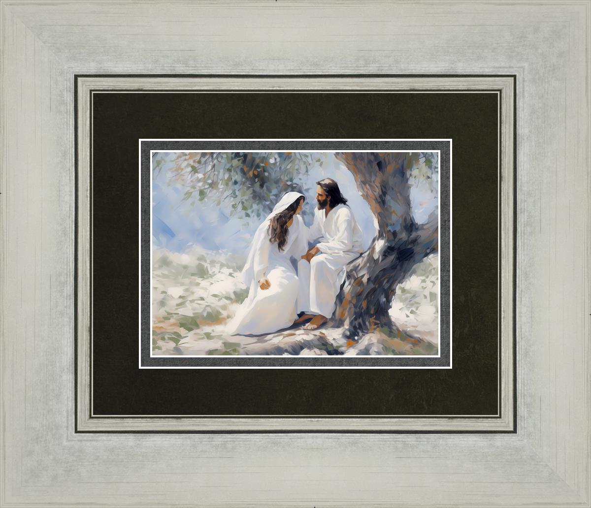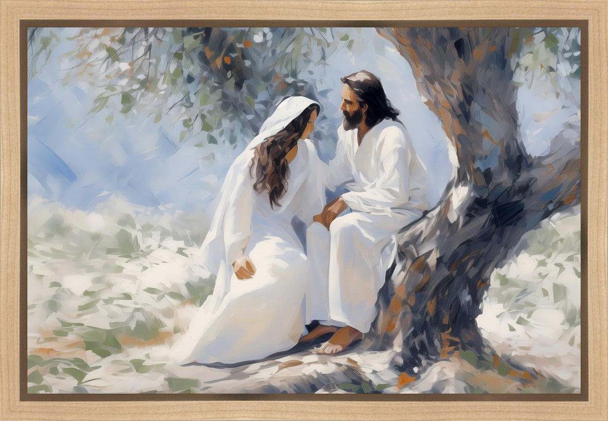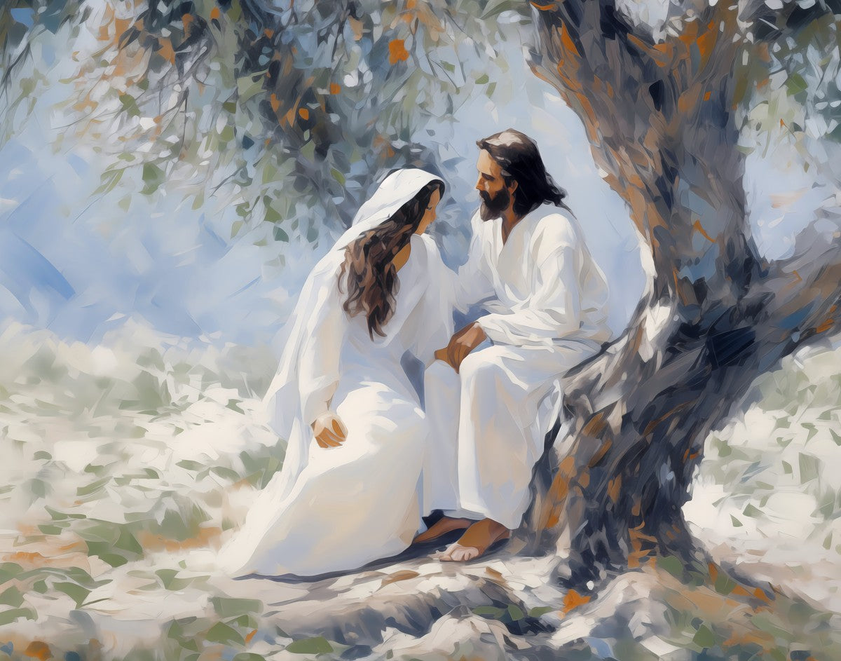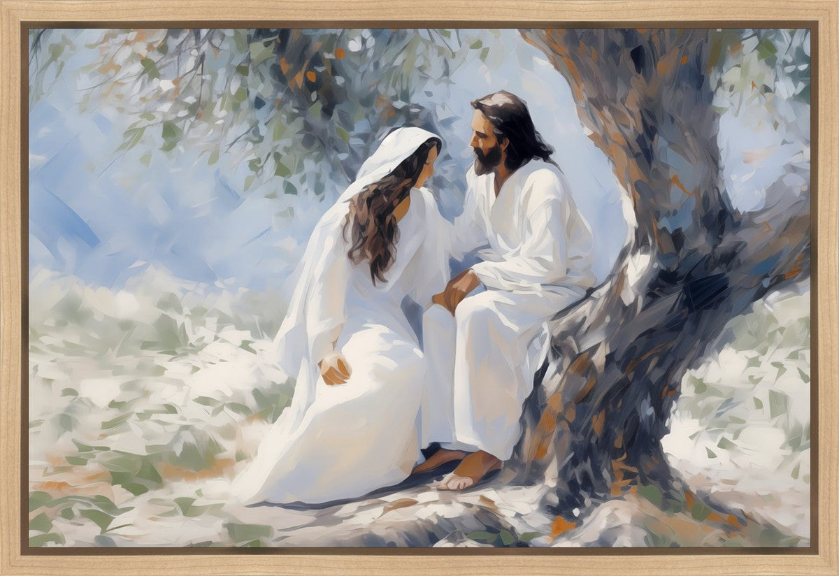 In this image, I wanted to depict Christ in the Garden with a woman, any woman, who would accept his sacrifice. It could be Mary Magdalene or it could be you. I believe that the image of those who would accept his message strengthened him as he bore our afflictions and carried our burdens.