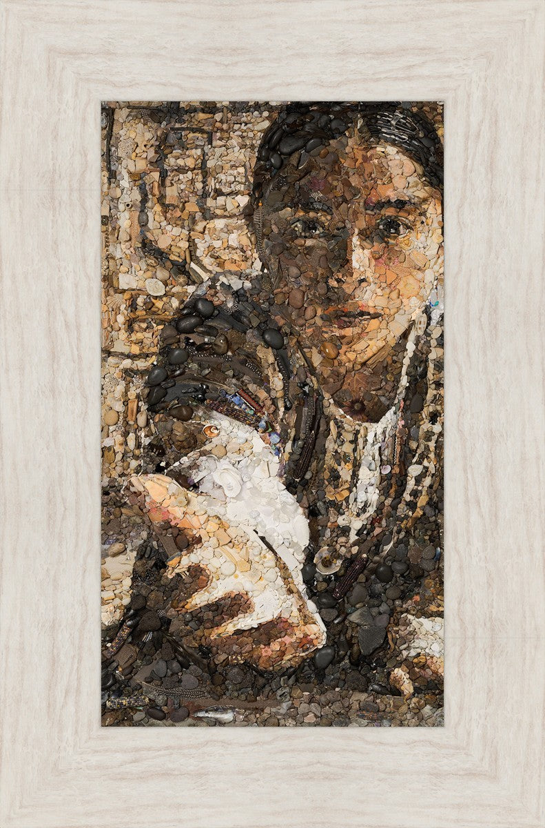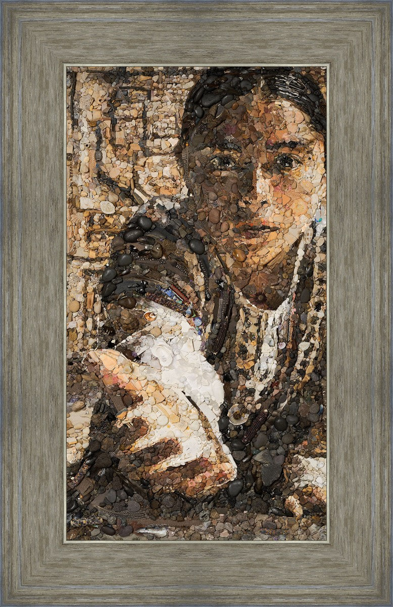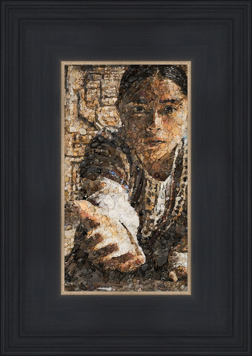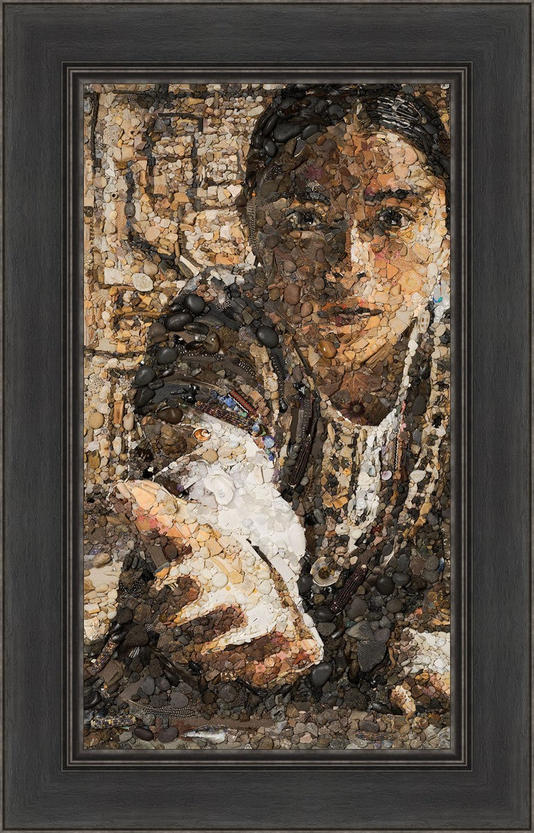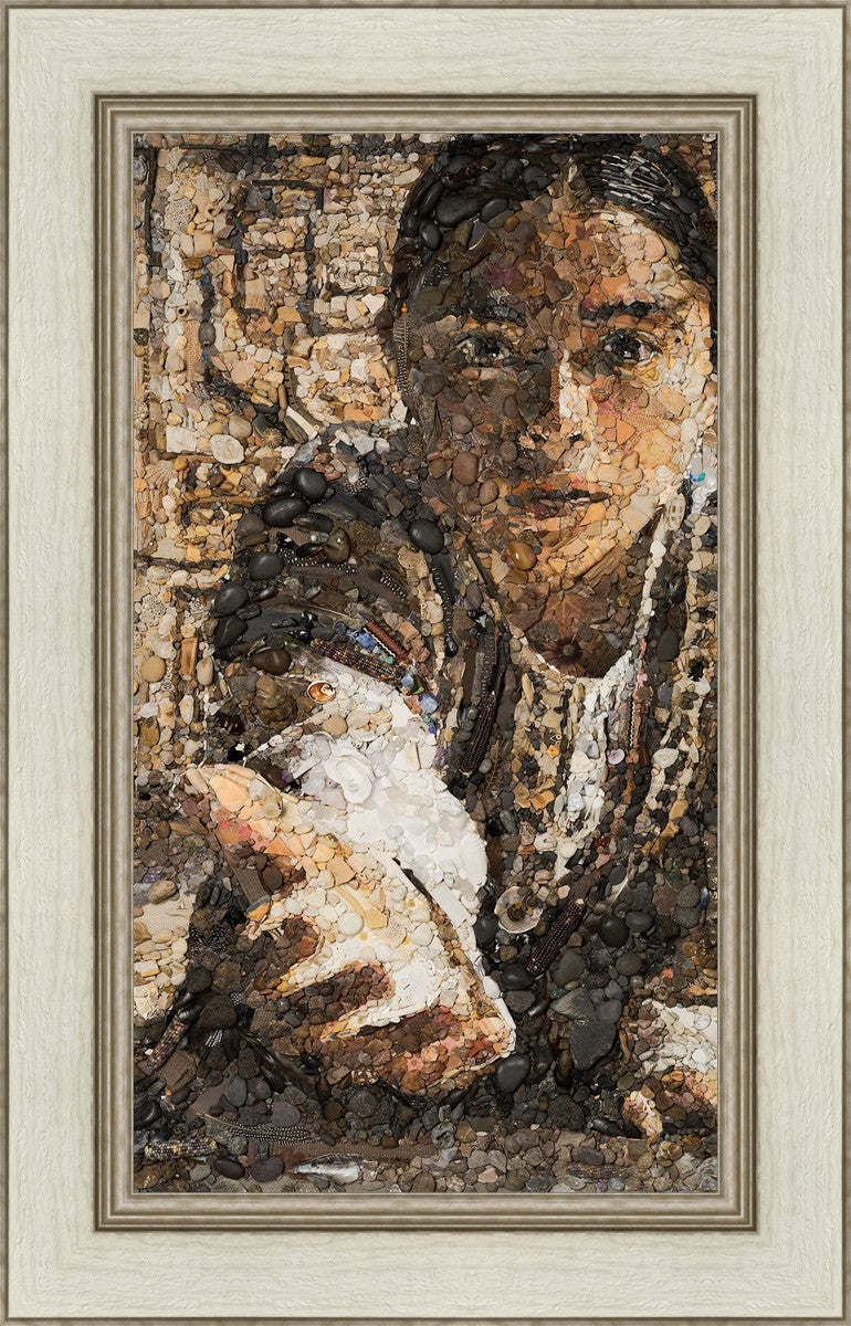 The queen of the Lamanites is overcome by the Spirit and falls to the ground. Abish, a Book of Mormon character who nurtured a secret faith, sees an opportunity to lift the queen and to testify to the many around her. After gathering a crowd of neighbors, Abish reached out to the queen, lifting her to consciousness and witnessing a higher way to the gathered crowd. The viewer becomes the queen, newly awakened to Abish as she reaches out to lift.