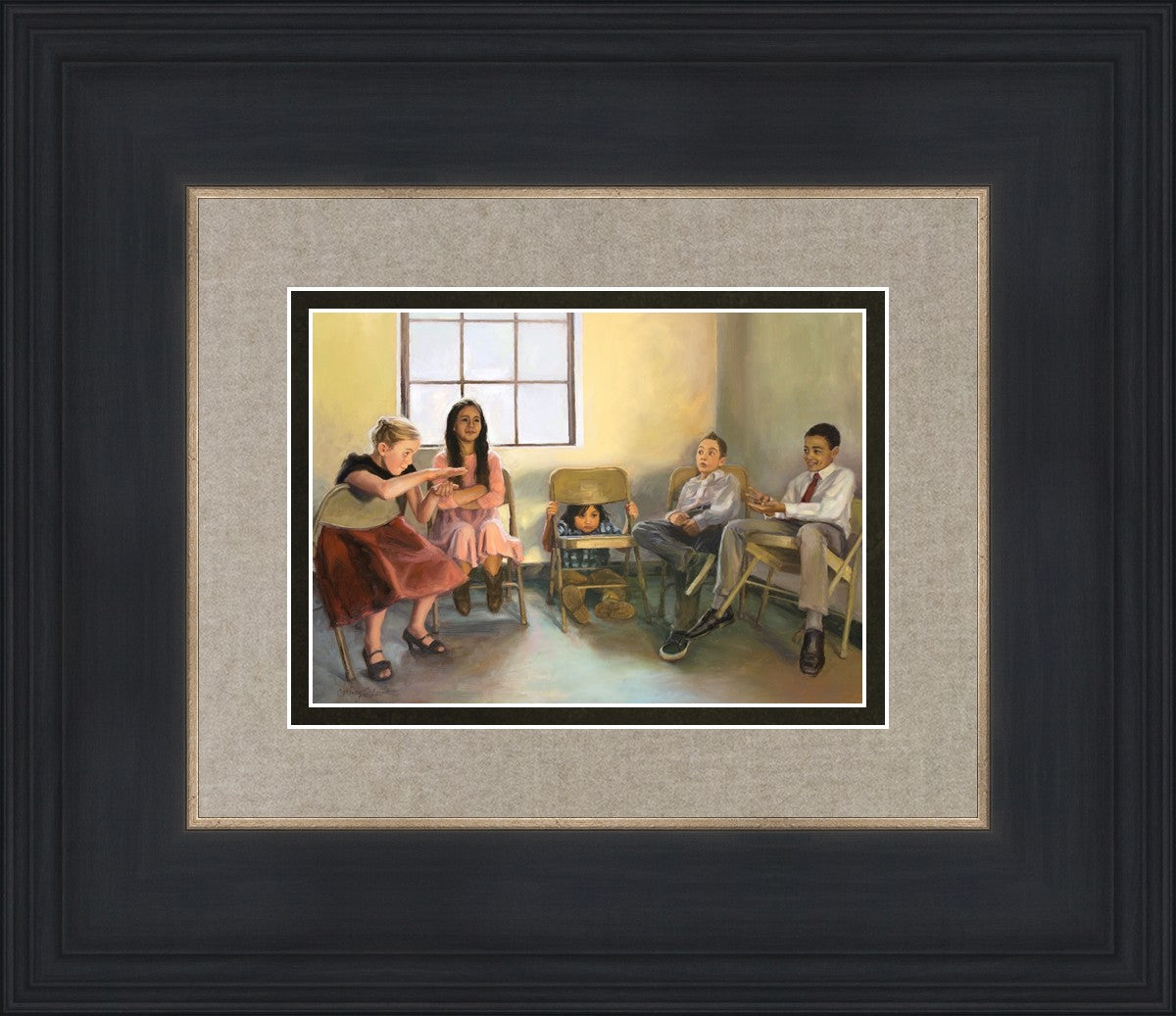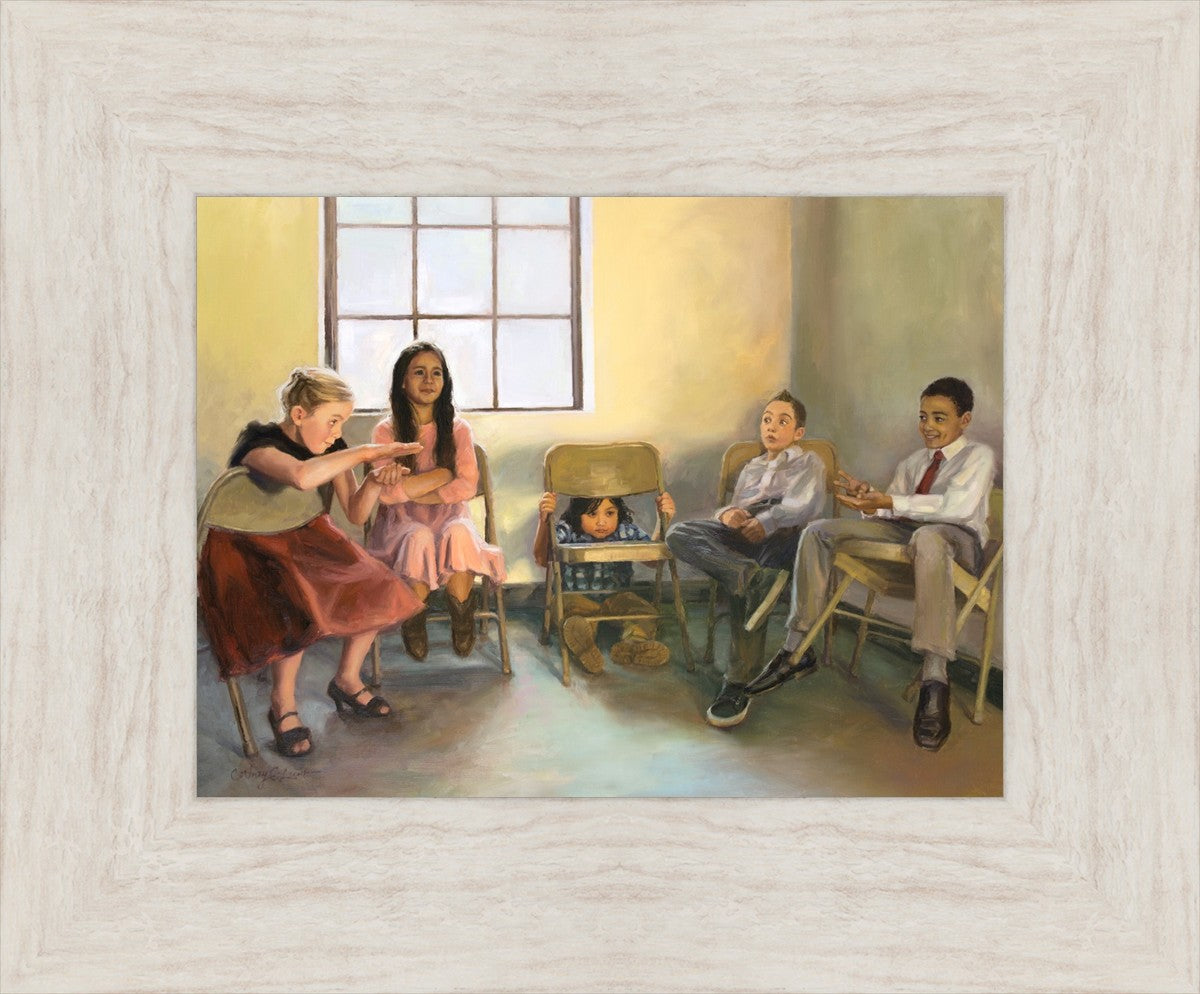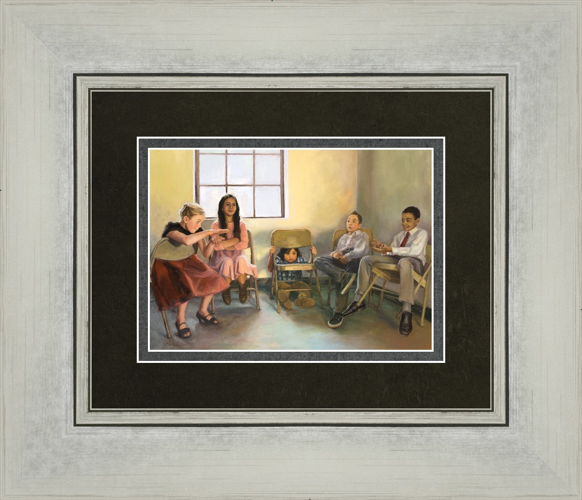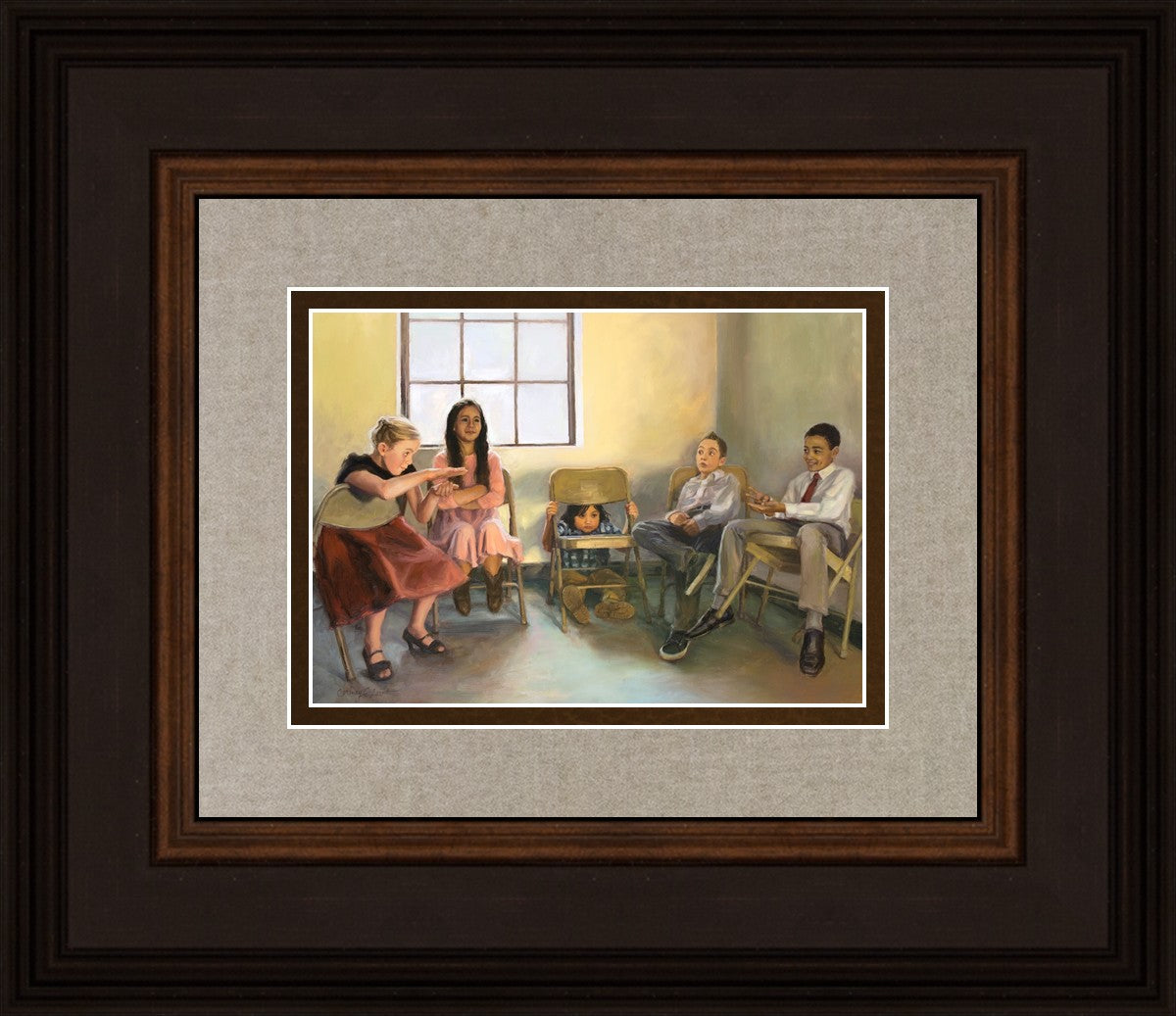 Several years ago I was substituting in primary in church and as I watched the children be children I received the idea for this painting. I noticed that most kids have a really hard time being reverent...occasionally there are a few that are, but God loves all of His children no matter how they behave! It was so fun to work with the children who were my little models. I really fed off of their energy. Each time I do a meaningful painting like this, it strengthens my testimony in the Gospel of Jesus Christ. I know that we are "All Children of God."