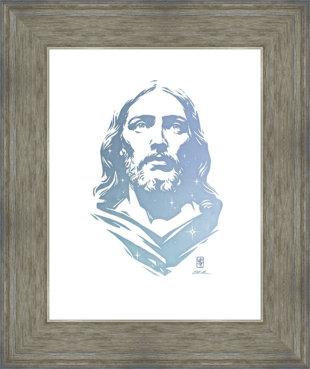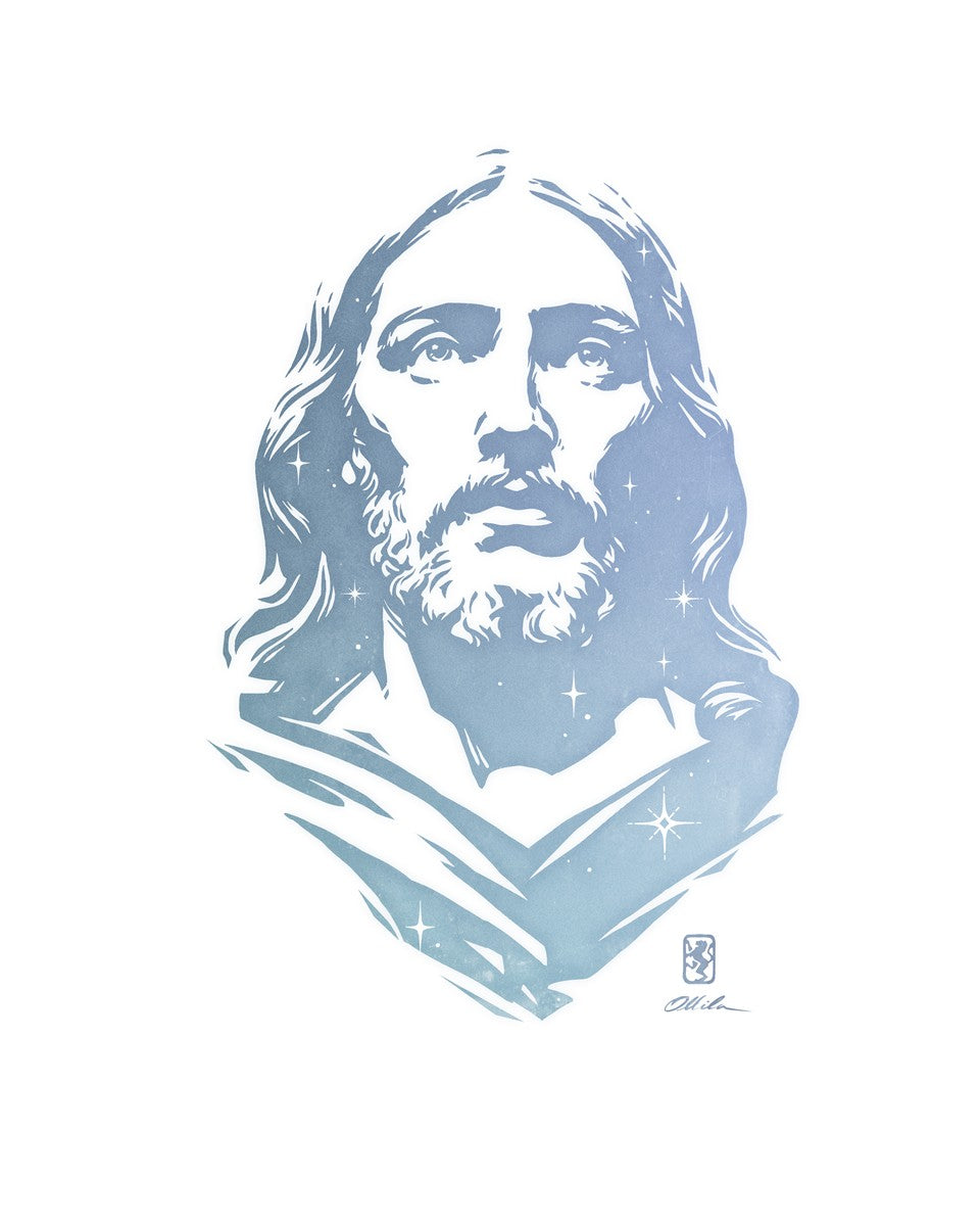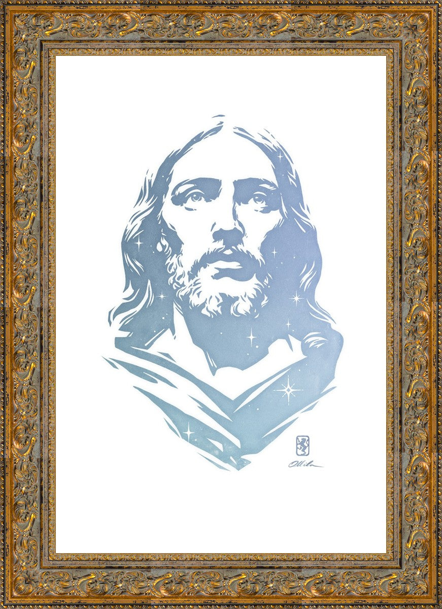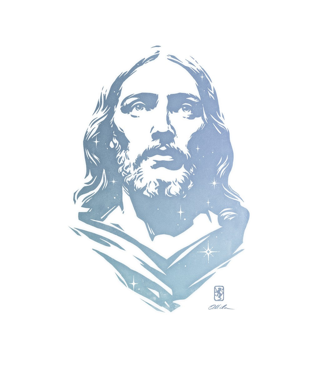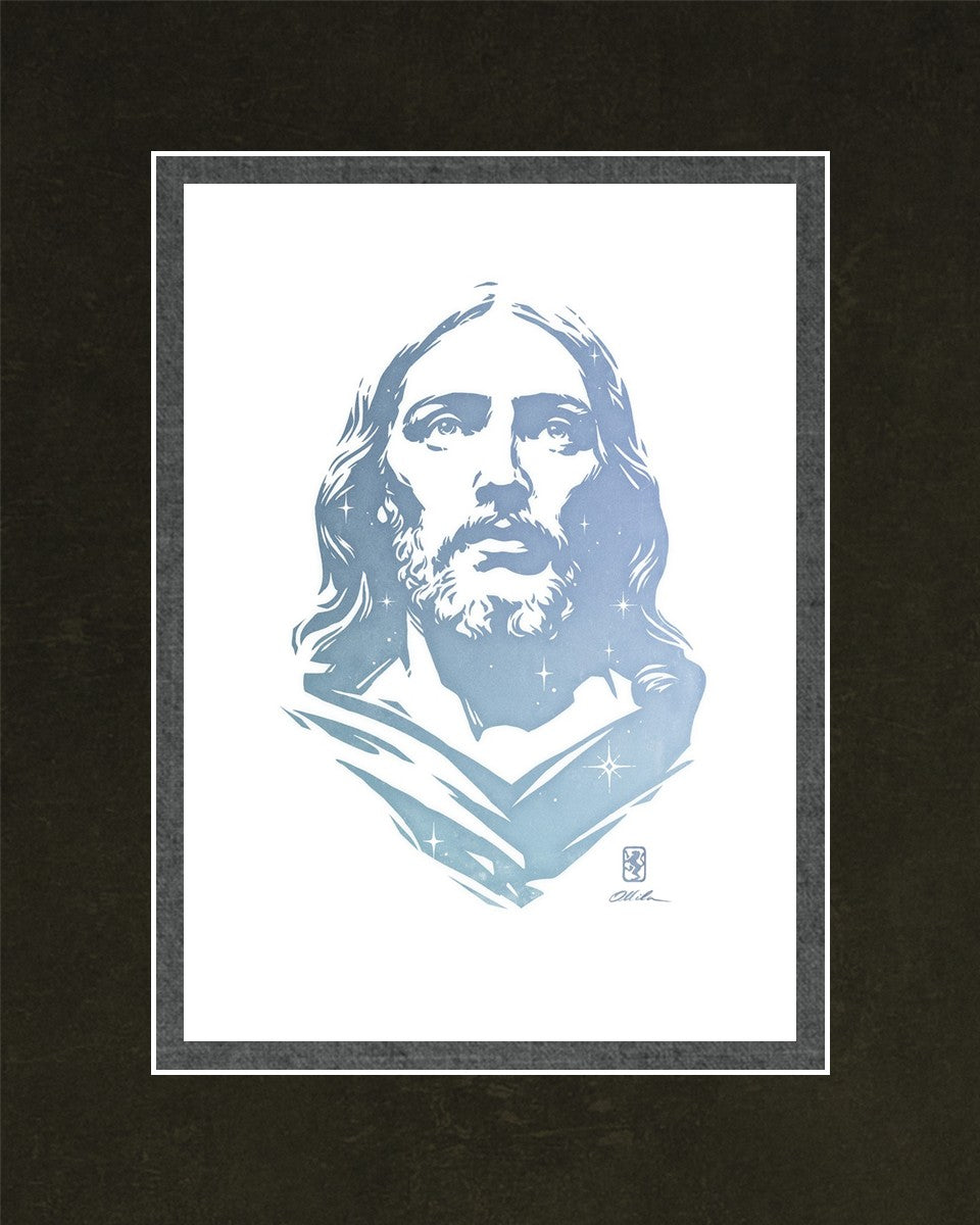 This is a hand carved woodcut relief print. The artist's goal in carving this piece was to create a simple likeness of Jesus that conveys his reach and influence to all corners of the universe as one of His titles implies, Alpha and Omega, the Beginning and the End.