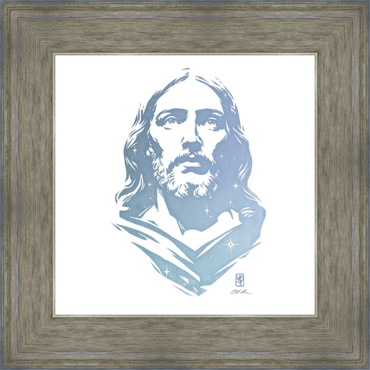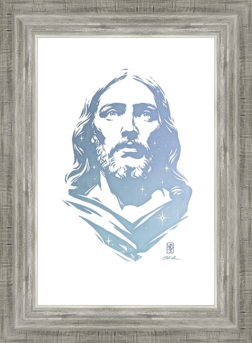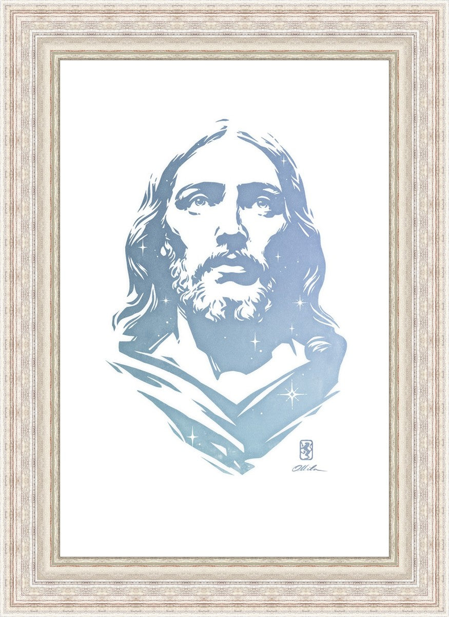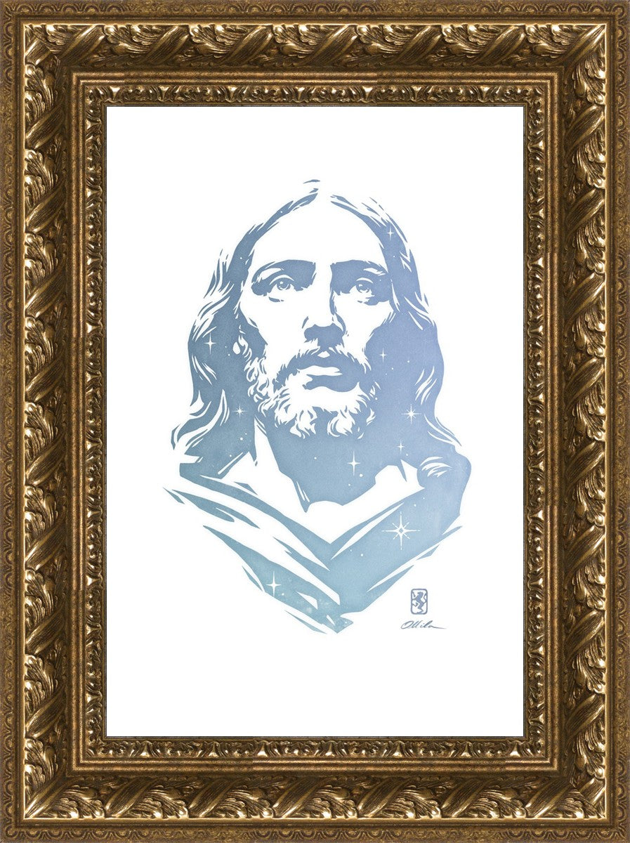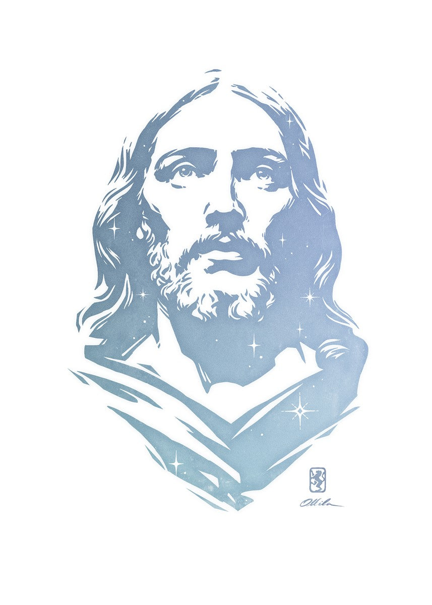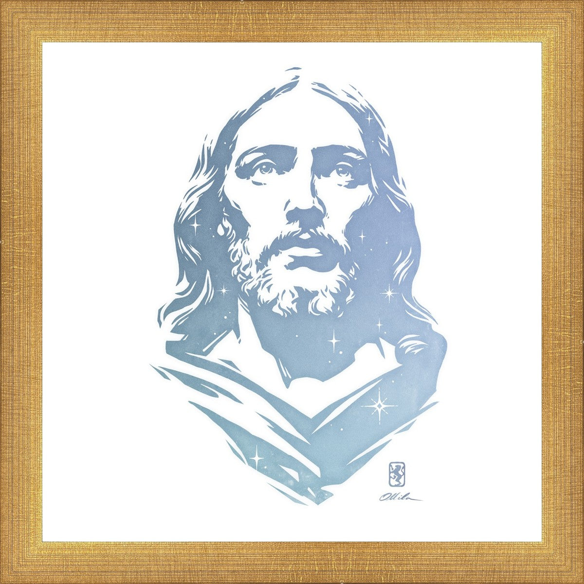This is a hand carved woodcut relief print. The artist's goal in carving this piece was to create a simple likeness of Jesus that conveys his reach and influence to all corners of the universe as one of His titles implies, Alpha and Omega, the Beginning and the End.