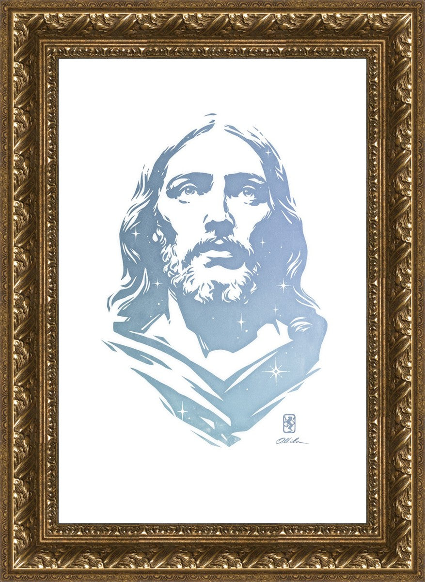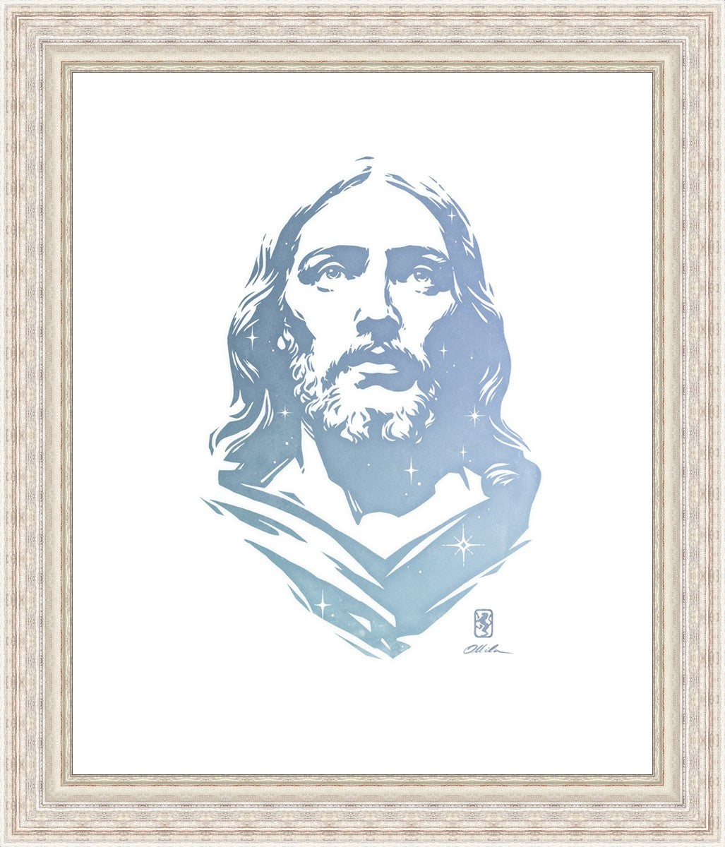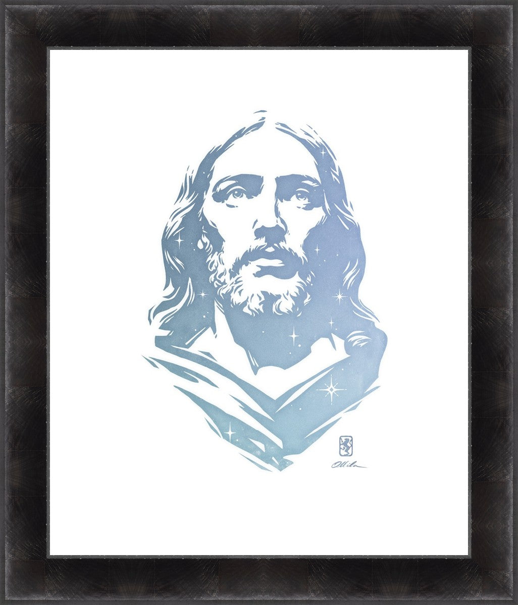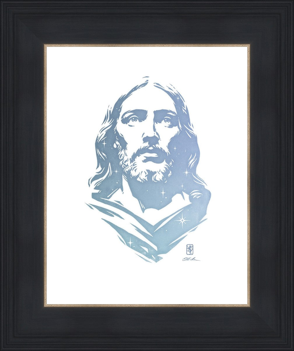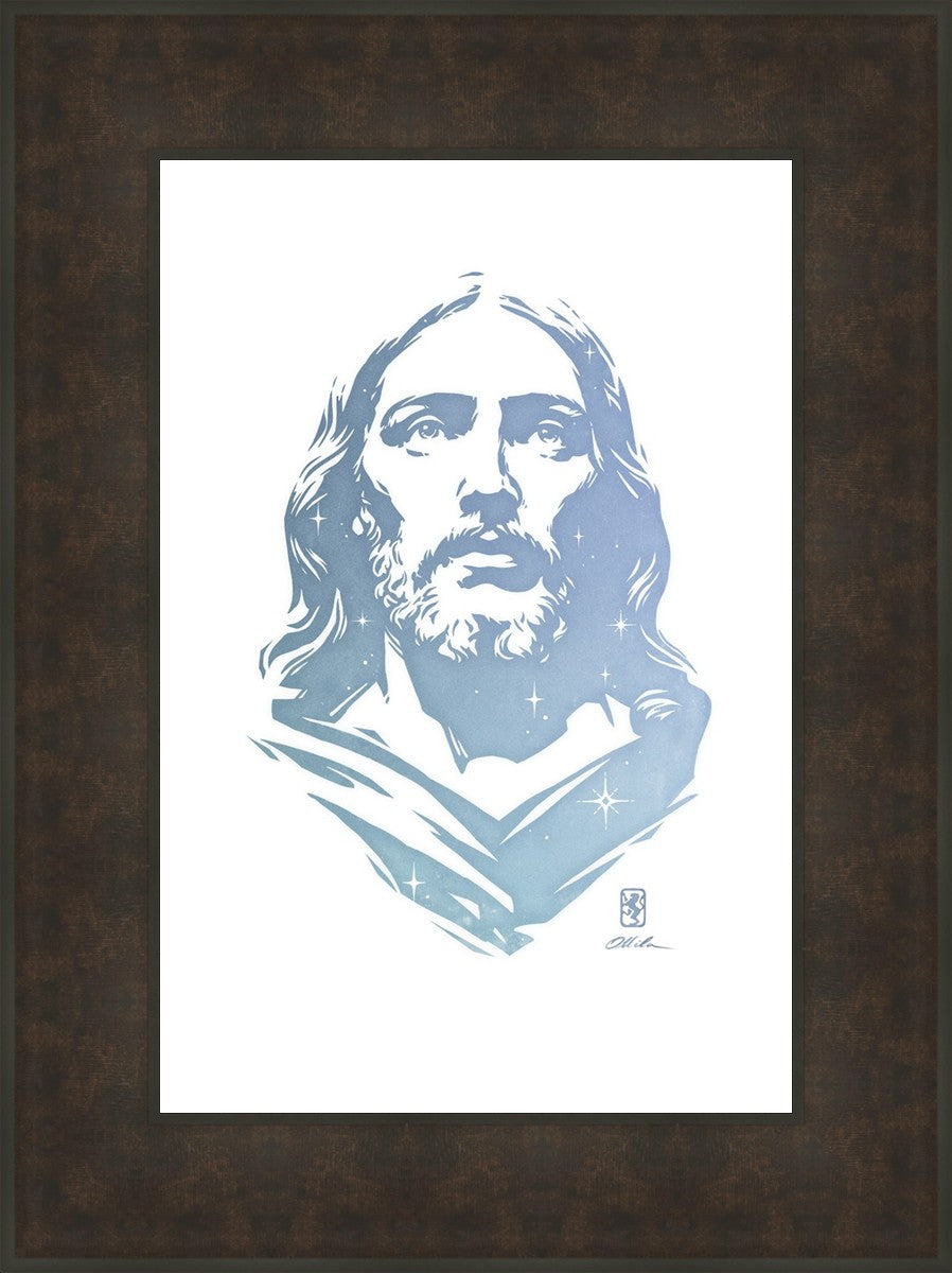 This is a hand carved woodcut relief print. The artist's goal in carving this piece was to create a simple likeness of Jesus that conveys his reach and influence to all corners of the universe as one of His titles implies, Alpha and Omega, the Beginning and the End.