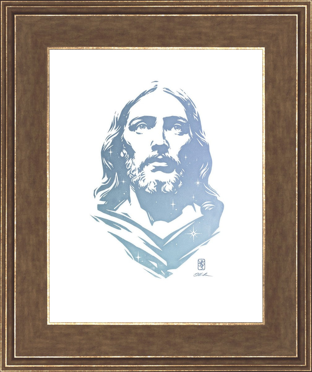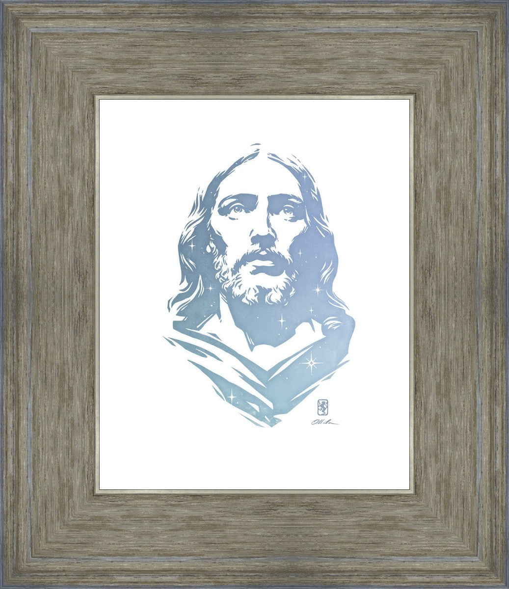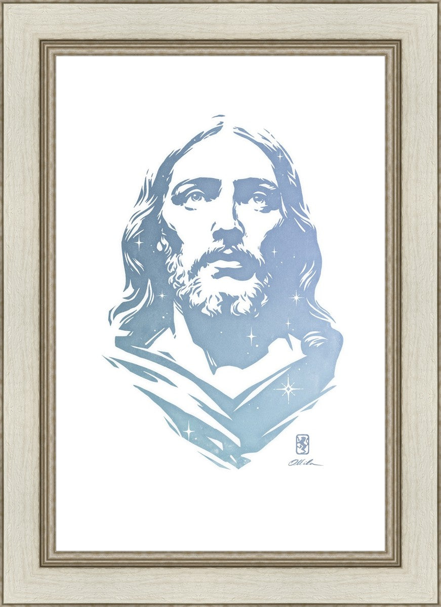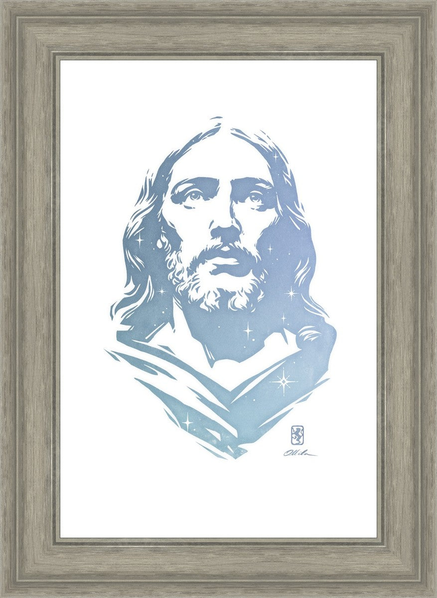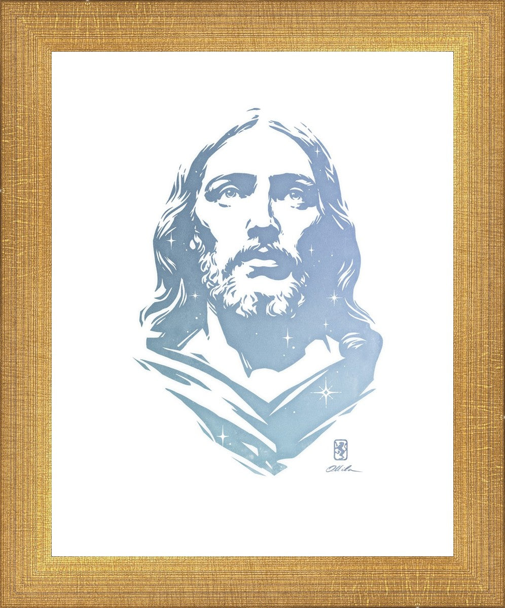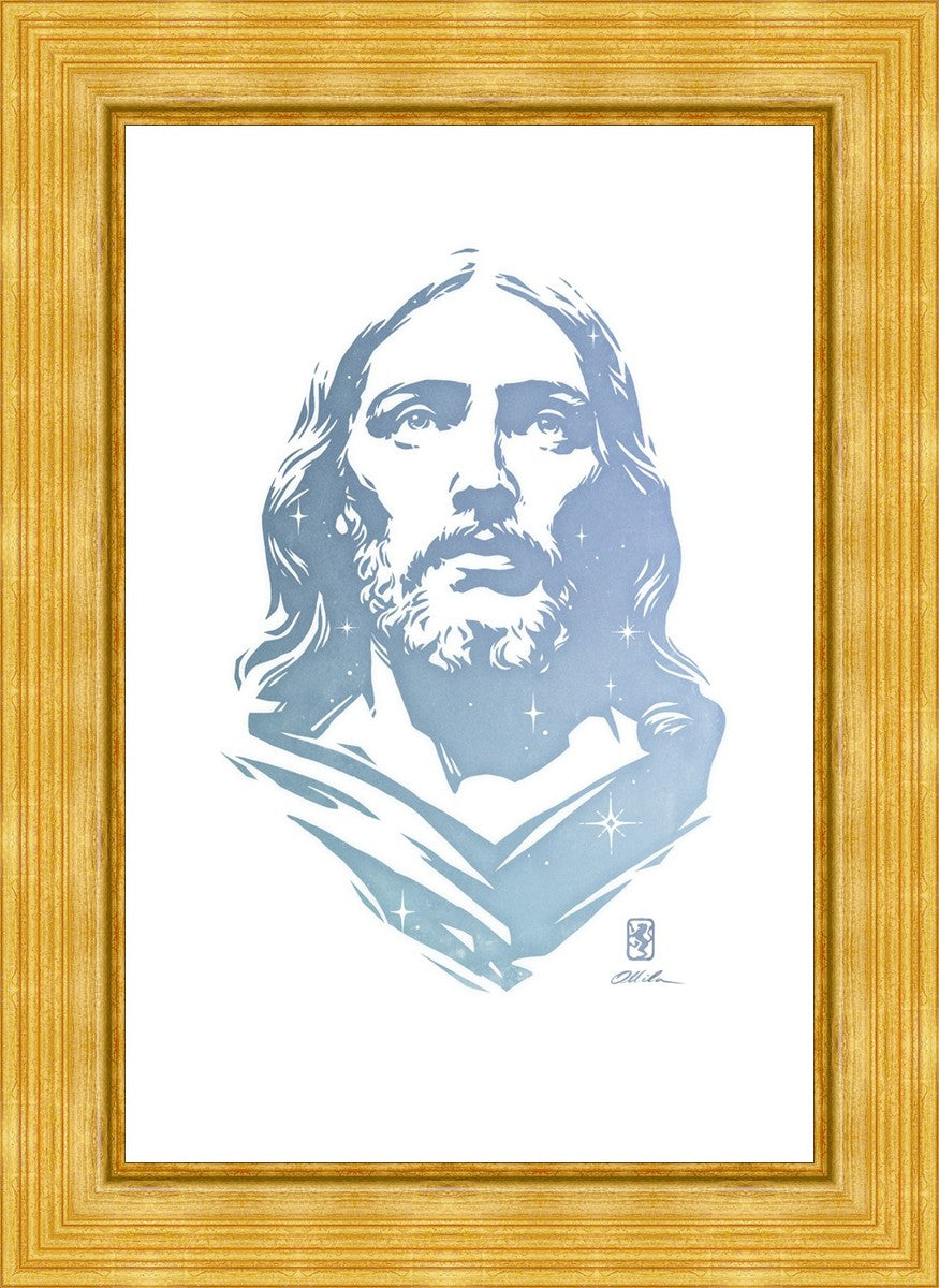 This is a hand carved woodcut relief print. The artist's goal in carving this piece was to create a simple likeness of Jesus that conveys his reach and influence to all corners of the universe as one of His titles implies, Alpha and Omega, the Beginning and the End.