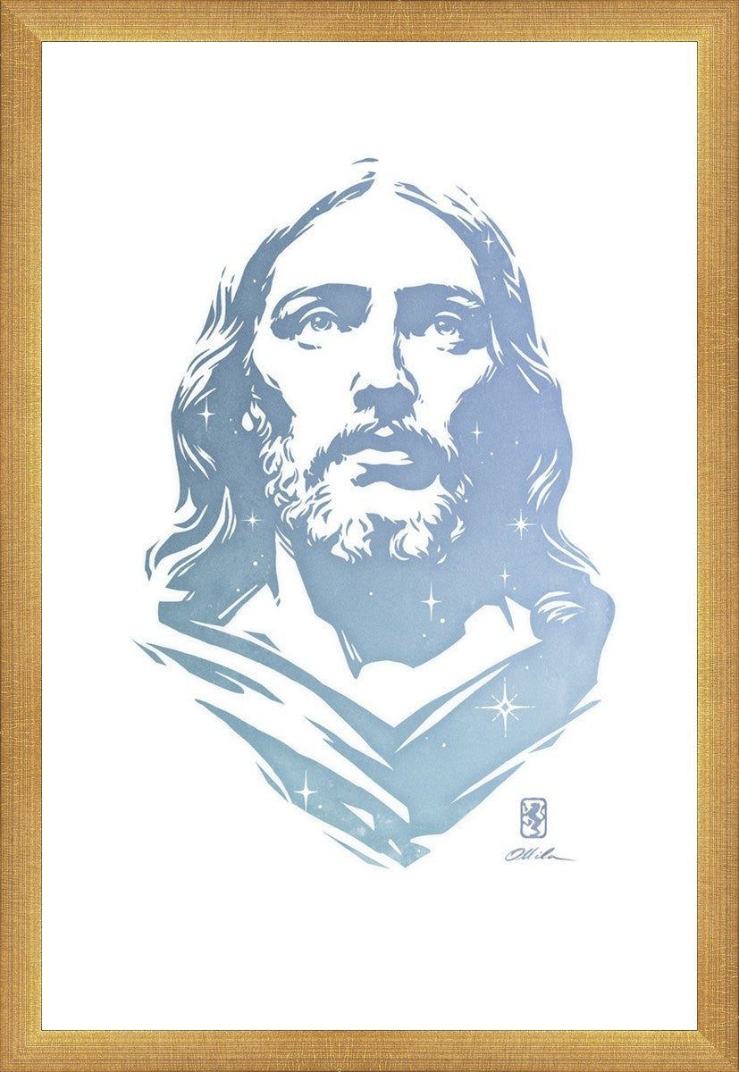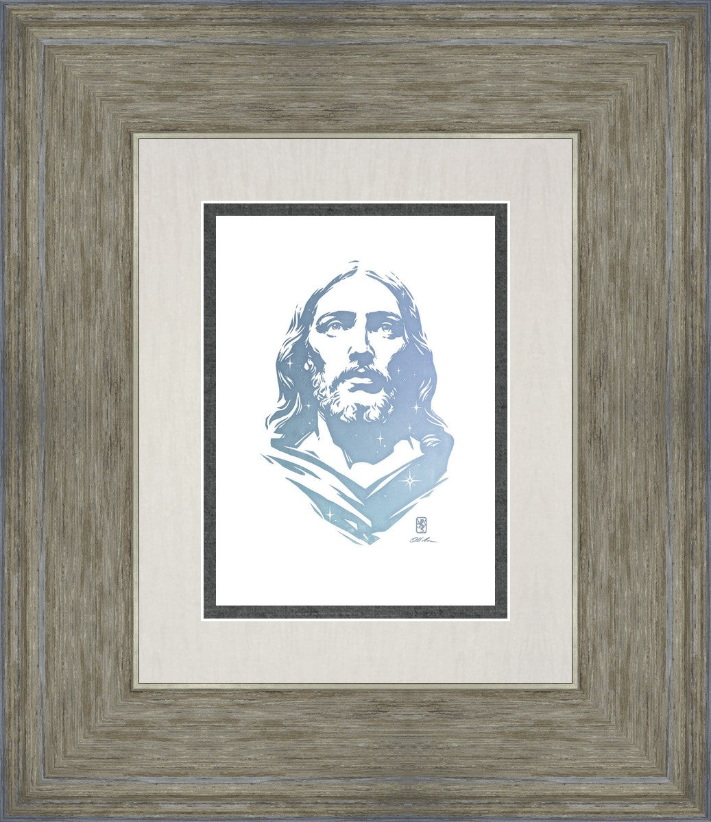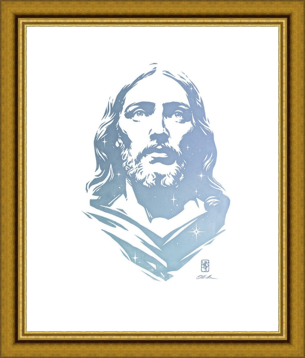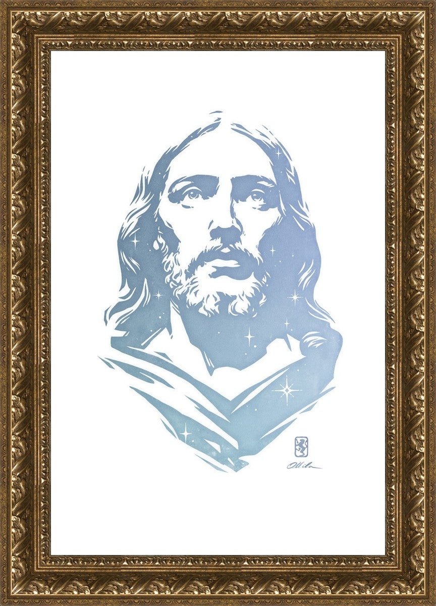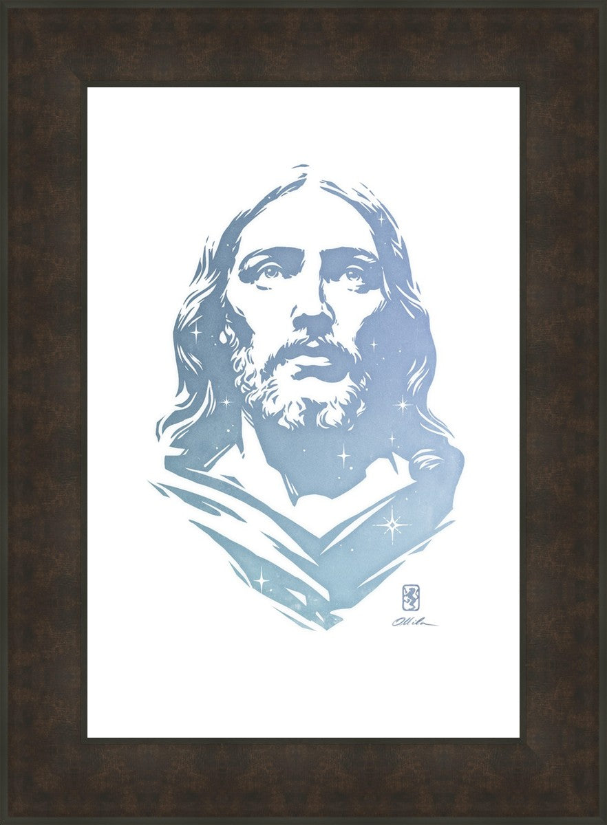 This is a hand carved woodcut relief print. The artist's goal in carving this piece was to create a simple likeness of Jesus that conveys his reach and influence to all corners of the universe as one of His titles implies, Alpha and Omega, the Beginning and the End.