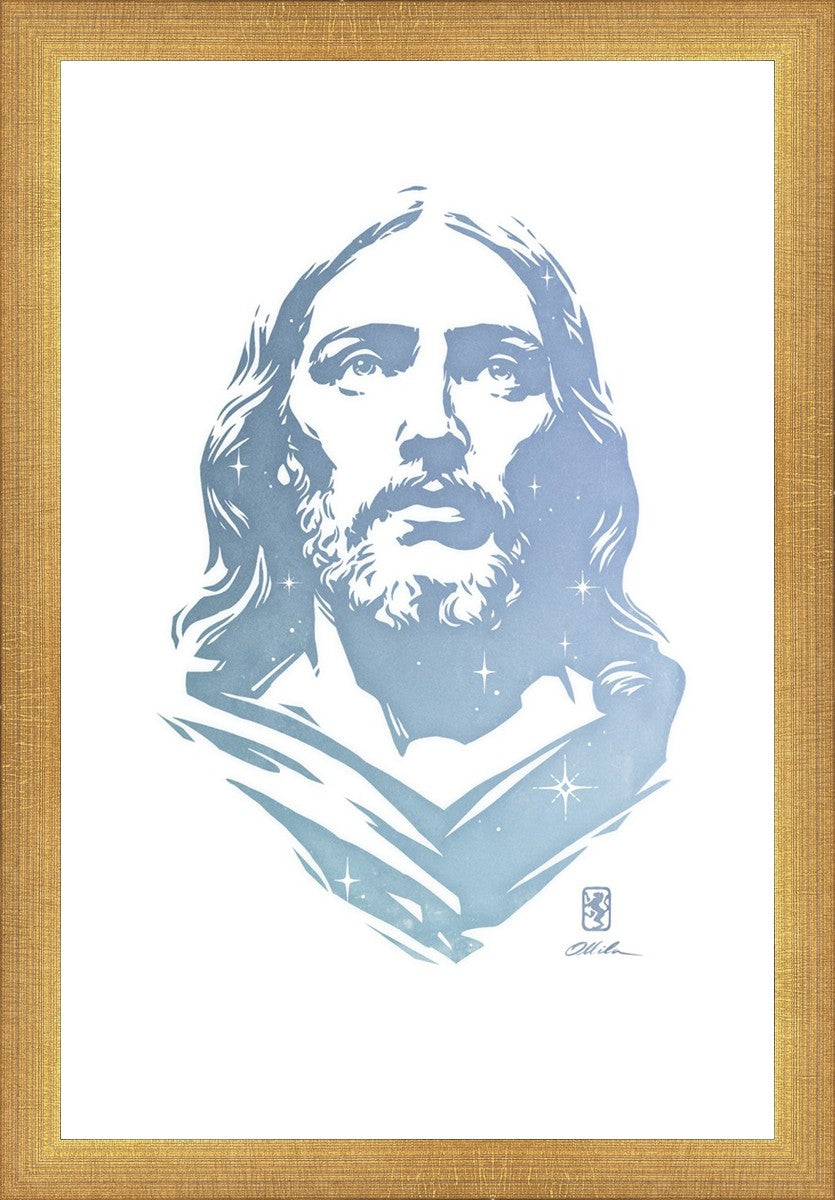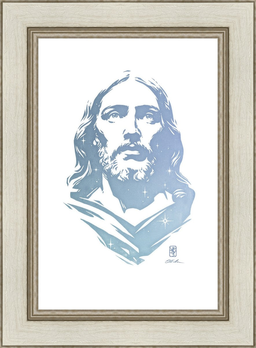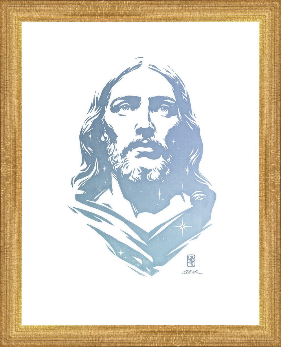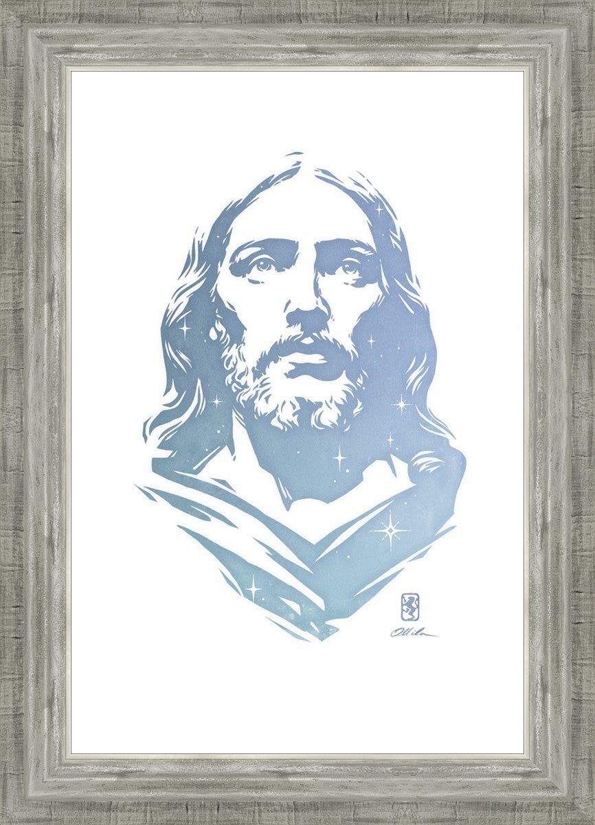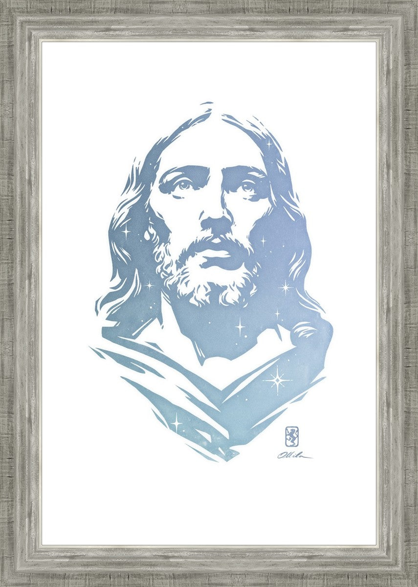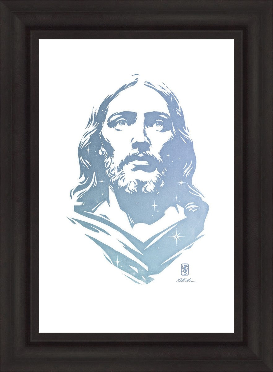This is a hand carved woodcut relief print. The artist's goal in carving this piece was to create a simple likeness of Jesus that conveys his reach and influence to all corners of the universe as one of His titles implies, Alpha and Omega, the Beginning and the End.