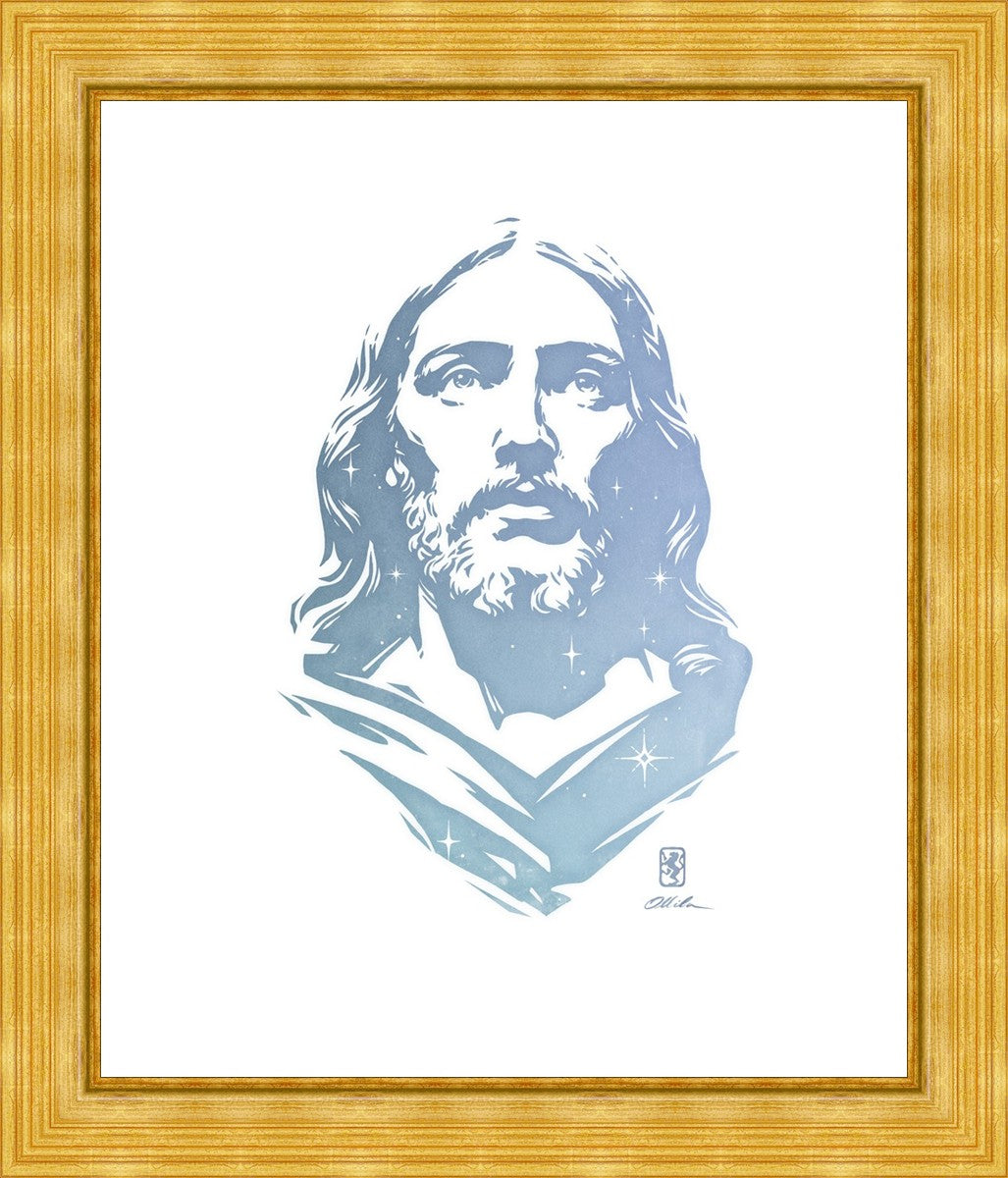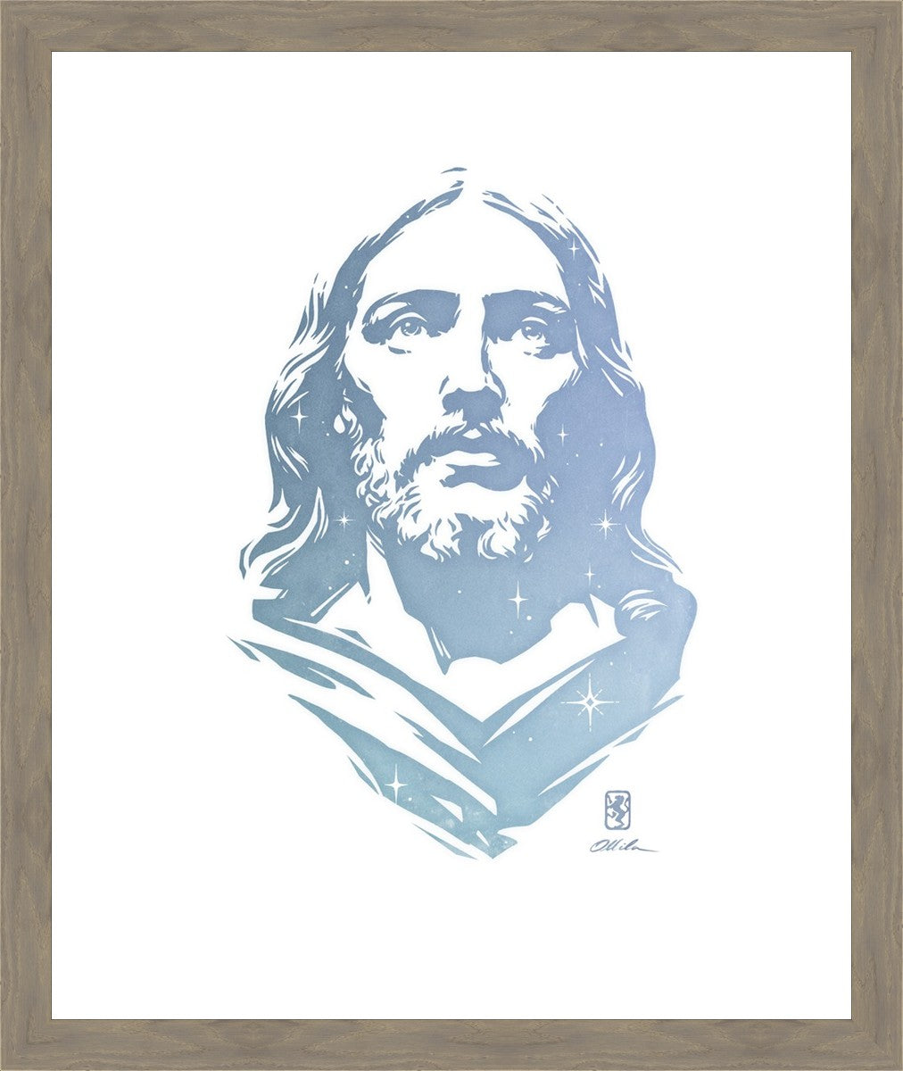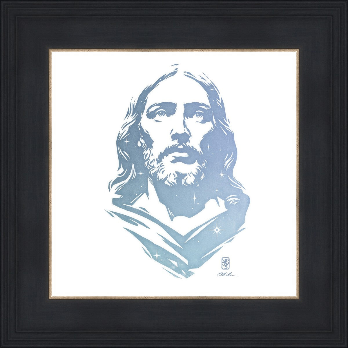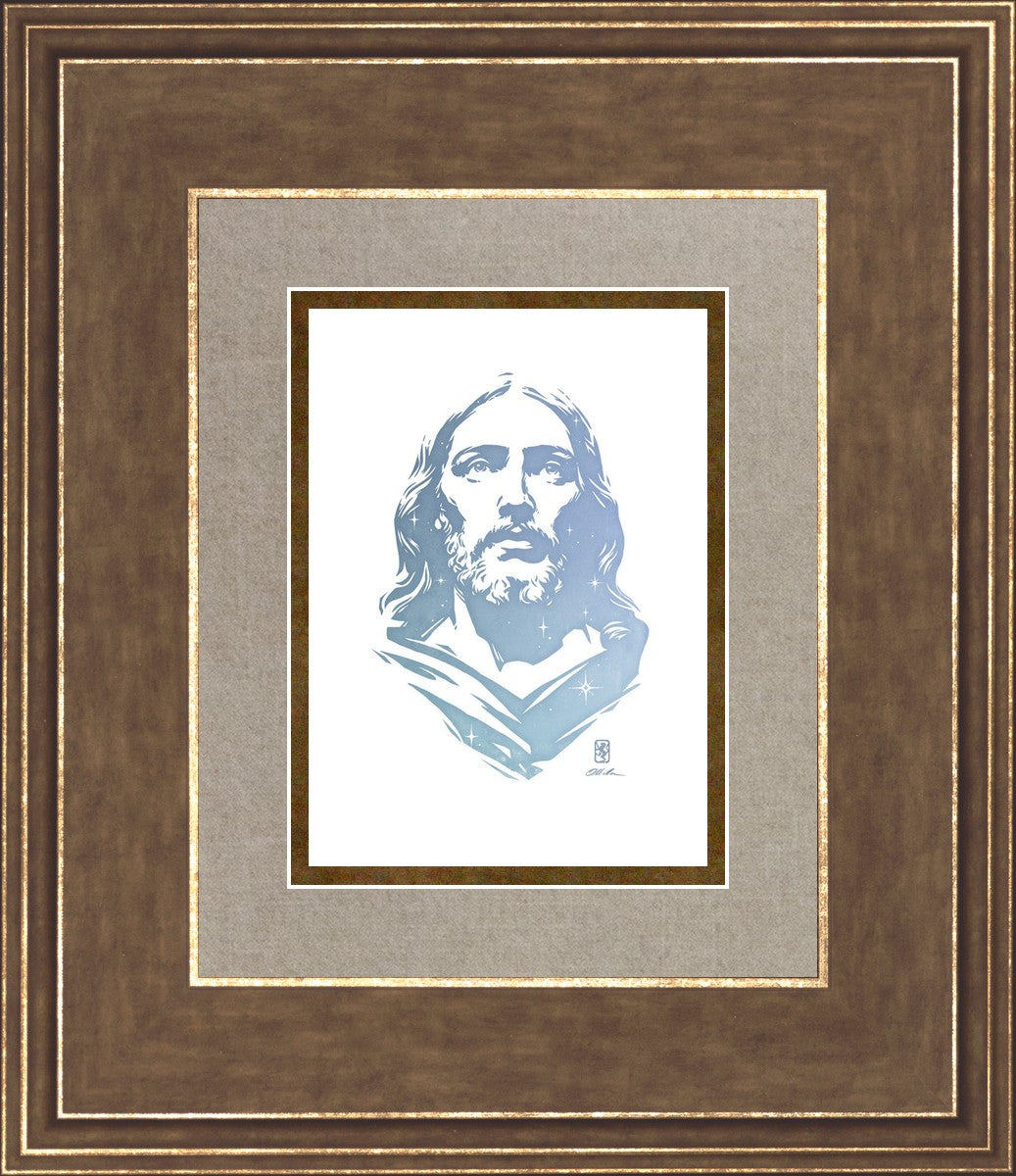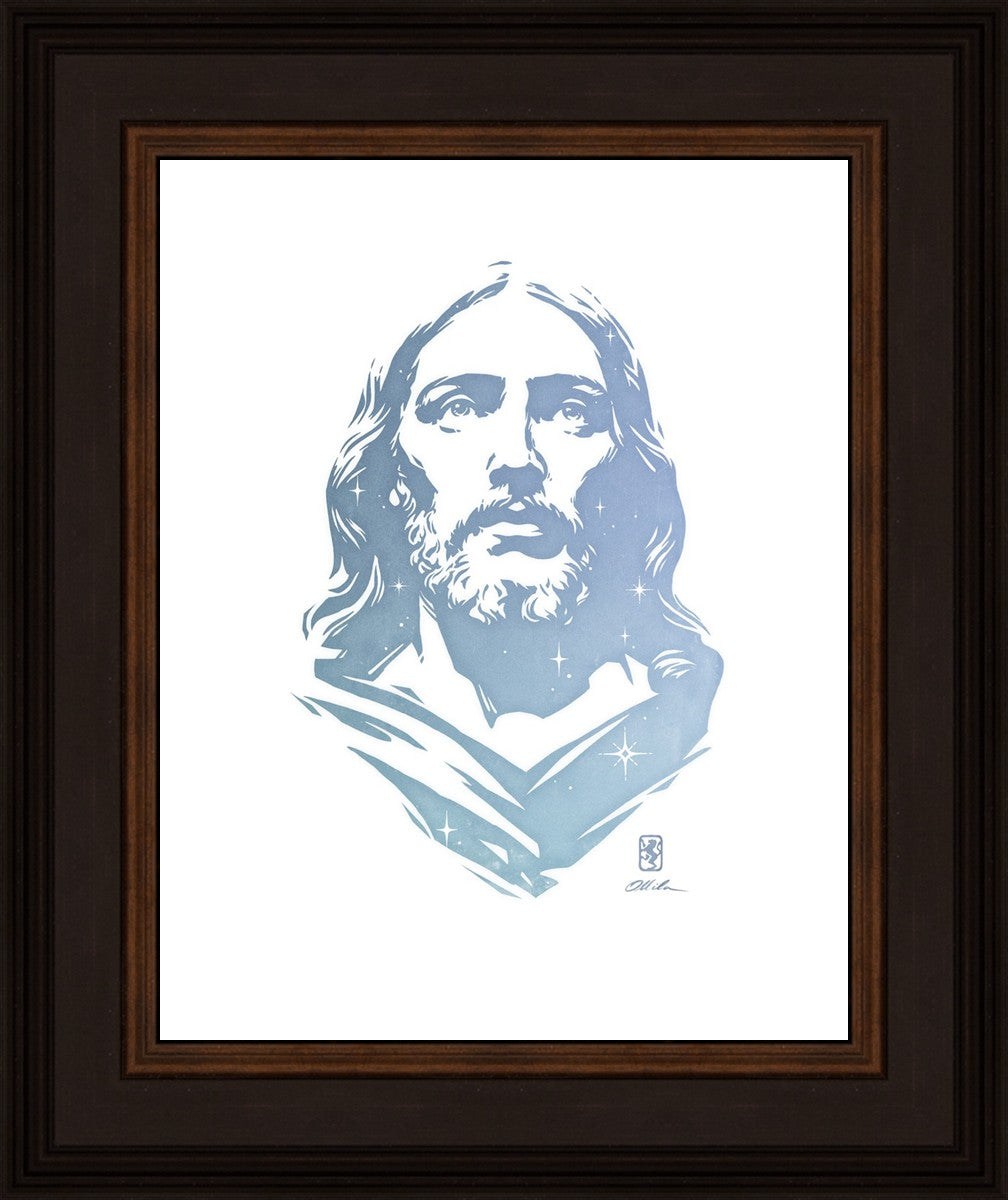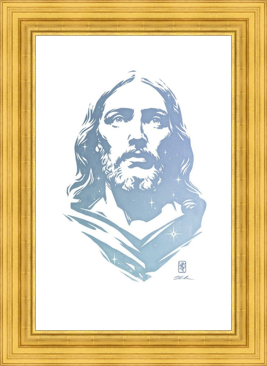 This is a hand carved woodcut relief print. The artist's goal in carving this piece was to create a simple likeness of Jesus that conveys his reach and influence to all corners of the universe as one of His titles implies, Alpha and Omega, the Beginning and the End.