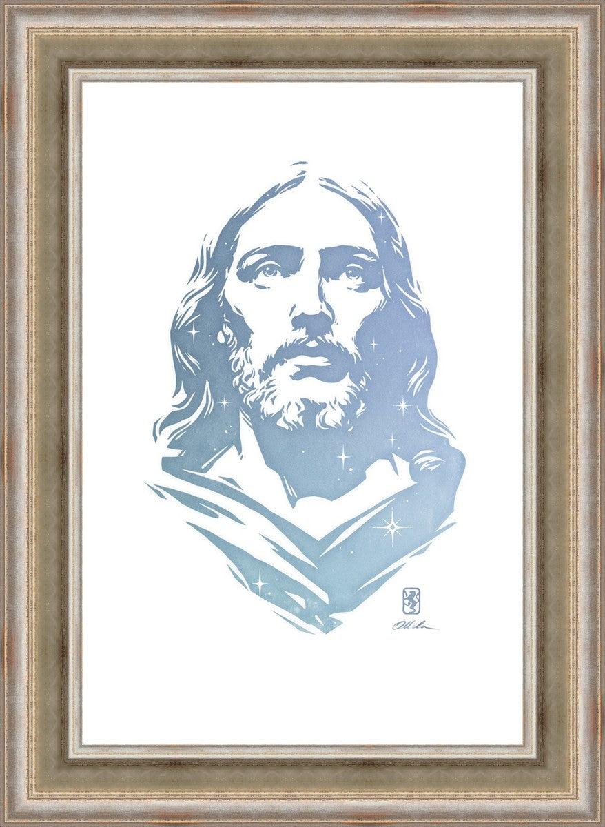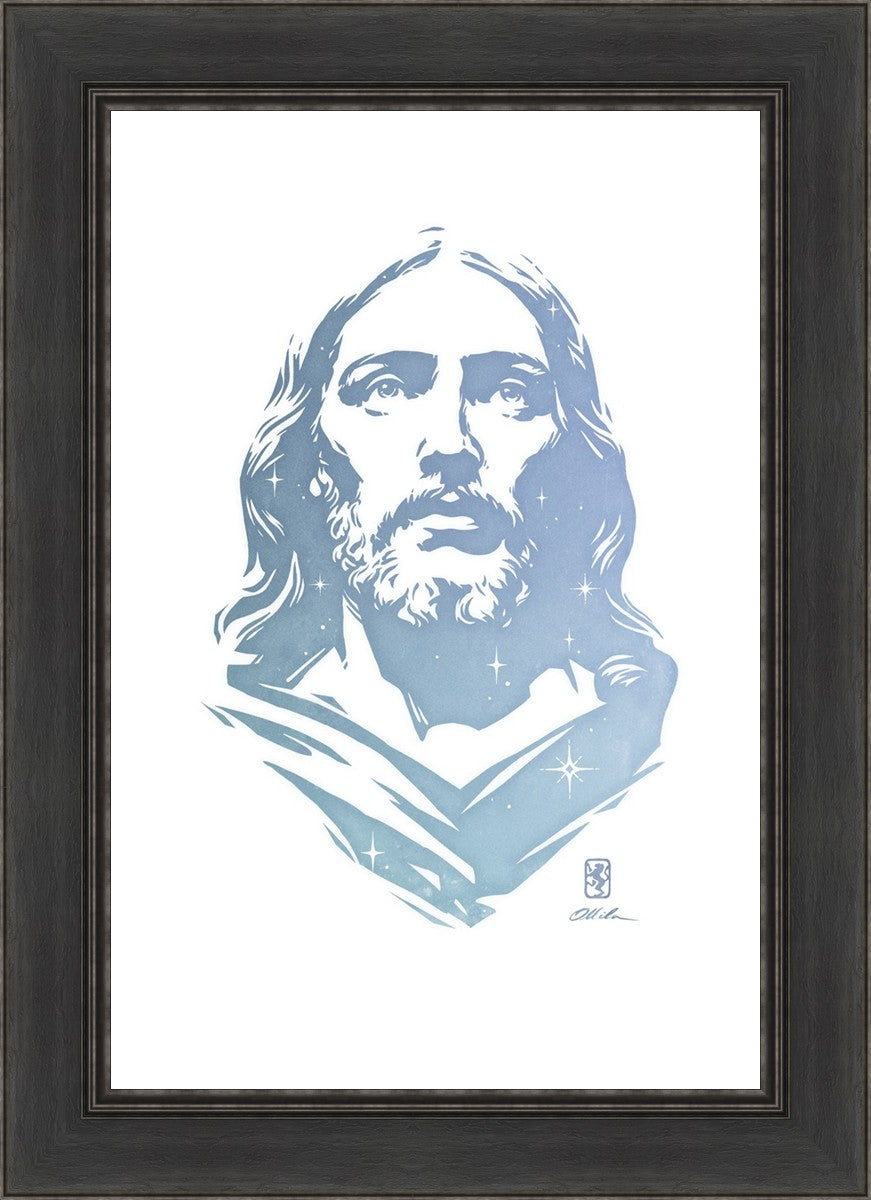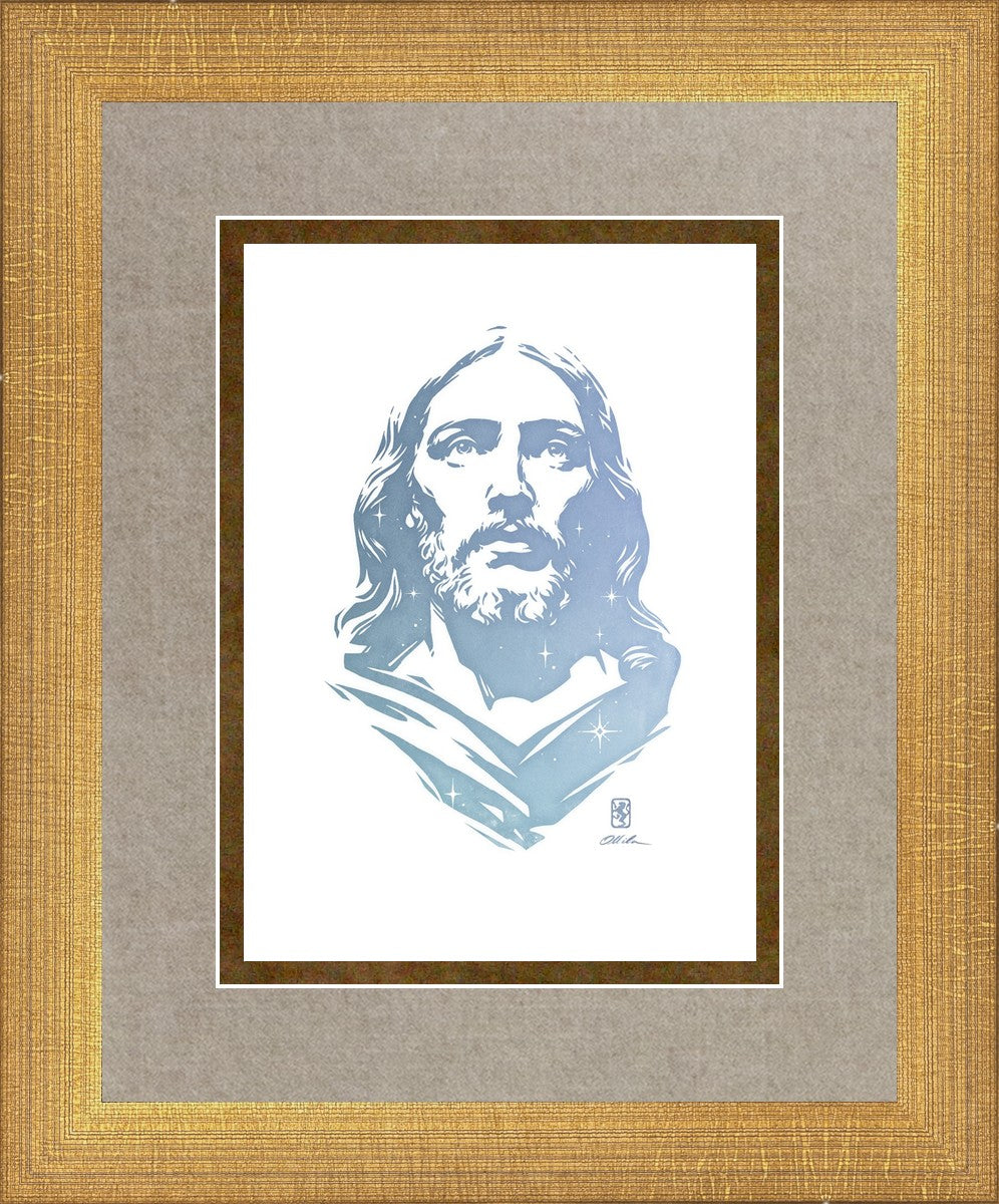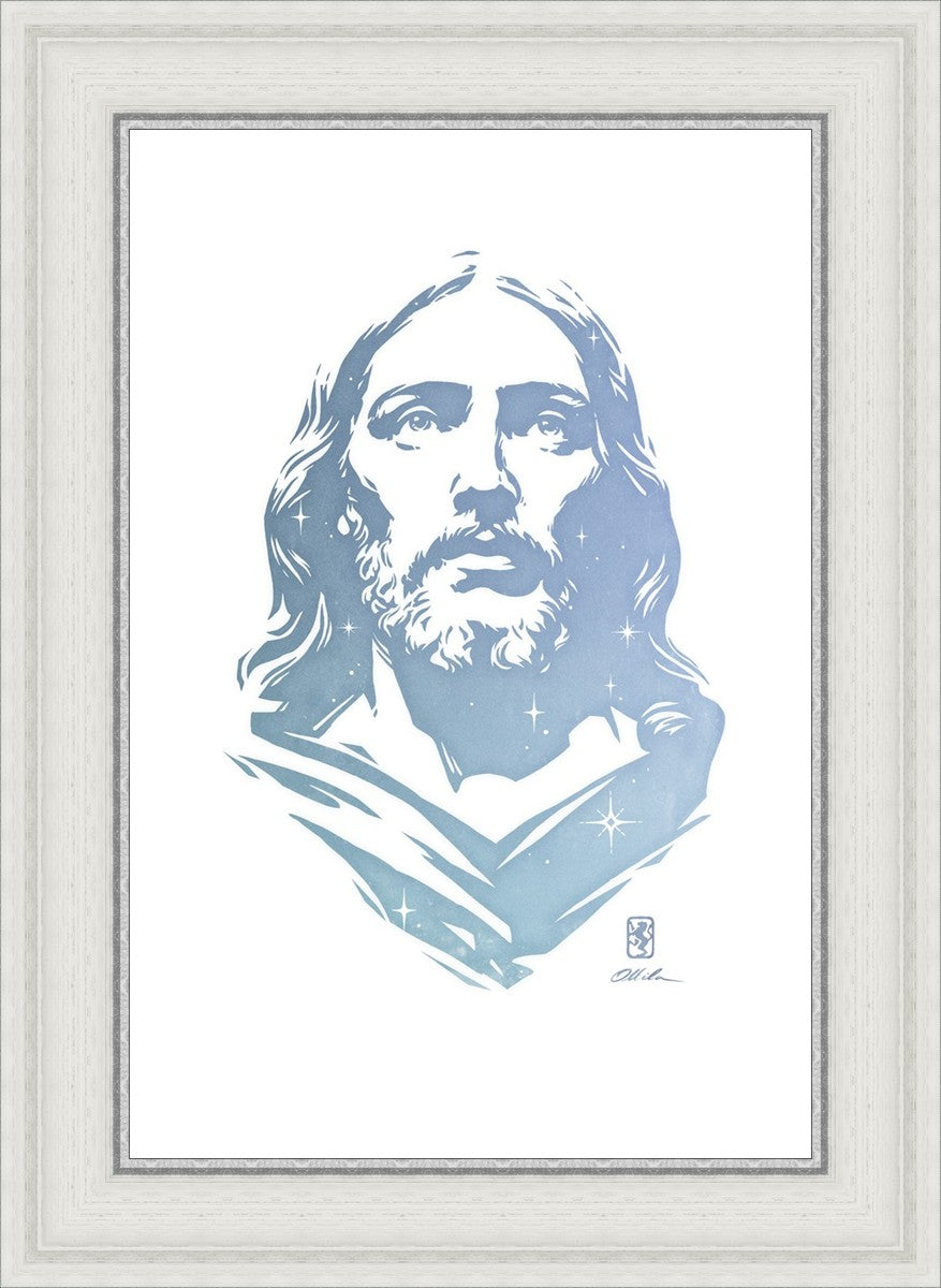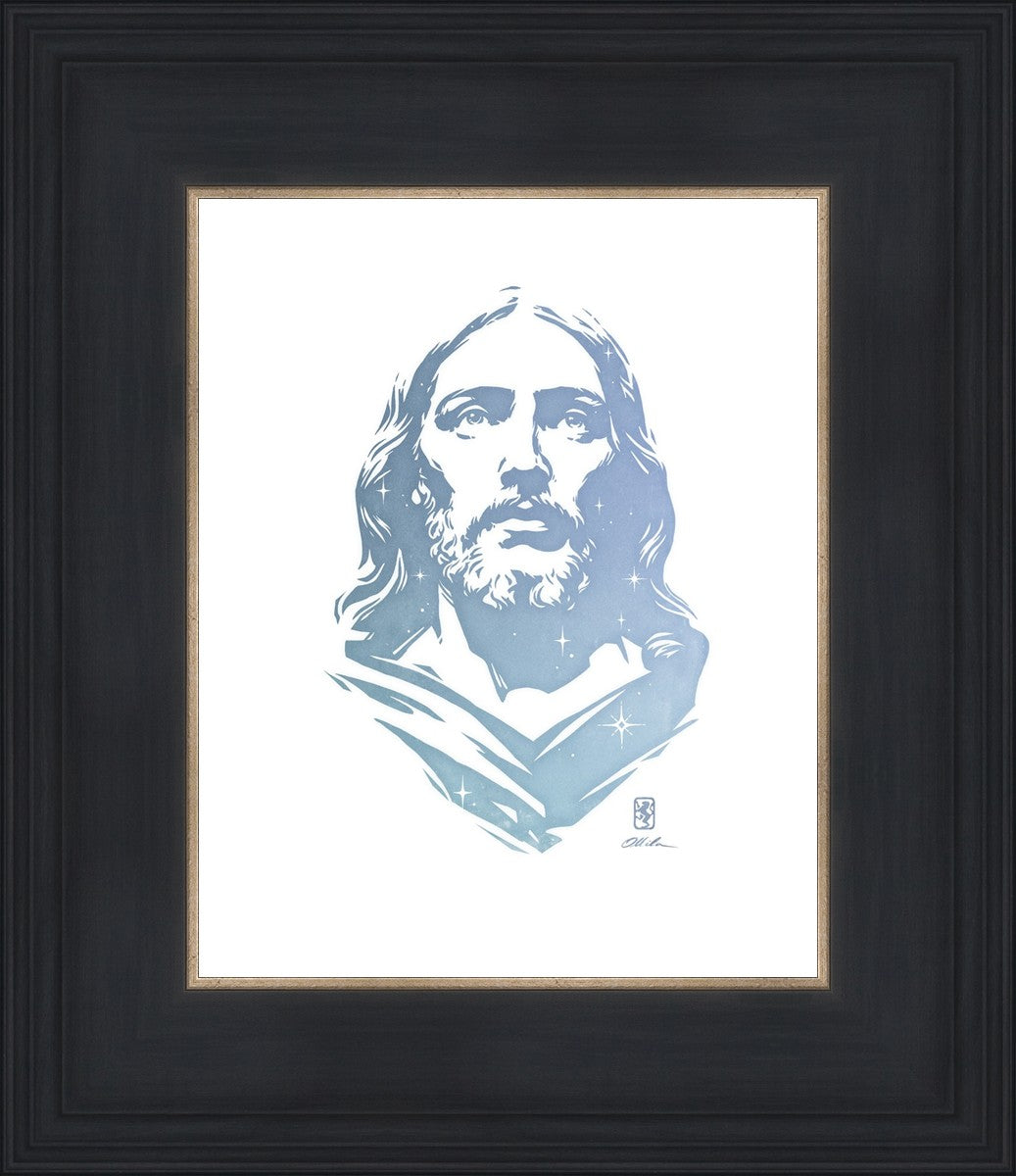 This is a hand carved woodcut relief print. The artist's goal in carving this piece was to create a simple likeness of Jesus that conveys his reach and influence to all corners of the universe as one of His titles implies, Alpha and Omega, the Beginning and the End.