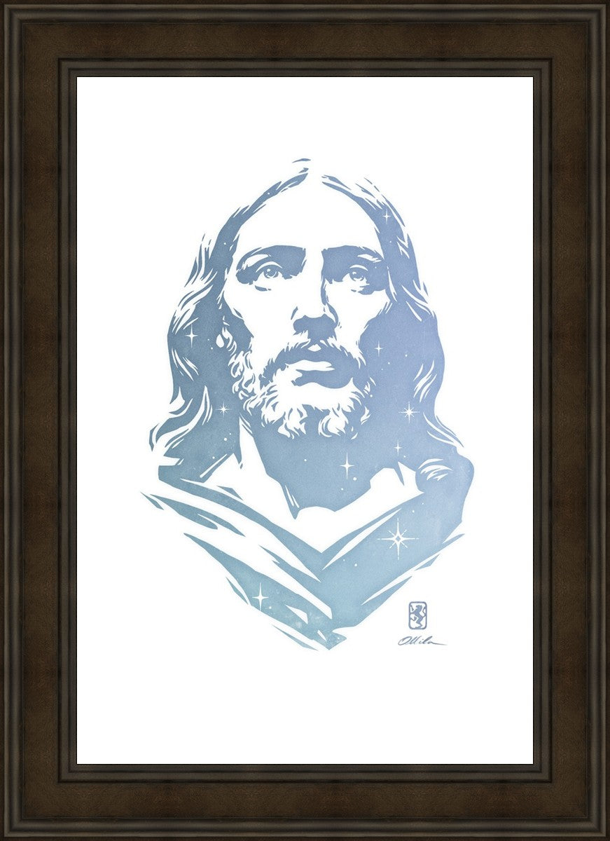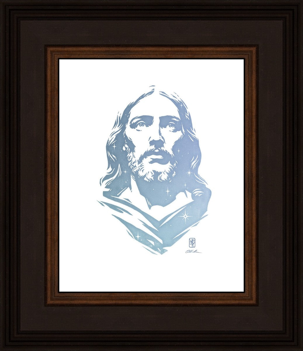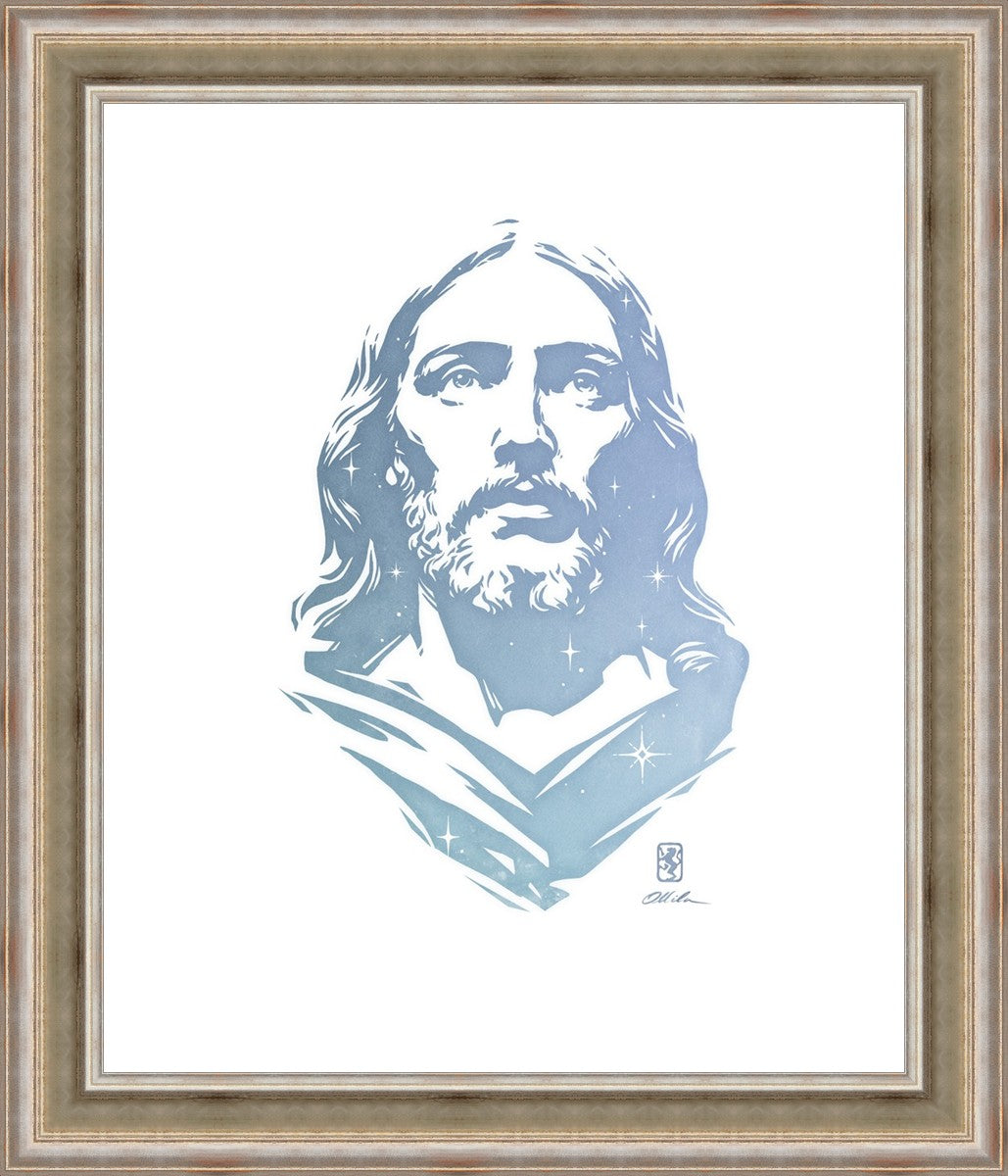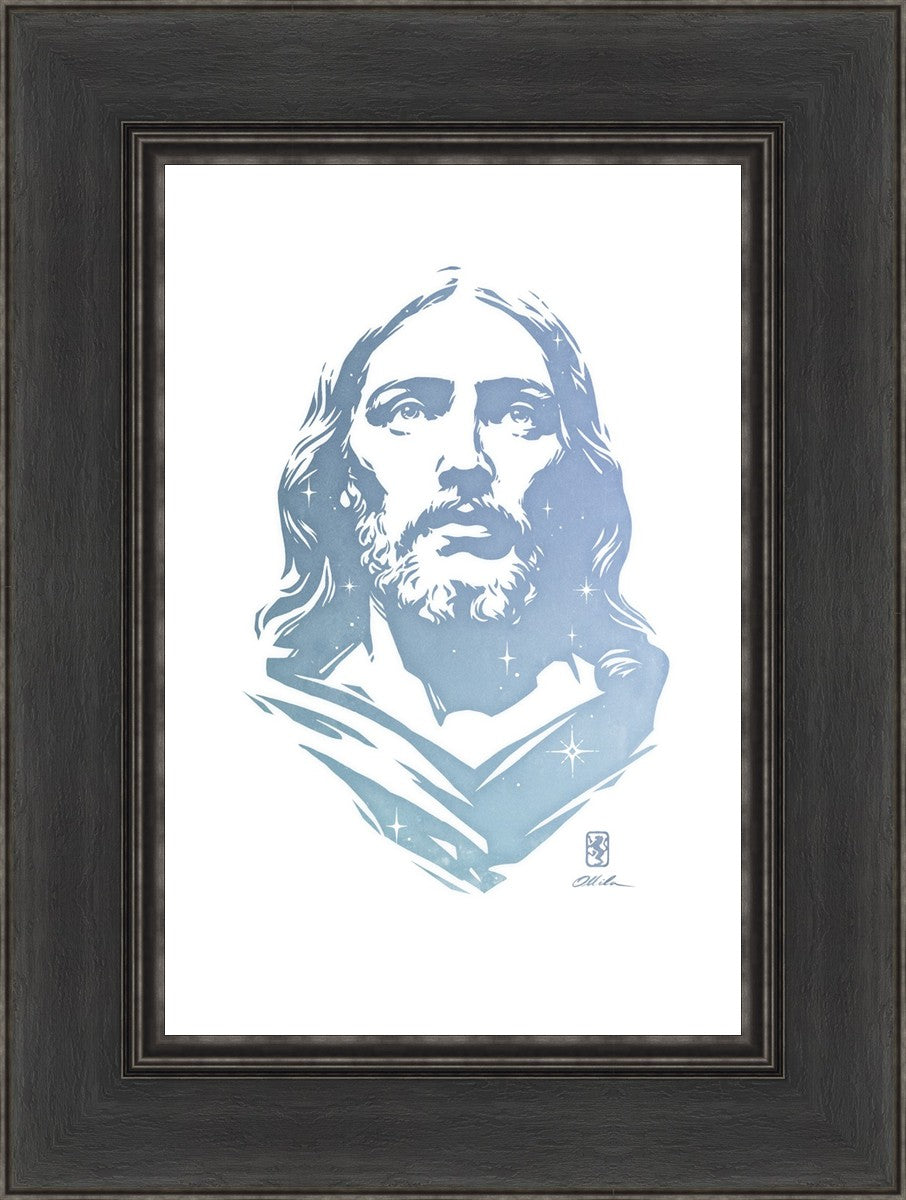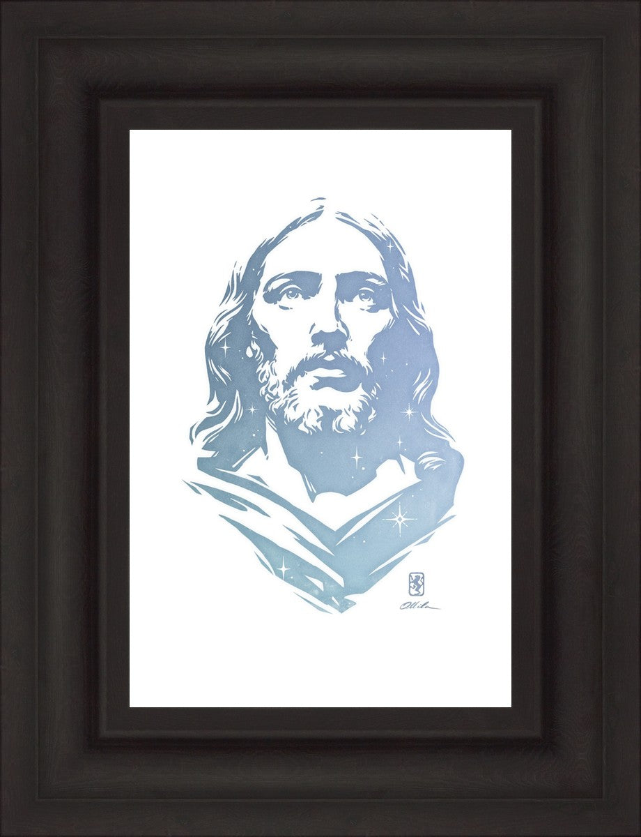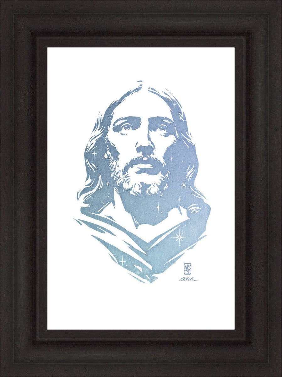 This is a hand carved woodcut relief print. The artist's goal in carving this piece was to create a simple likeness of Jesus that conveys his reach and influence to all corners of the universe as one of His titles implies, Alpha and Omega, the Beginning and the End.