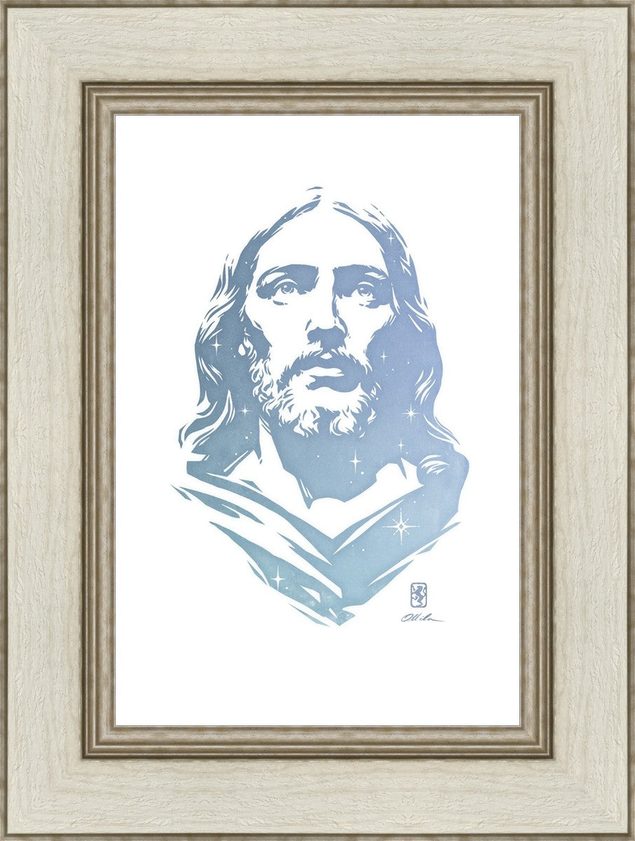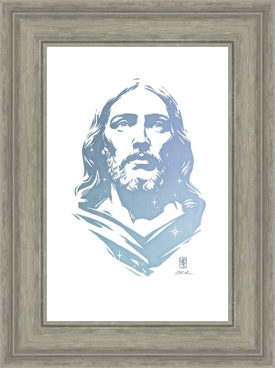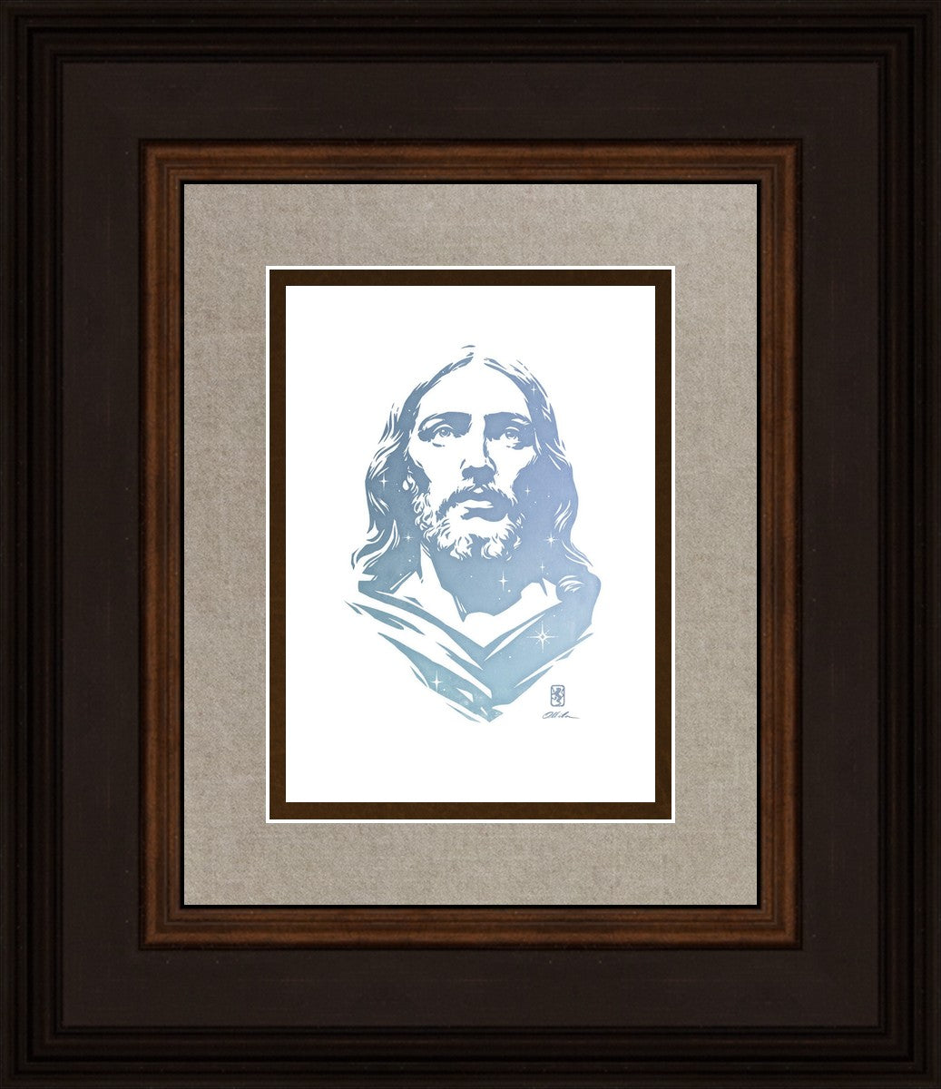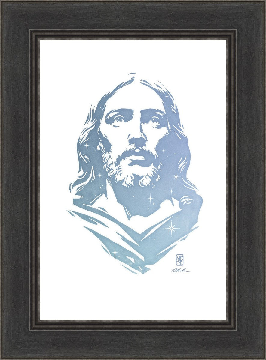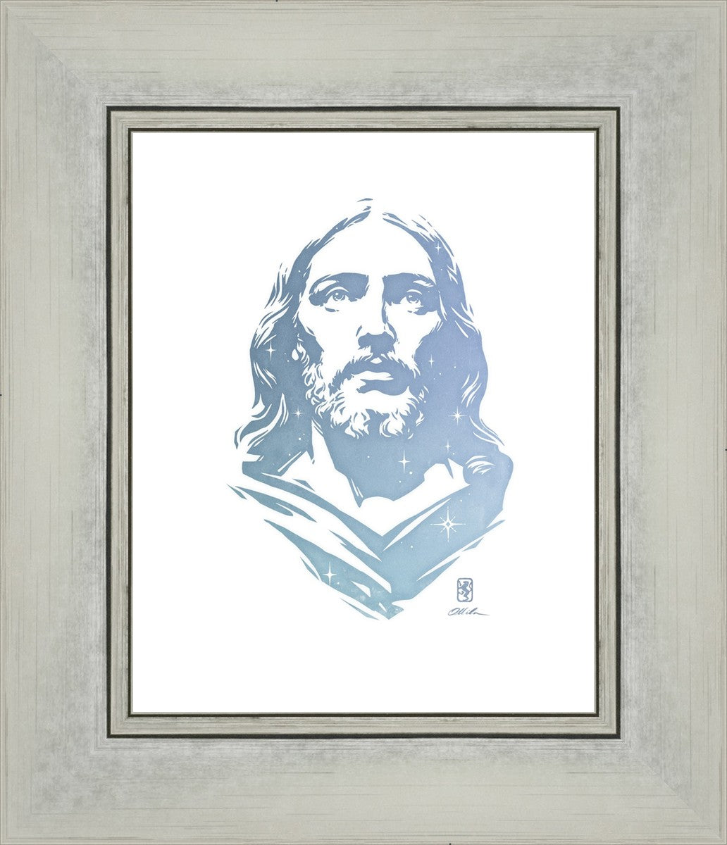 This is a hand carved woodcut relief print. The artist's goal in carving this piece was to create a simple likeness of Jesus that conveys his reach and influence to all corners of the universe as one of His titles implies, Alpha and Omega, the Beginning and the End.