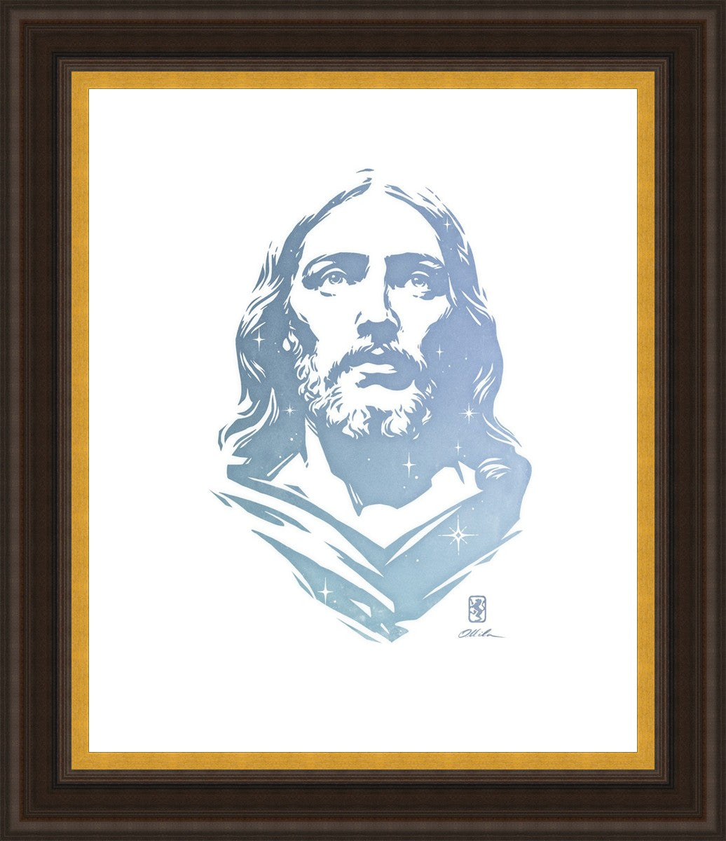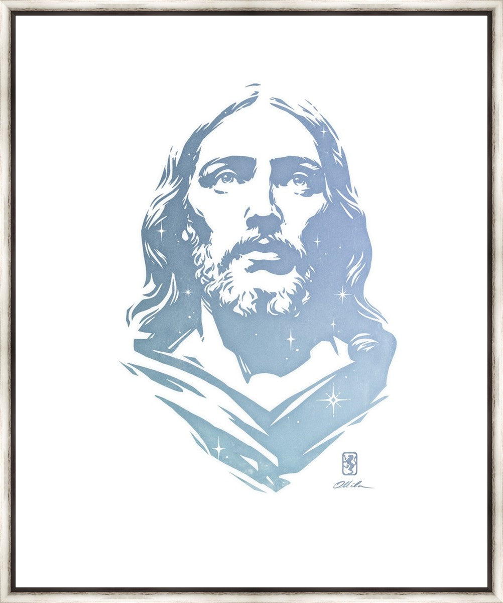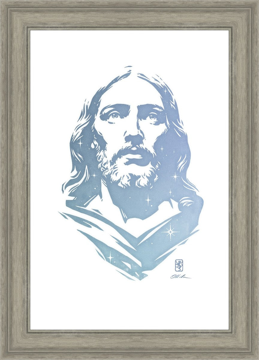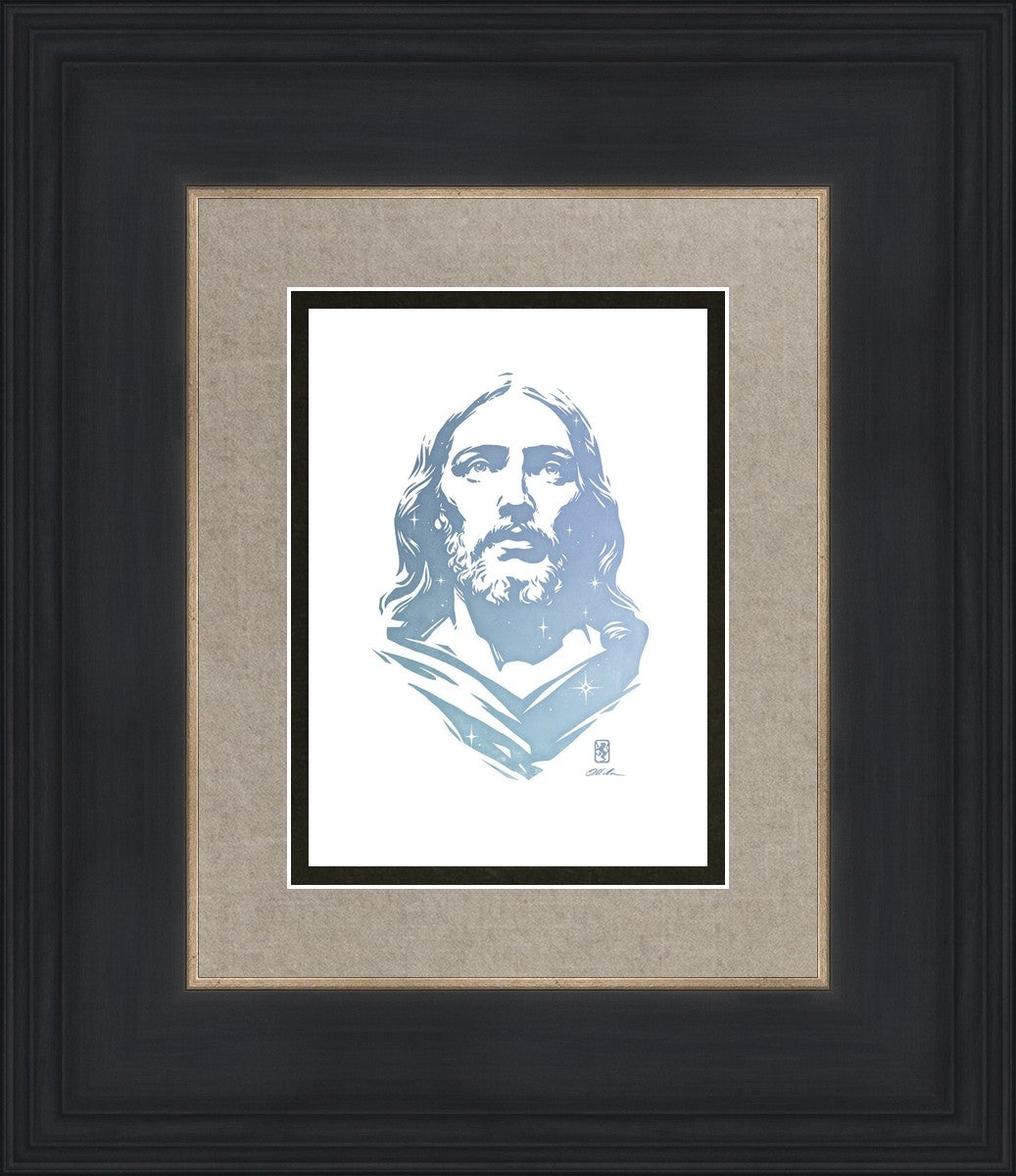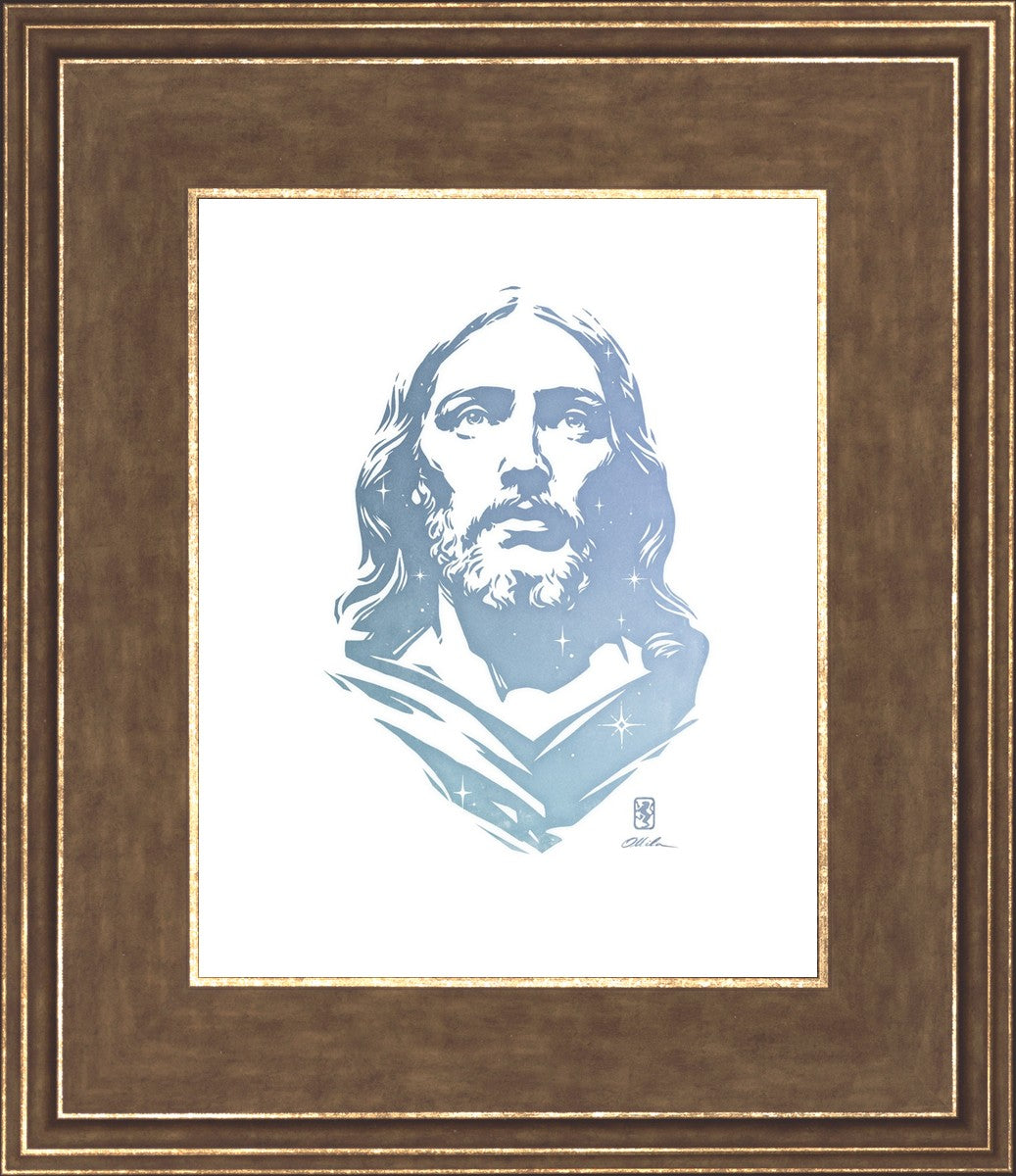 This is a hand carved woodcut relief print. The artist's goal in carving this piece was to create a simple likeness of Jesus that conveys his reach and influence to all corners of the universe as one of His titles implies, Alpha and Omega, the Beginning and the End.