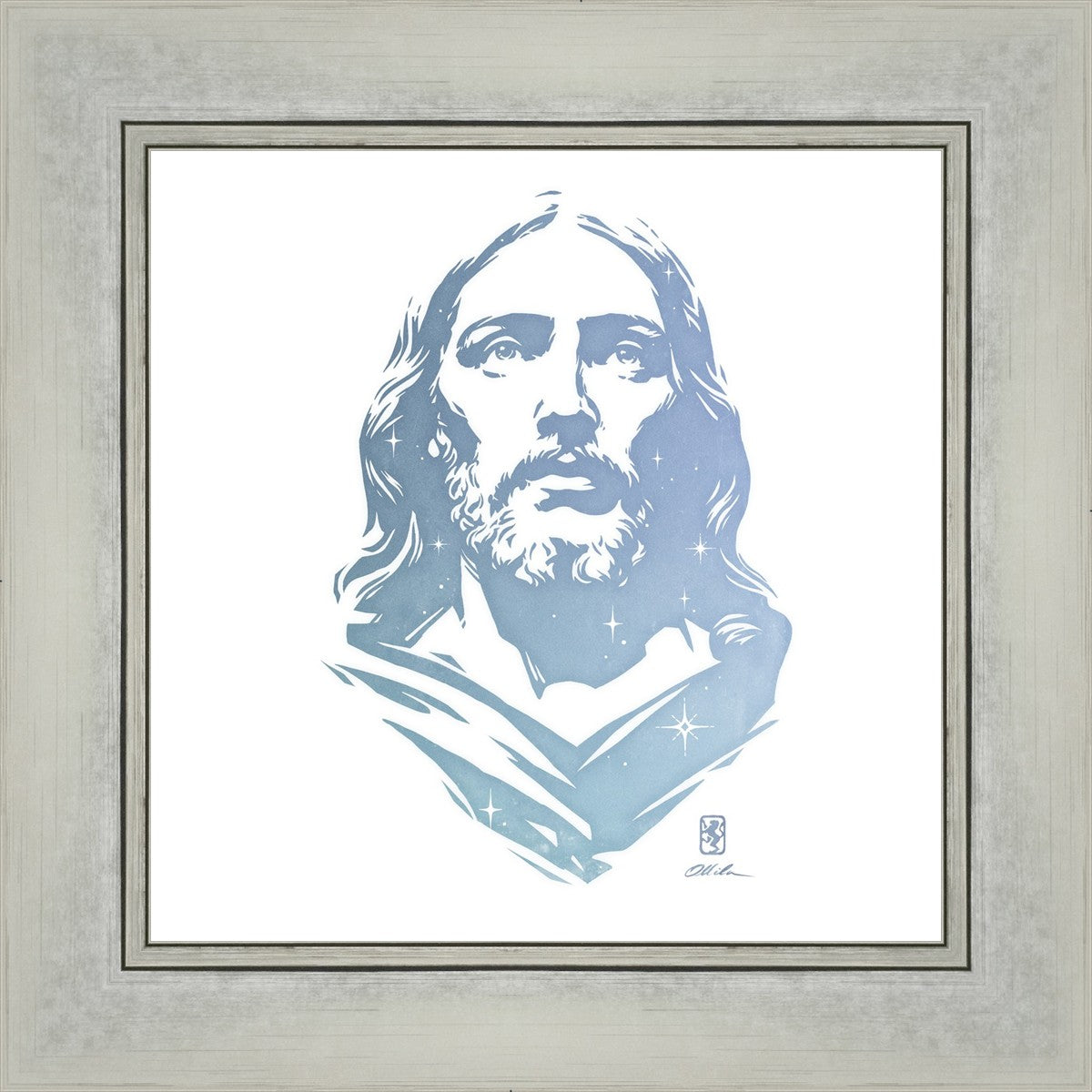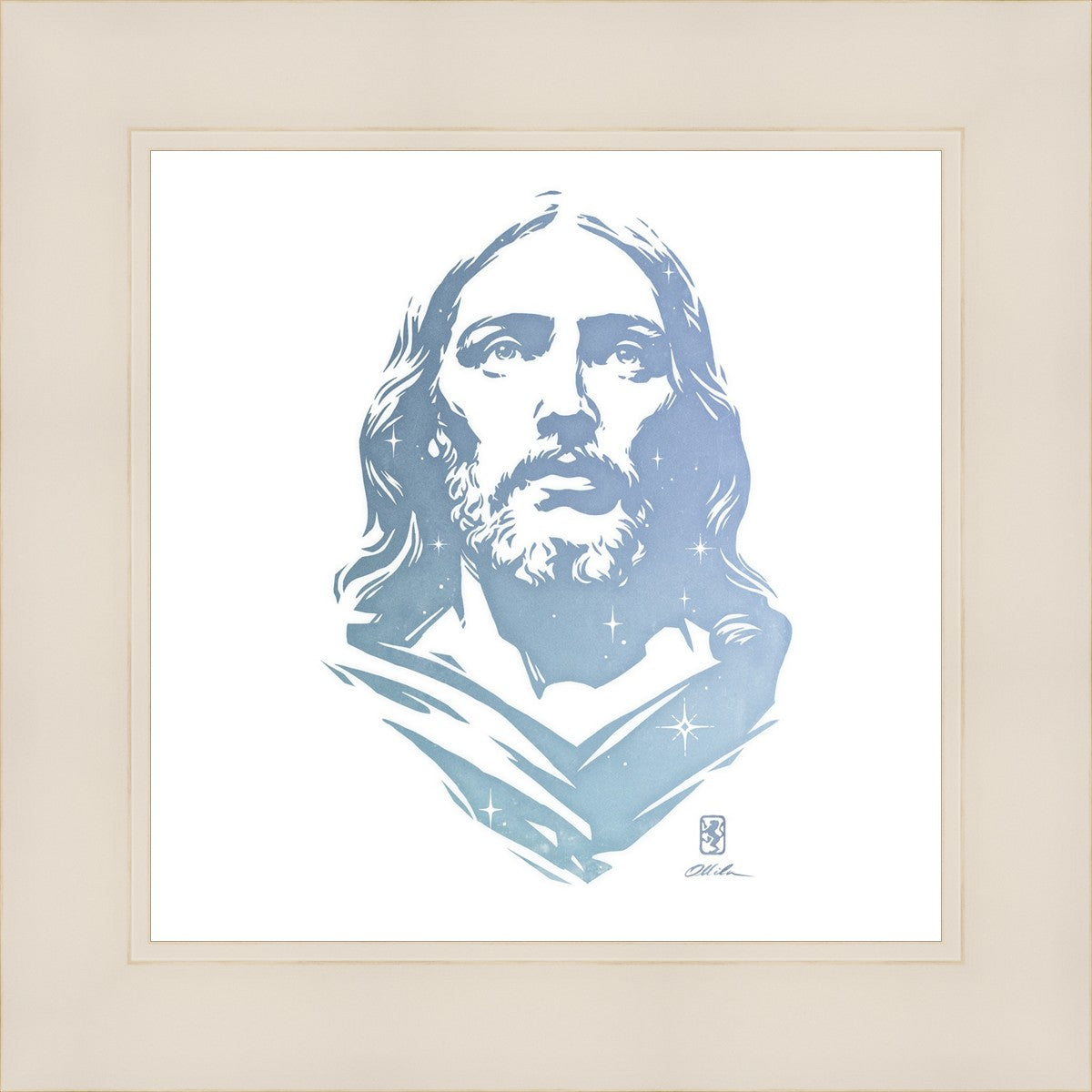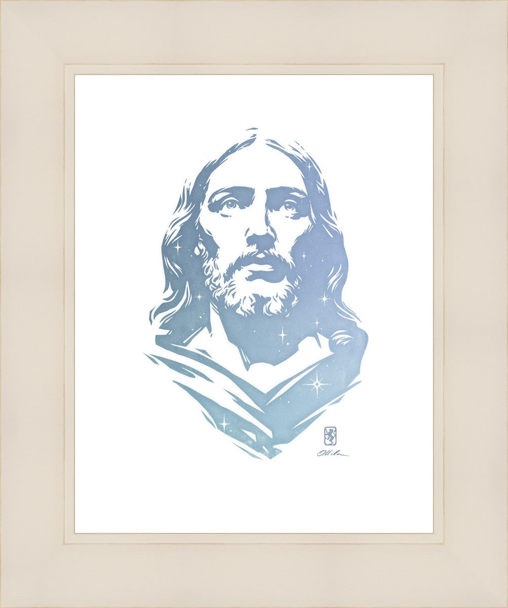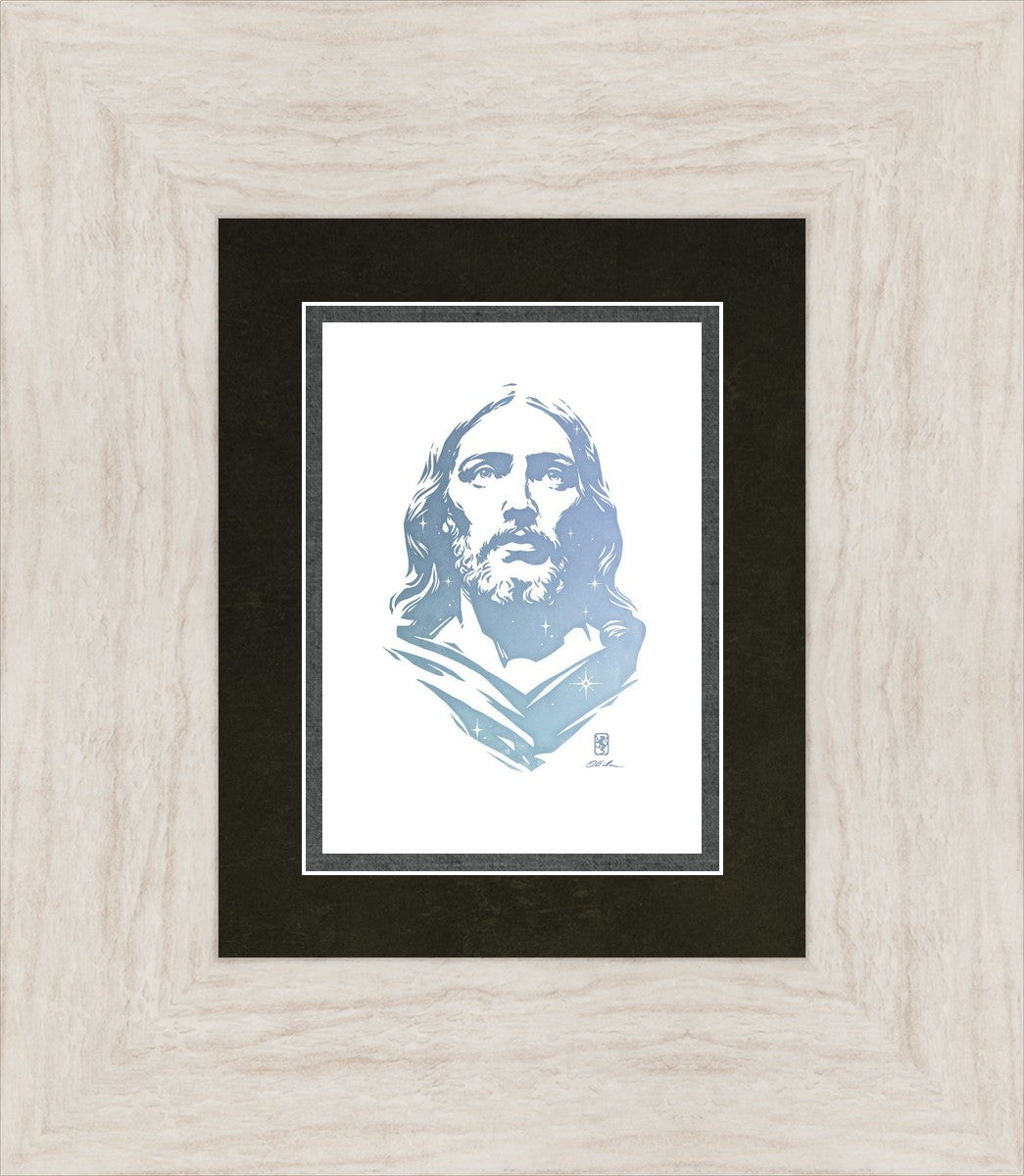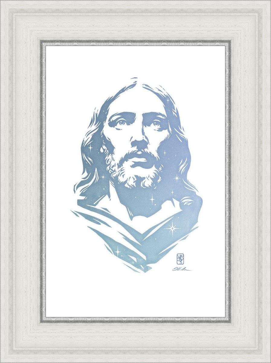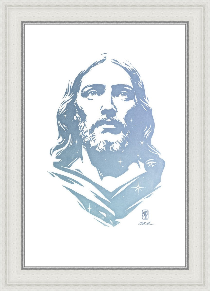 This is a hand carved woodcut relief print. The artist's goal in carving this piece was to create a simple likeness of Jesus that conveys his reach and influence to all corners of the universe as one of His titles implies, Alpha and Omega, the Beginning and the End.
