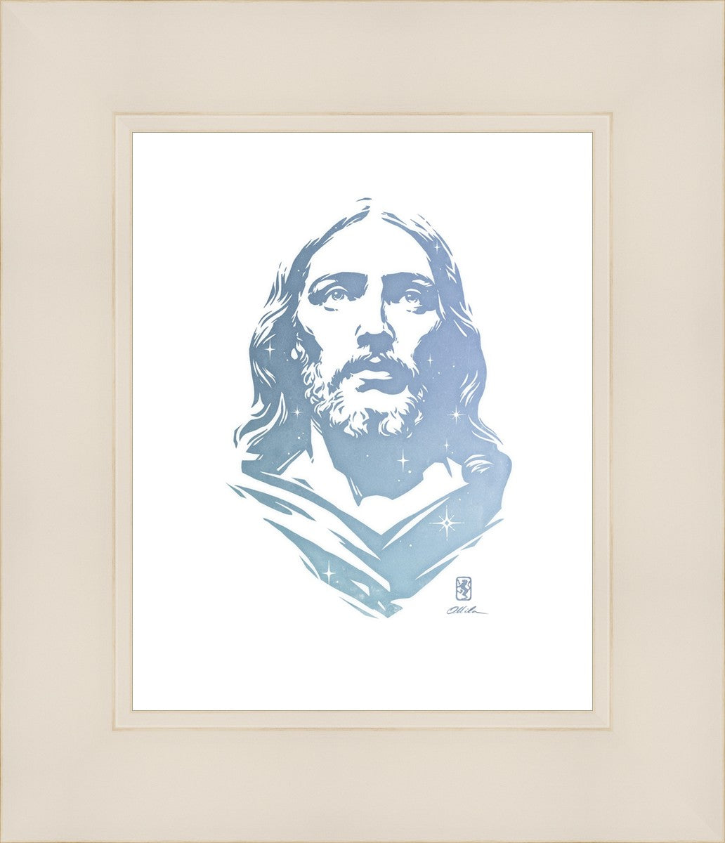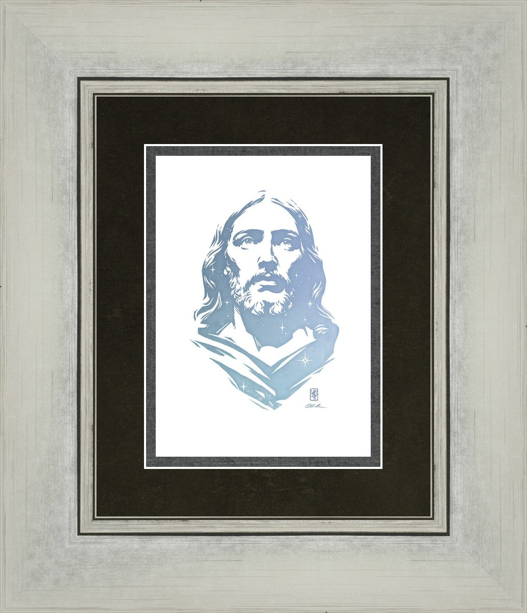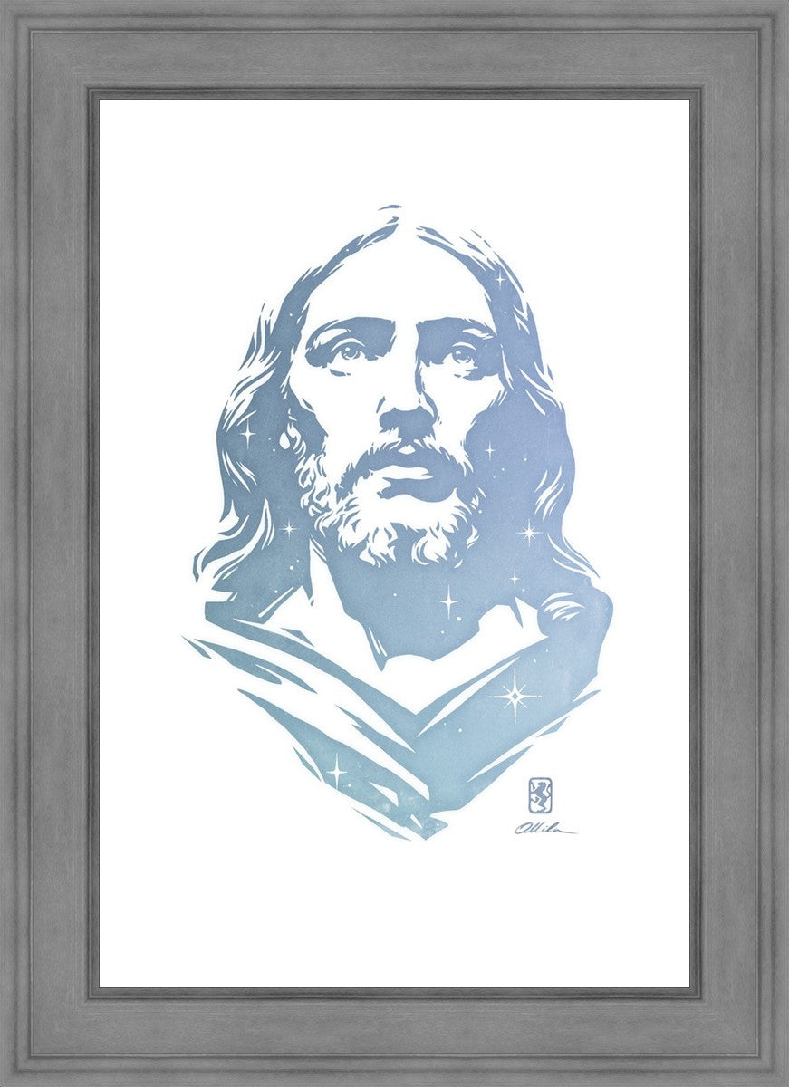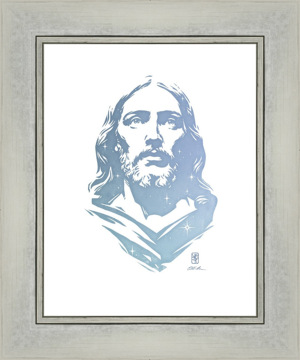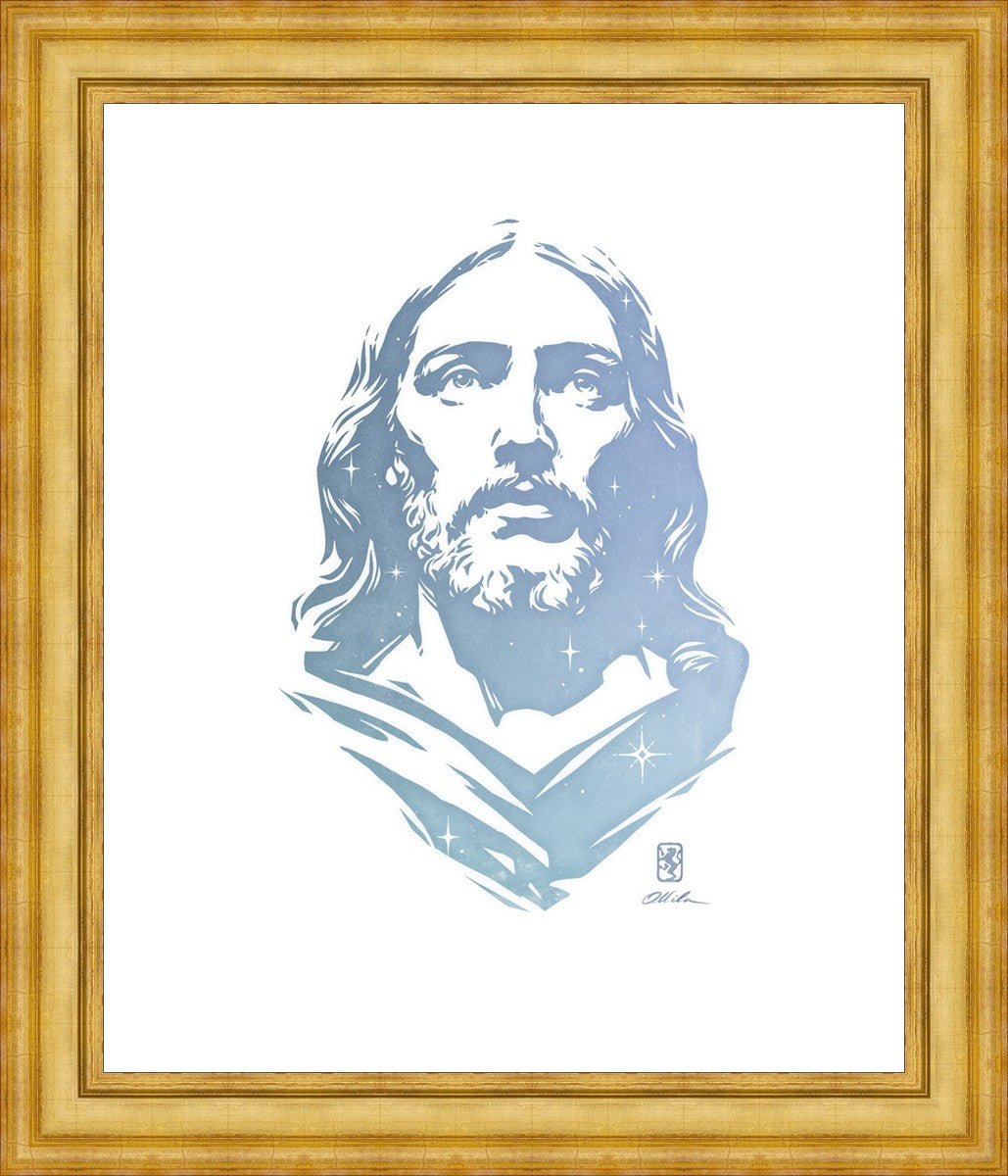 This is a hand carved woodcut relief print. The artist's goal in carving this piece was to create a simple likeness of Jesus that conveys his reach and influence to all corners of the universe as one of His titles implies, Alpha and Omega, the Beginning and the End.