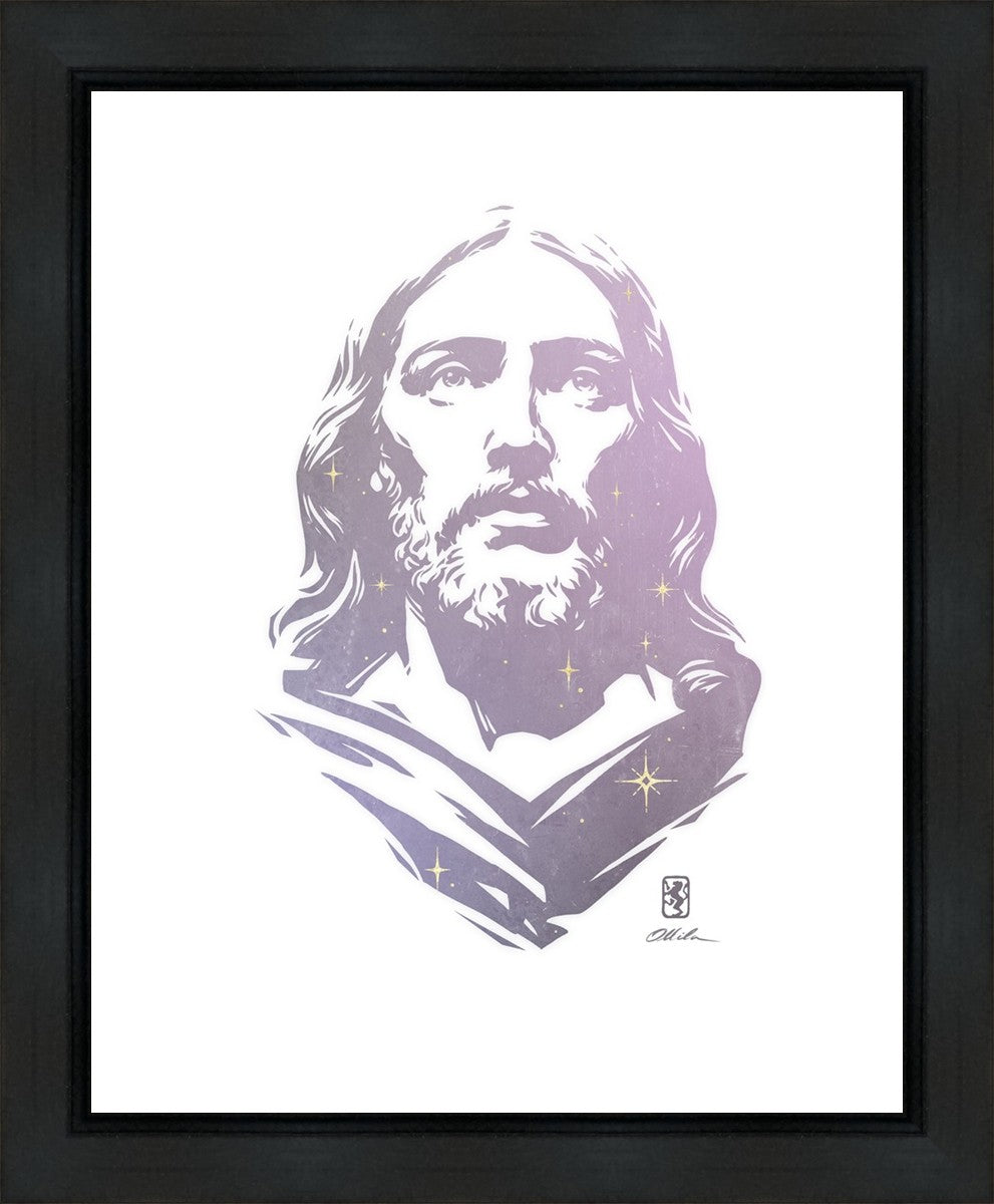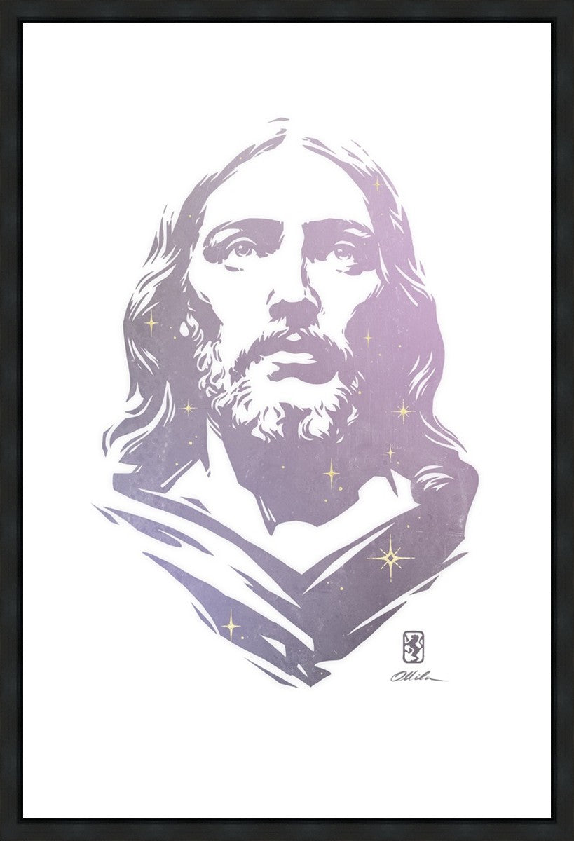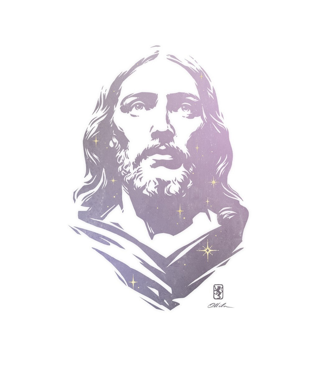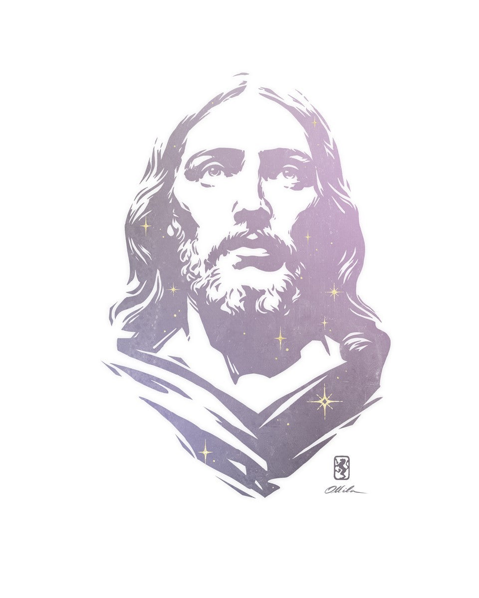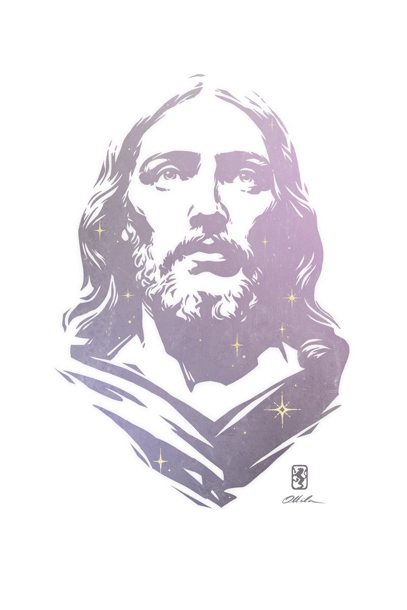 This is a hand carved woodcut relief print. The artist's goal in carving this piece was to create a simple likeness of Jesus that conveys his reach and influence to all corners of the universe as one of His titles implies, Alpha and Omega, the Beginning and the End.