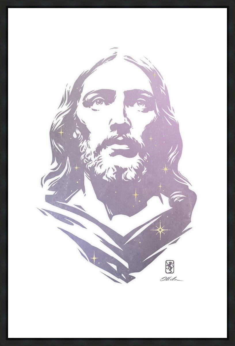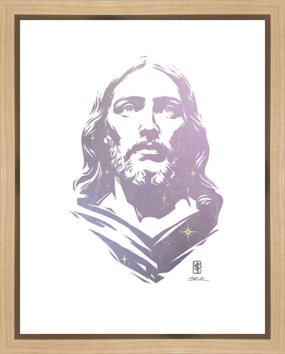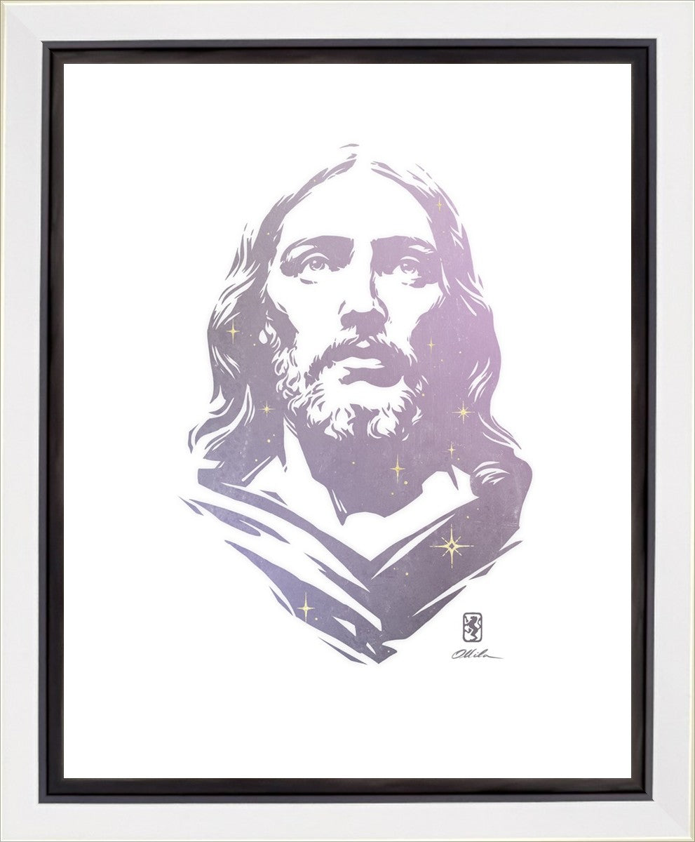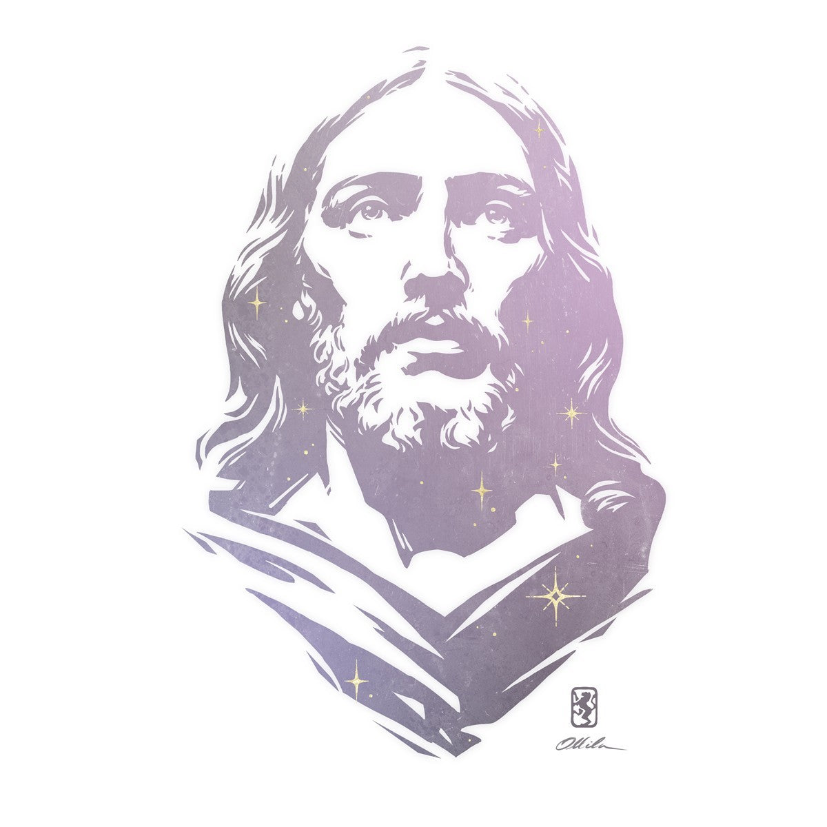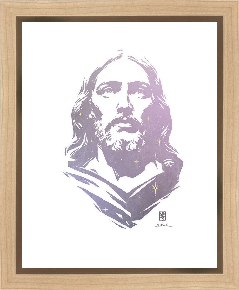 This is a hand carved woodcut relief print. The artist's goal in carving this piece was to create a simple likeness of Jesus that conveys his reach and influence to all corners of the universe as one of His titles implies, Alpha and Omega, the Beginning and the End.