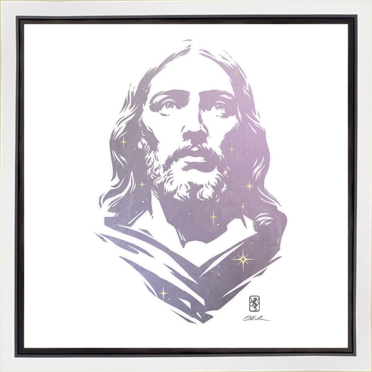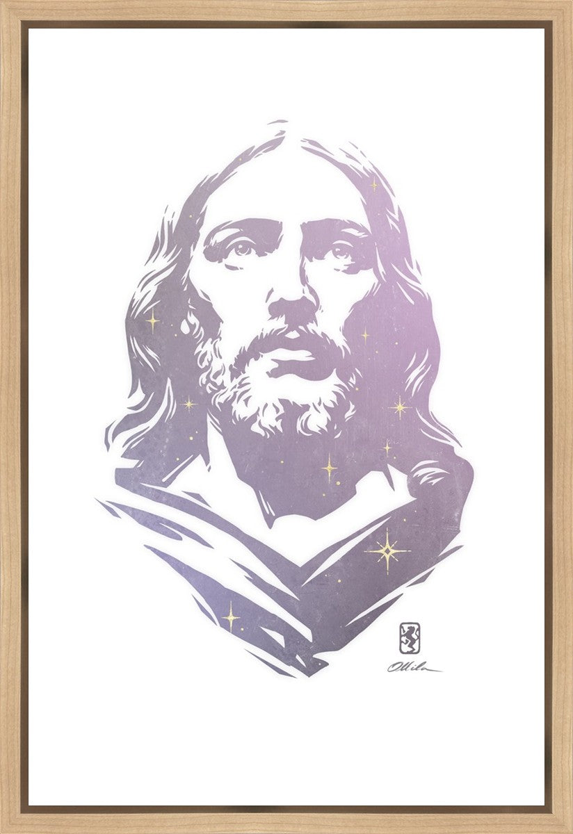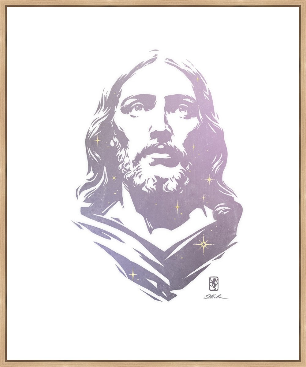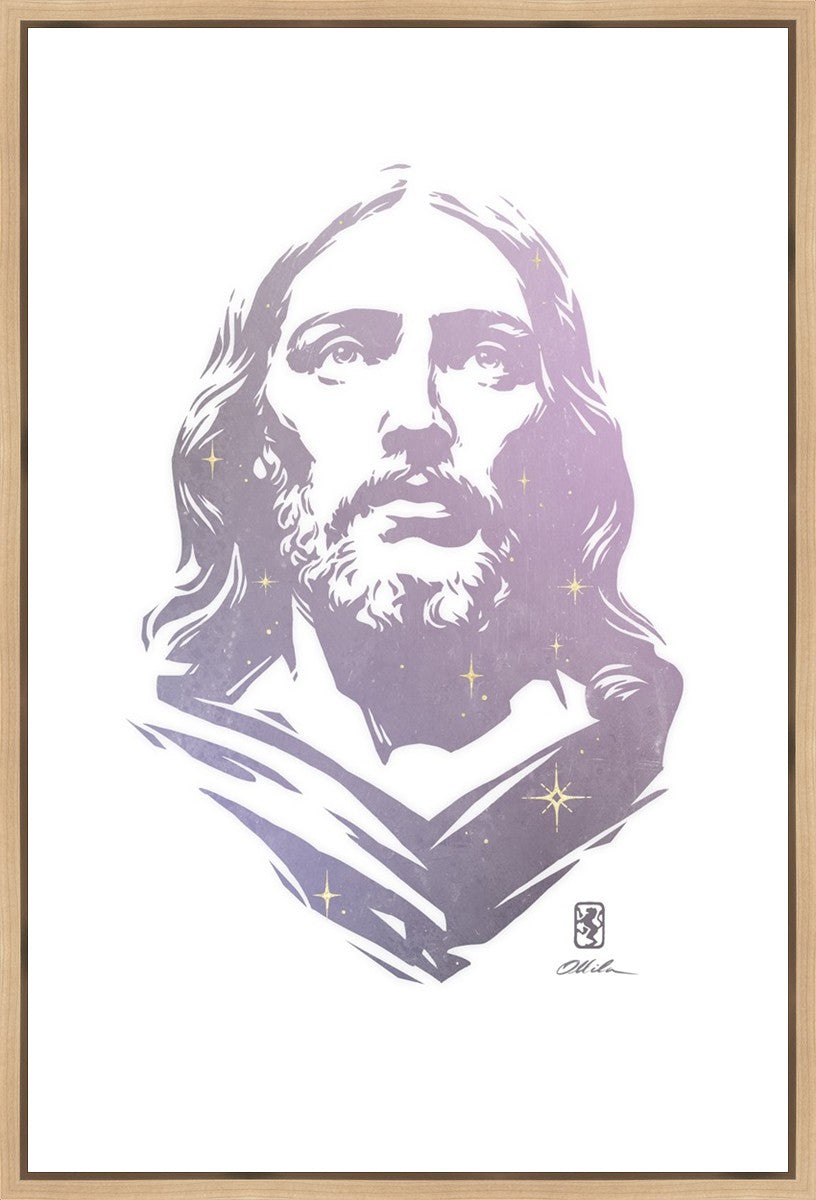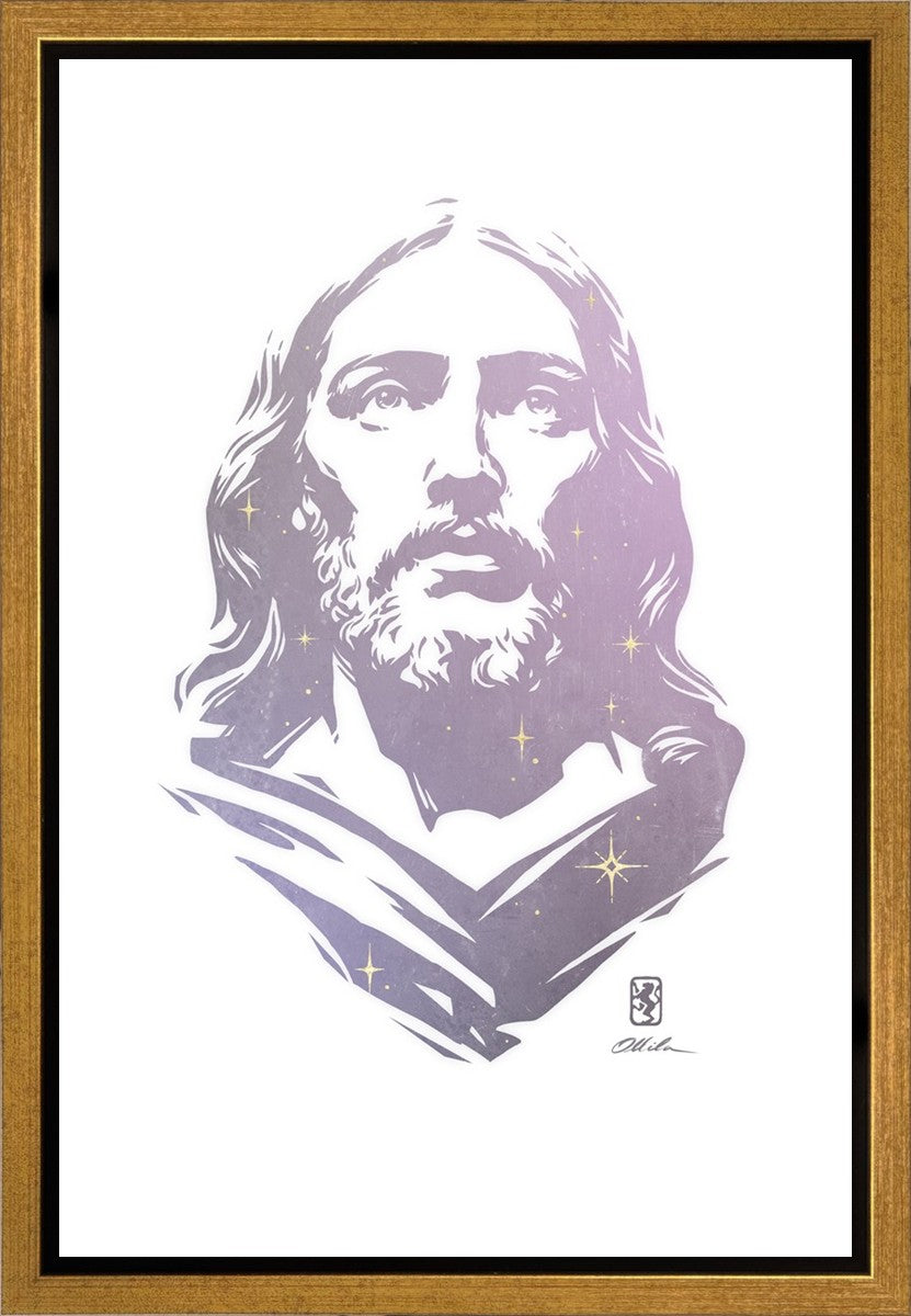 This is a hand carved woodcut relief print. The artist's goal in carving this piece was to create a simple likeness of Jesus that conveys his reach and influence to all corners of the universe as one of His titles implies, Alpha and Omega, the Beginning and the End.