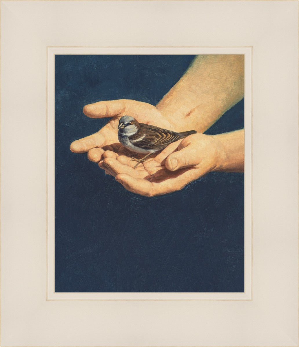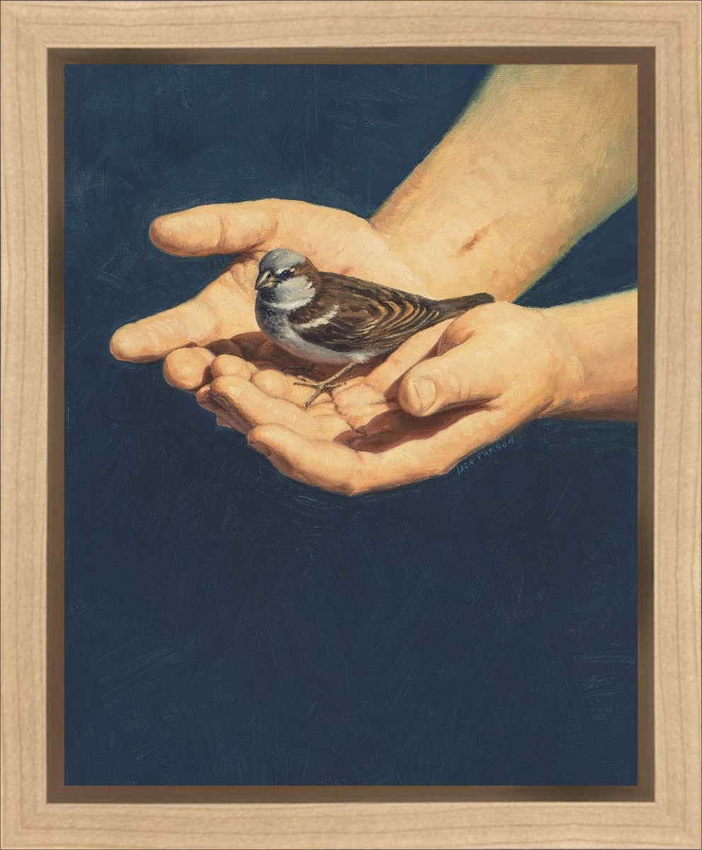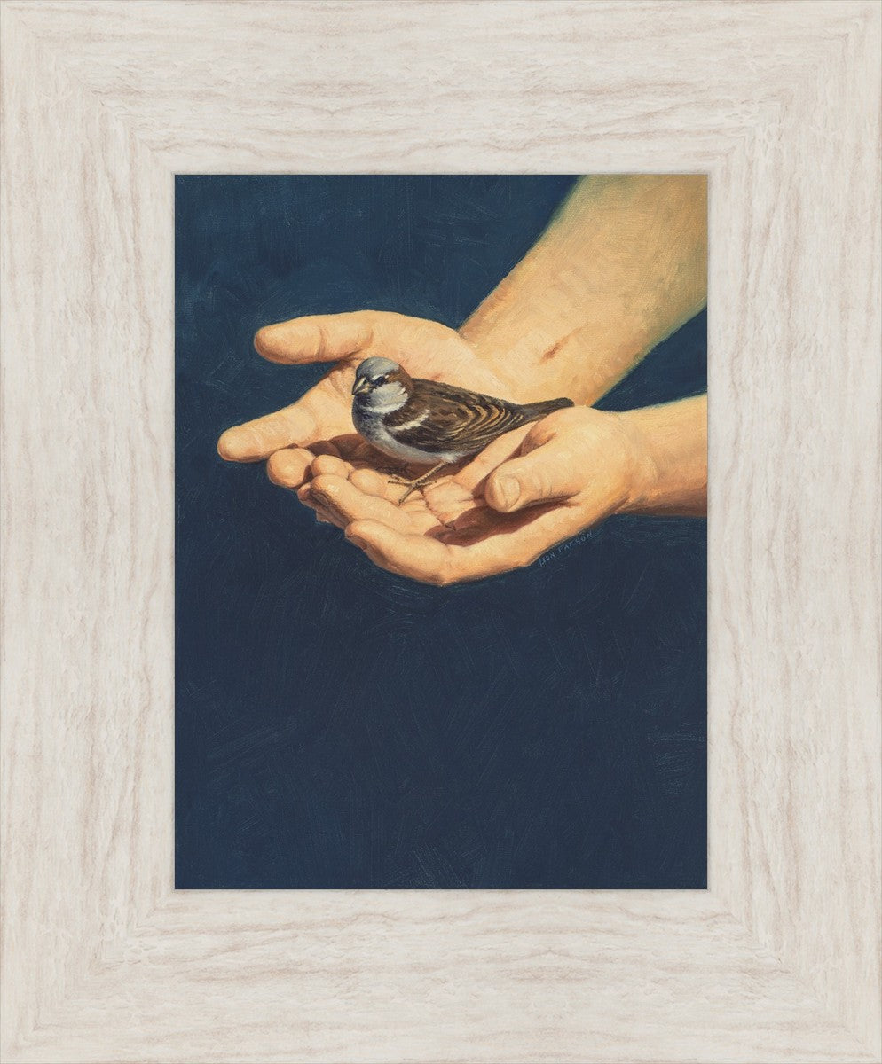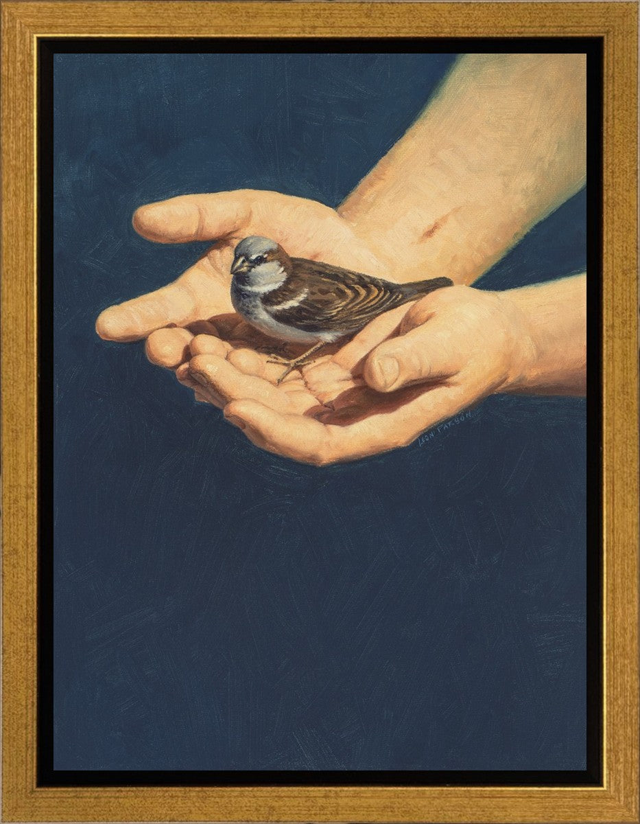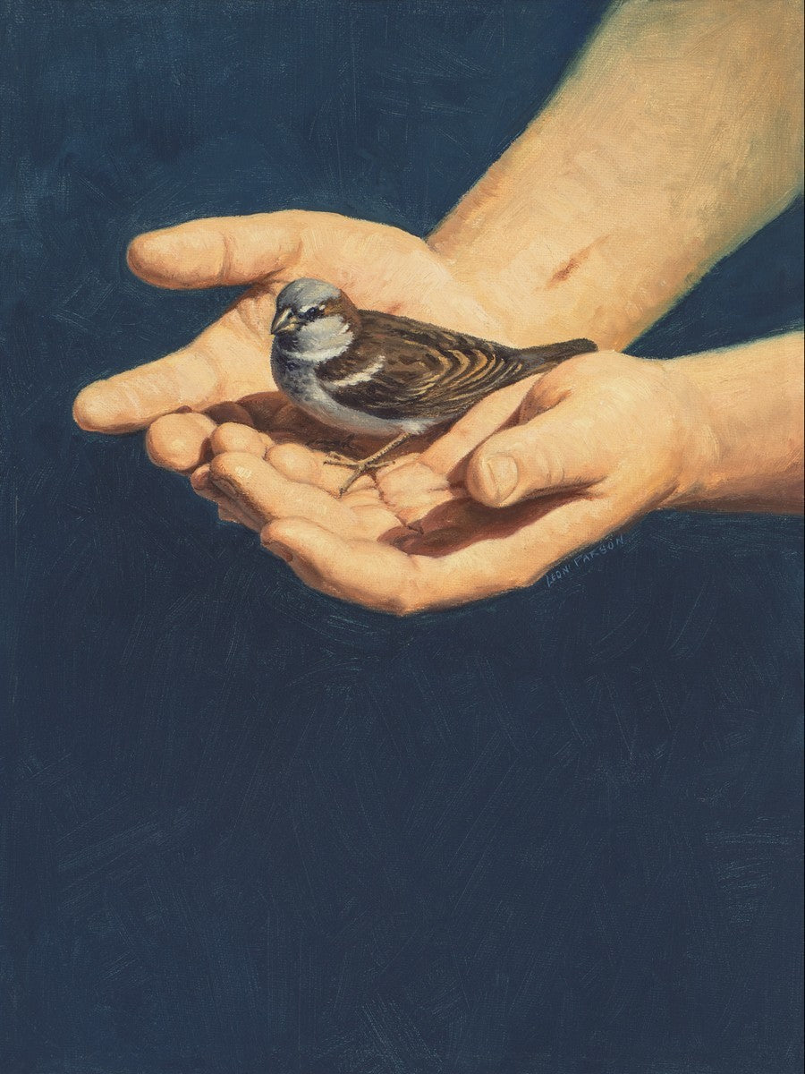 The composition was for a BYUI booklet. I used my friend’s hands and a mounted bird borrowed from the Biology Department. The English Sparrow markings were “invented” and painted on the shape of the mounted bird. Matthew 10:29