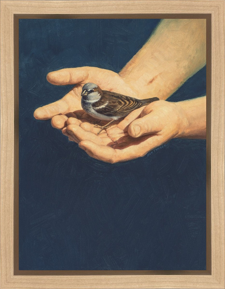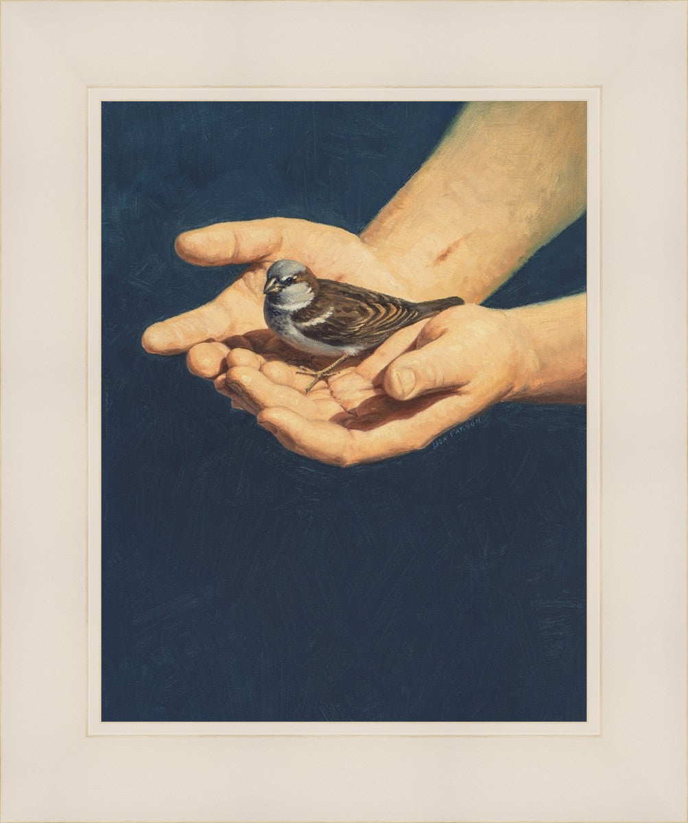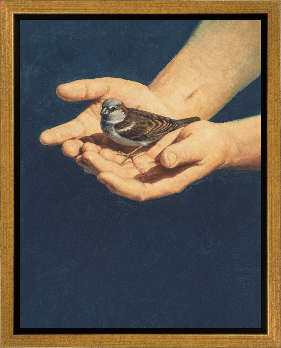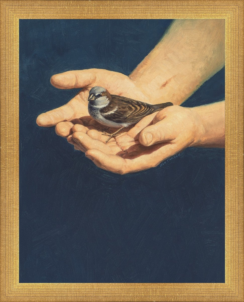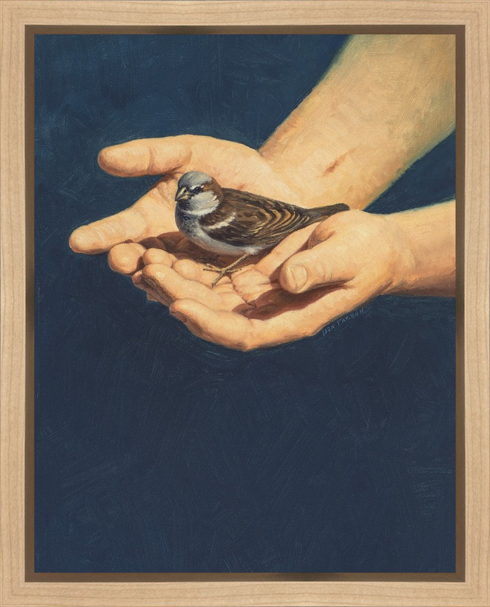 The composition was for a BYUI booklet. I used my friend’s hands and a mounted bird borrowed from the Biology Department. The English Sparrow markings were “invented” and painted on the shape of the mounted bird. Matthew 10:29