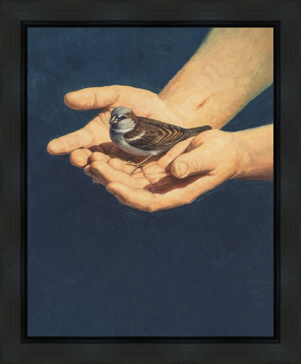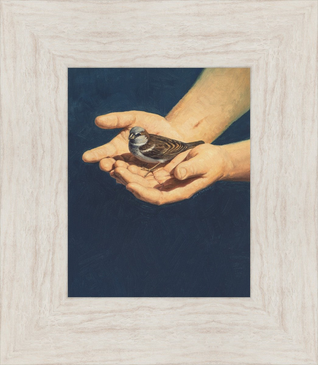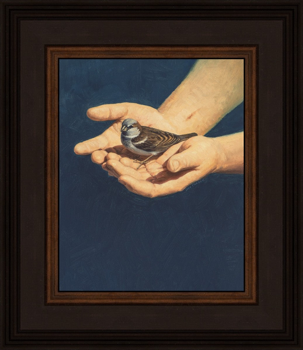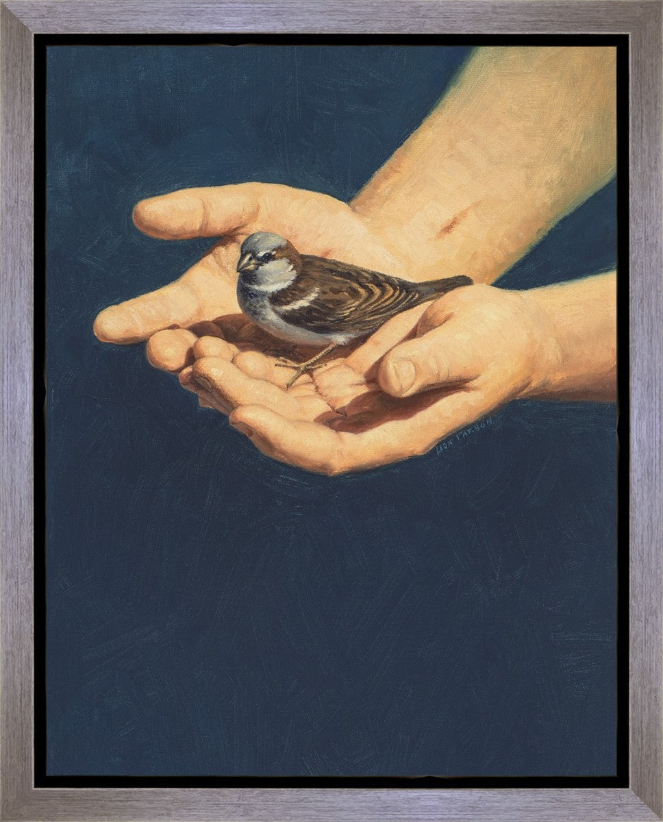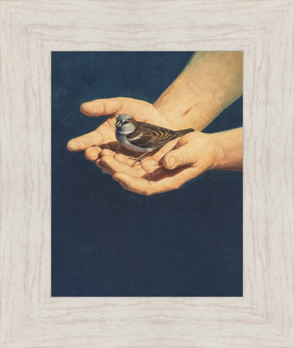 The composition was for a BYUI booklet. I used my friend’s hands and a mounted bird borrowed from the Biology Department. The English Sparrow markings were “invented” and painted on the shape of the mounted bird. Matthew 10:29