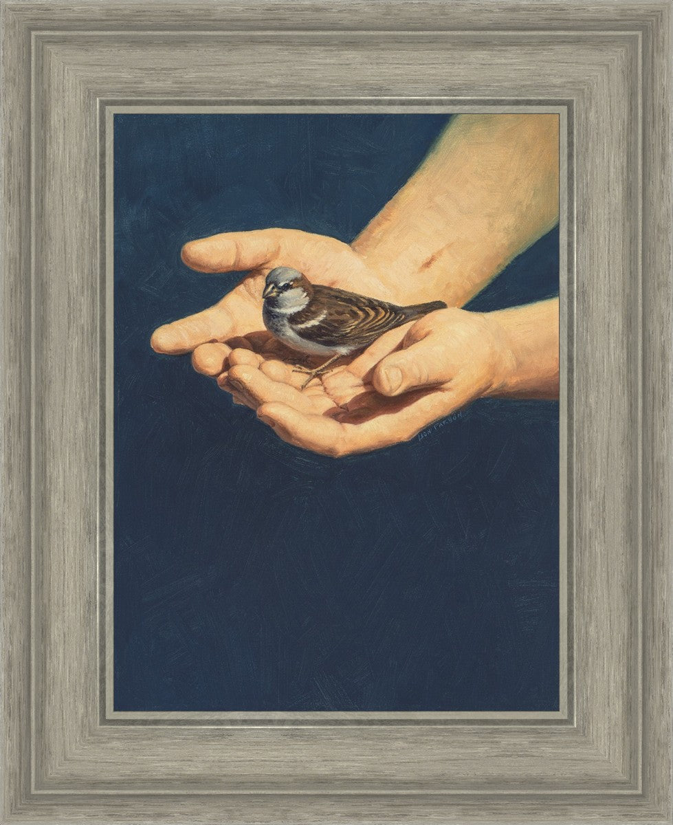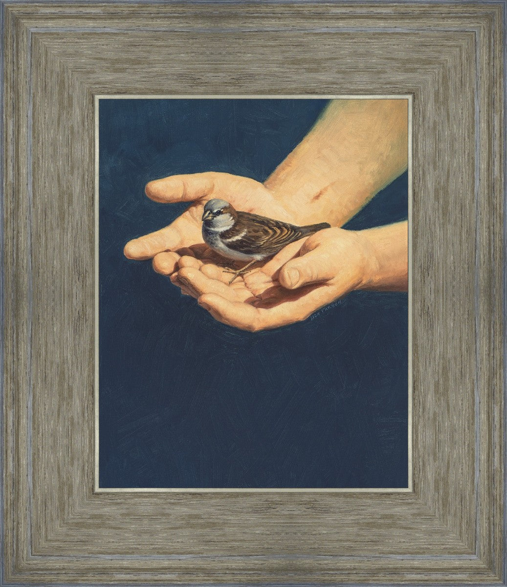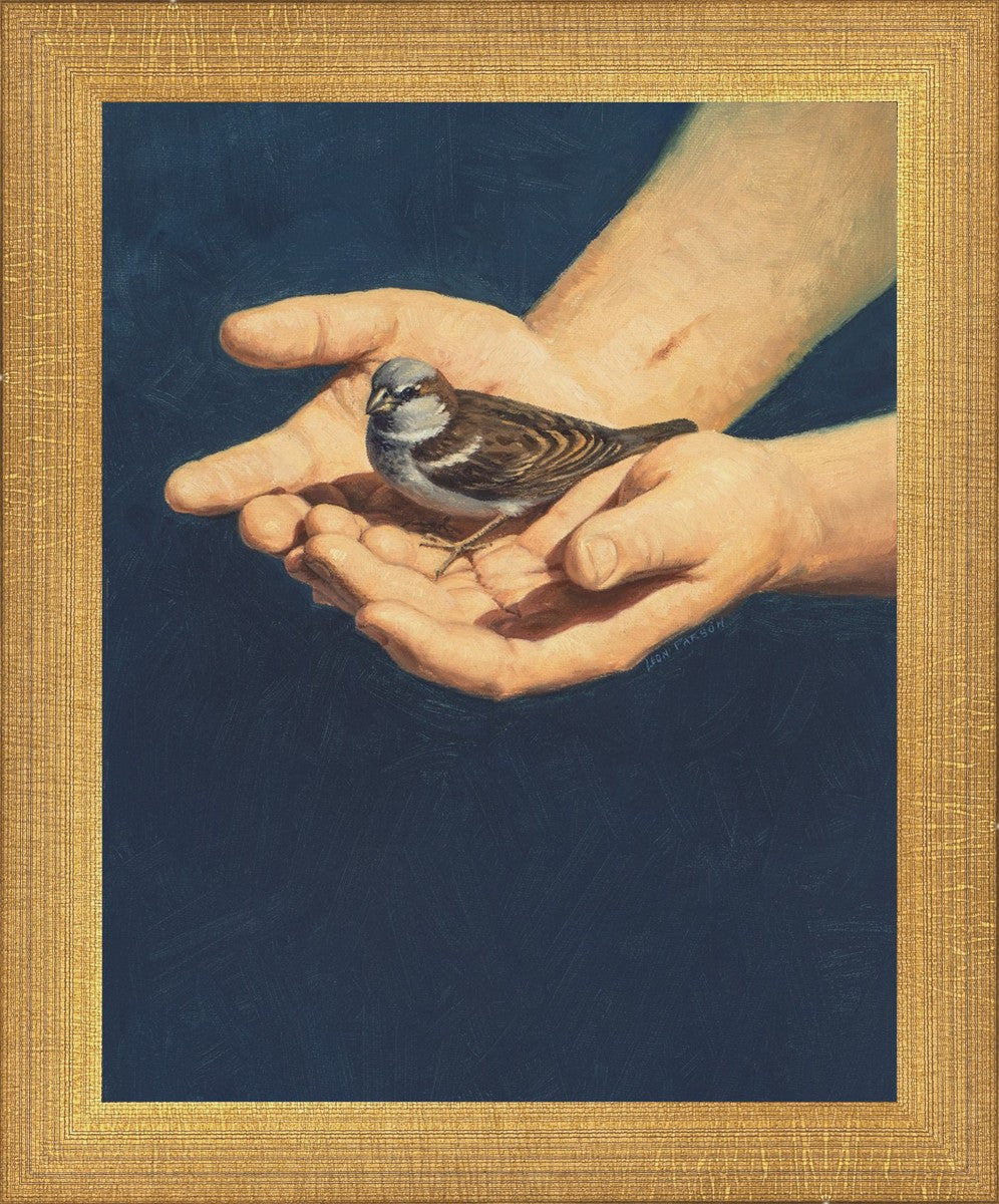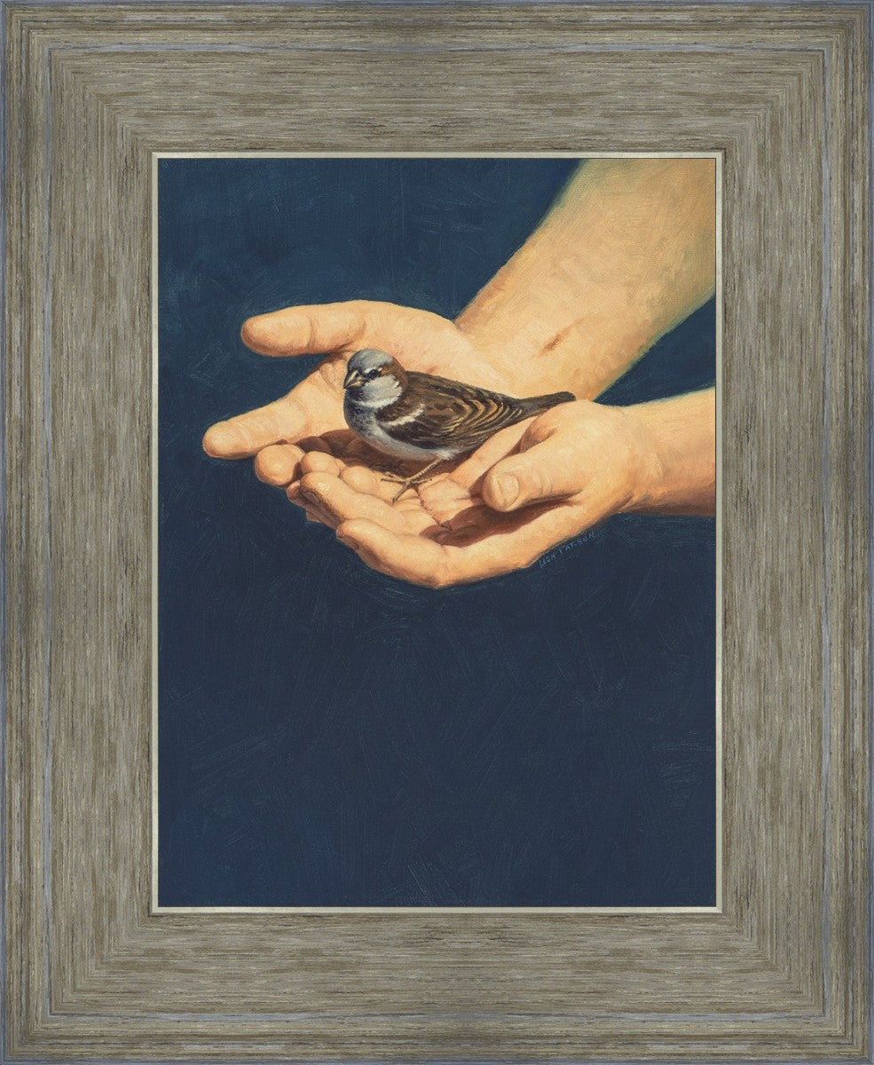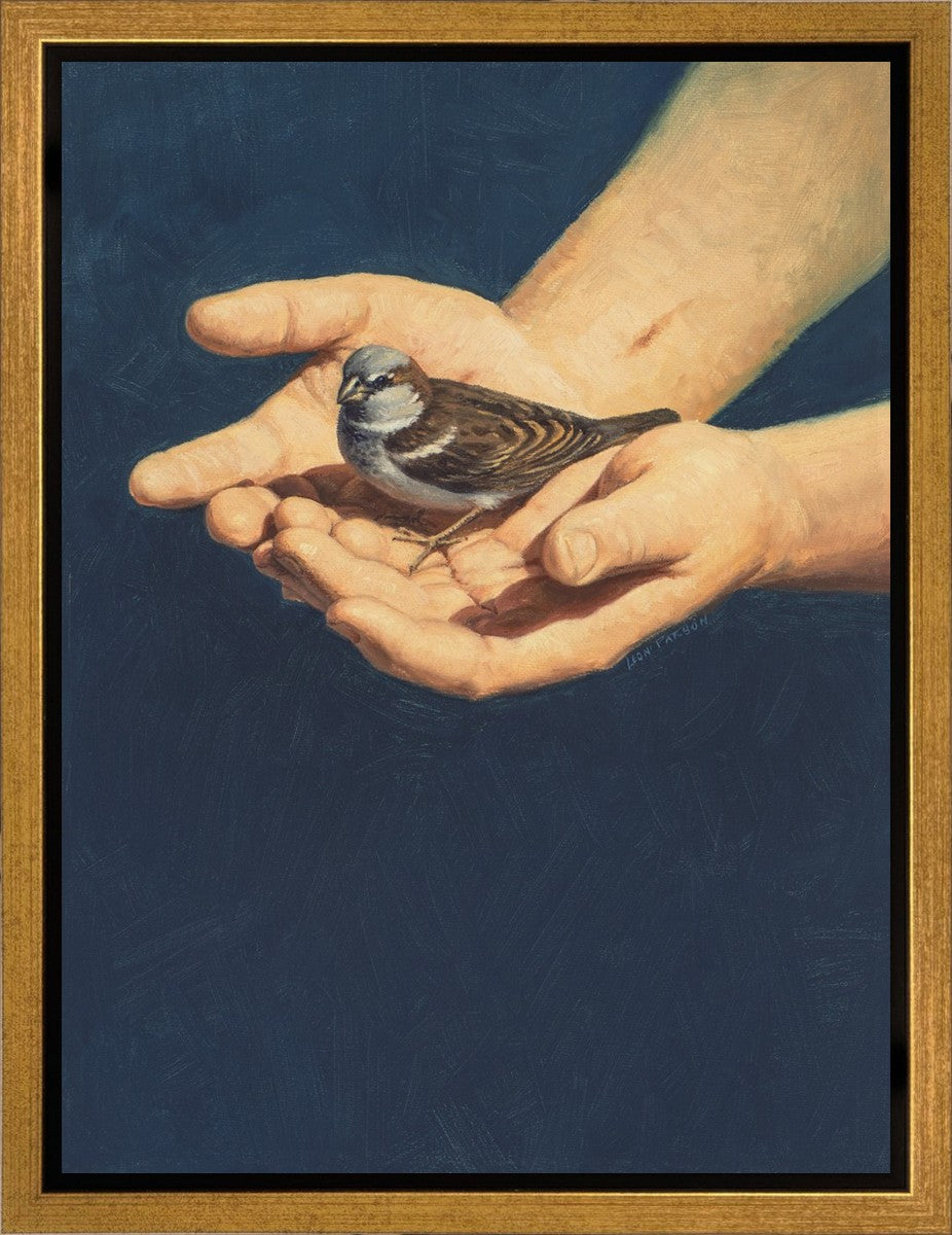 The composition was for a BYUI booklet. I used my friend’s hands and a mounted bird borrowed from the Biology Department. The English Sparrow markings were “invented” and painted on the shape of the mounted bird. Matthew 10:29