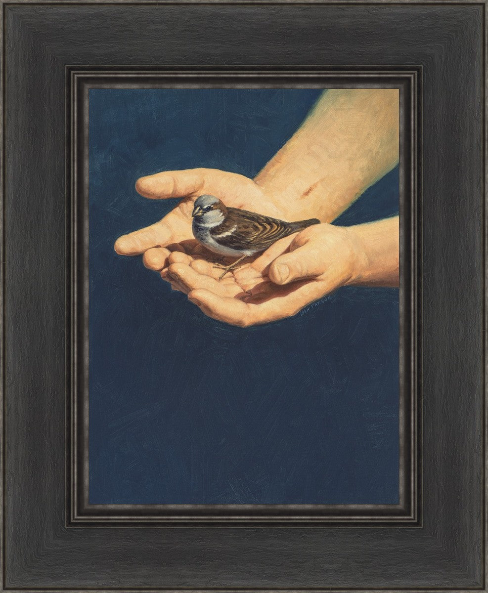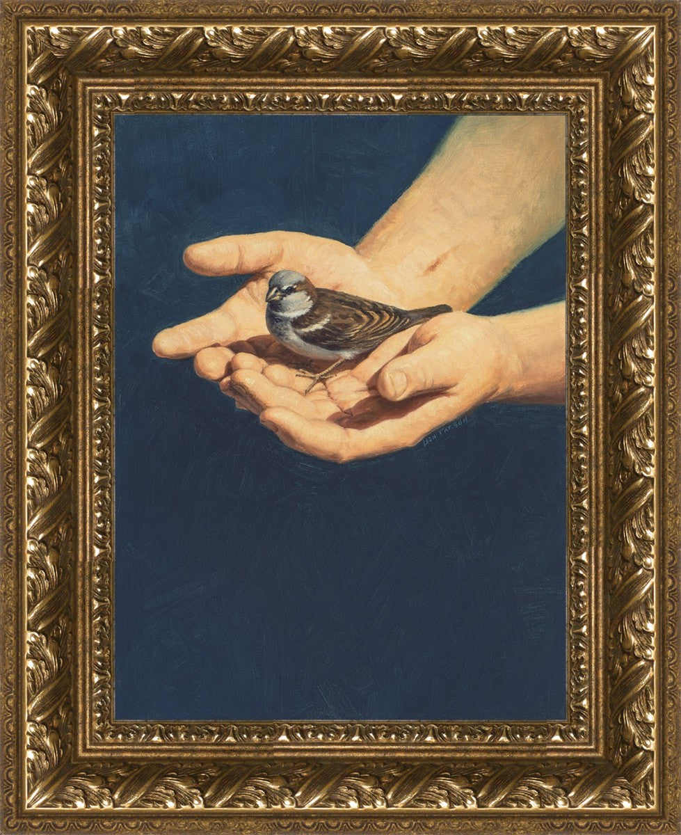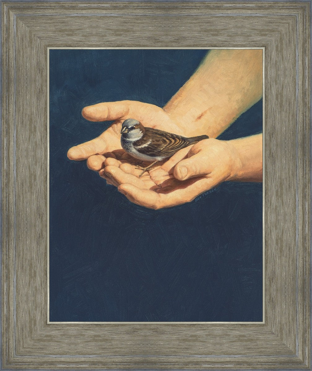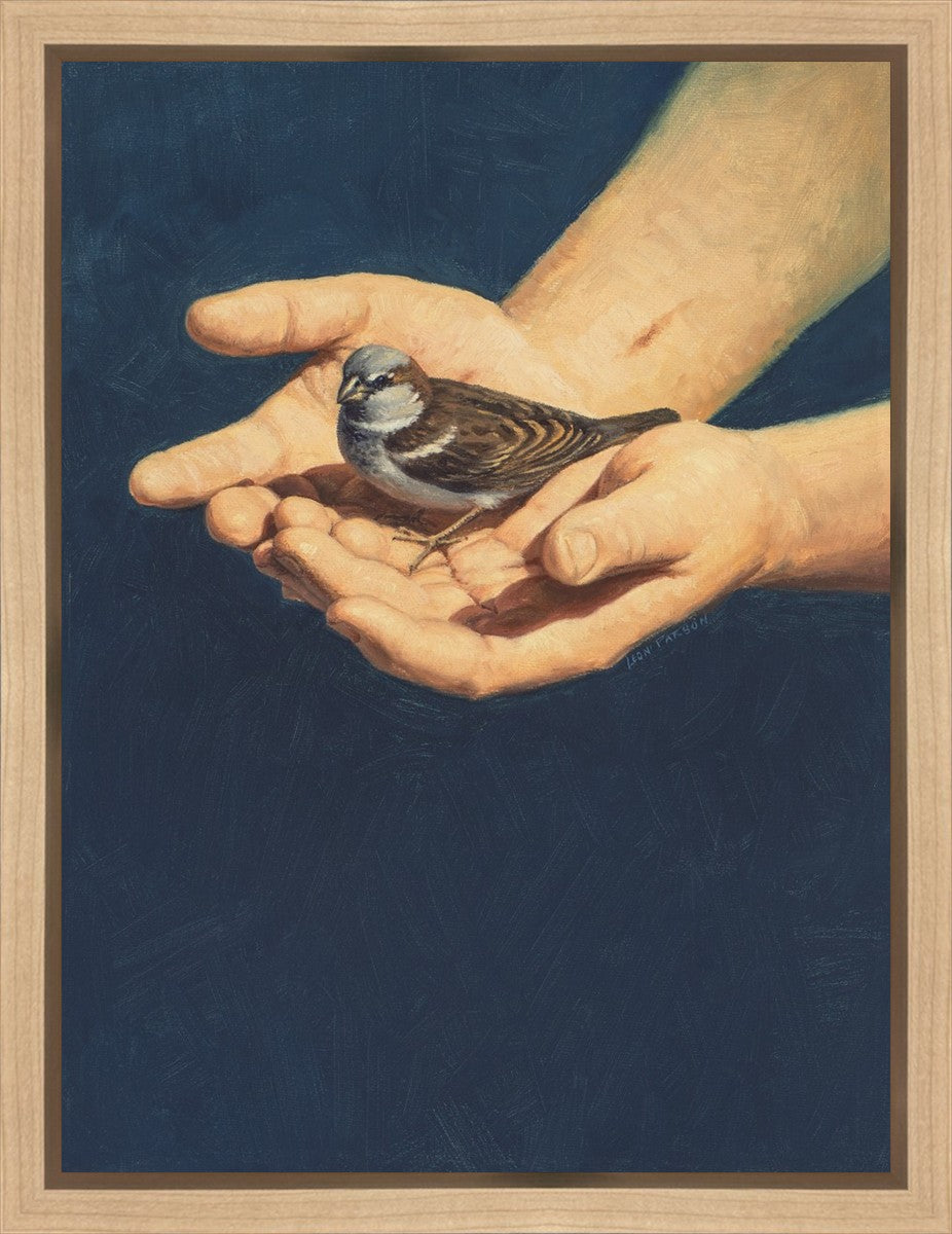 The composition was for a BYUI booklet. I used my friend’s hands and a mounted bird borrowed from the Biology Department. The English Sparrow markings were “invented” and painted on the shape of the mounted bird. Matthew 10:29