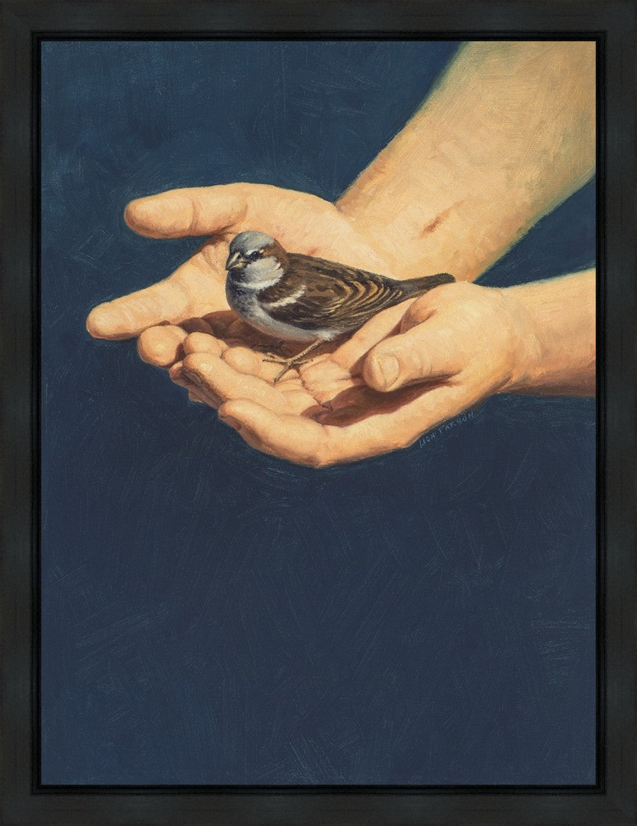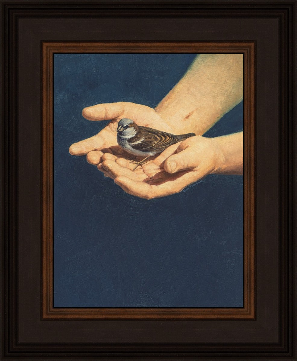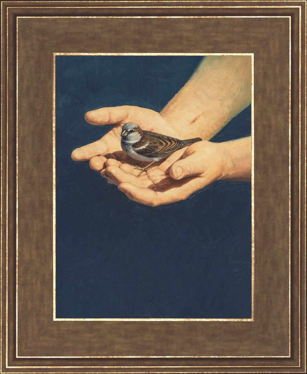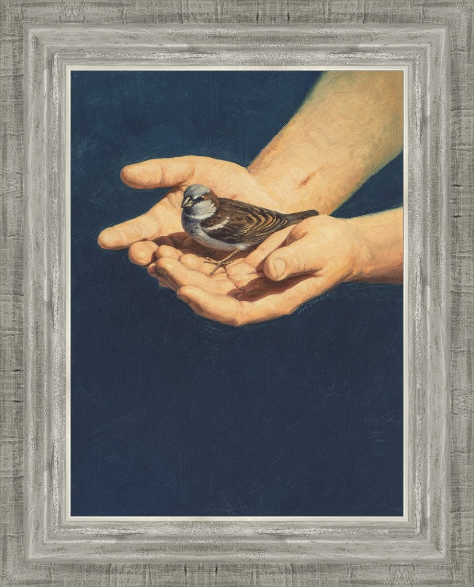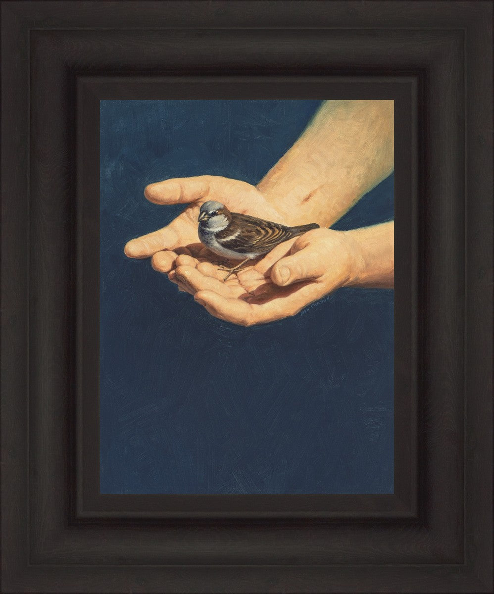 The composition was for a BYUI booklet. I used my friend’s hands and a mounted bird borrowed from the Biology Department. The English Sparrow markings were “invented” and painted on the shape of the mounted bird. Matthew 10:29