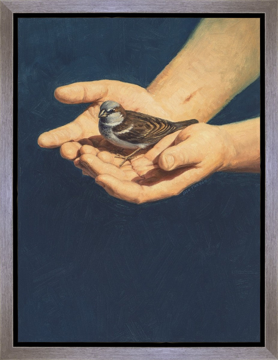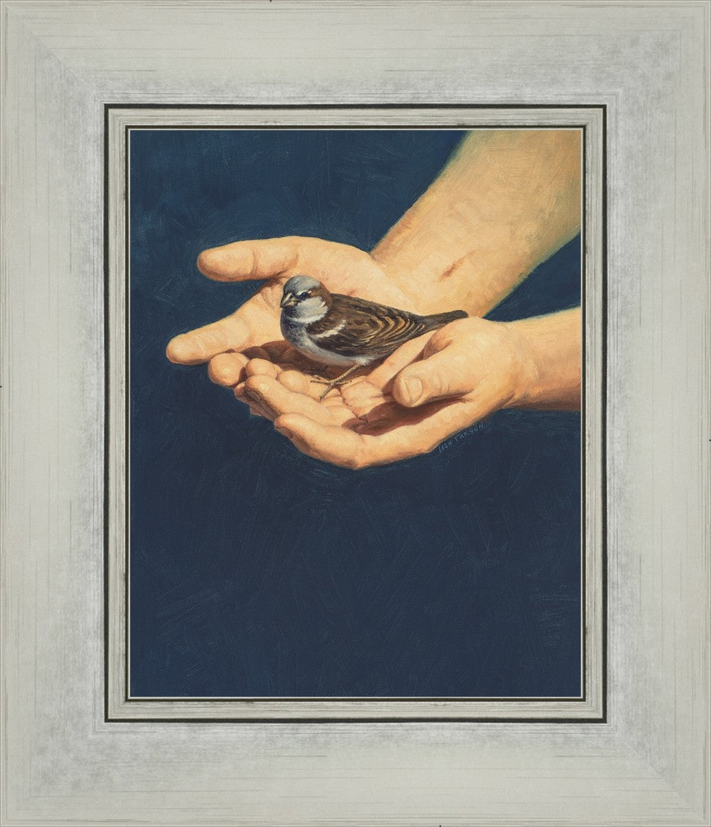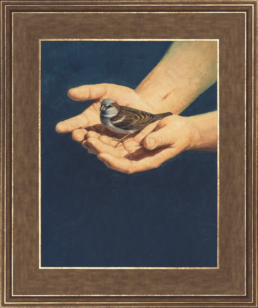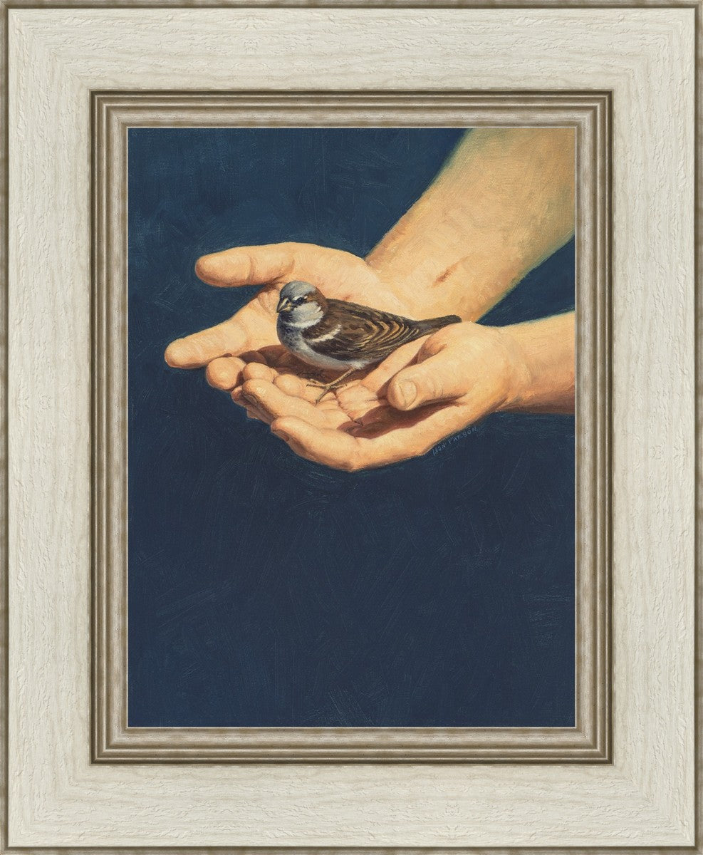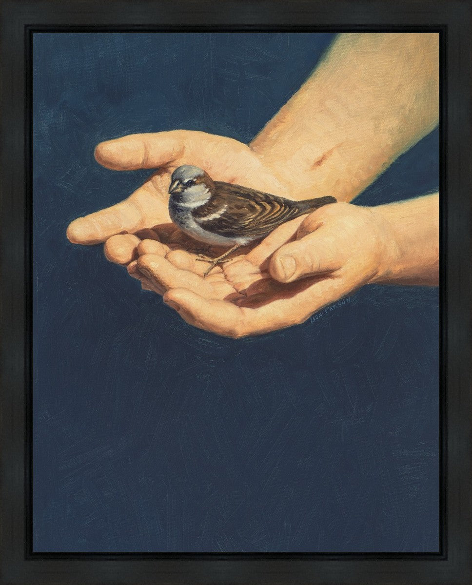 The composition was for a BYUI booklet. I used my friend’s hands and a mounted bird borrowed from the Biology Department. The English Sparrow markings were “invented” and painted on the shape of the mounted bird. Matthew 10:29