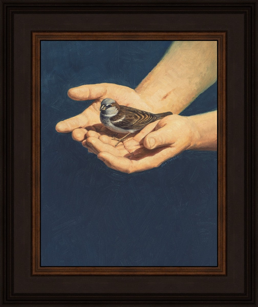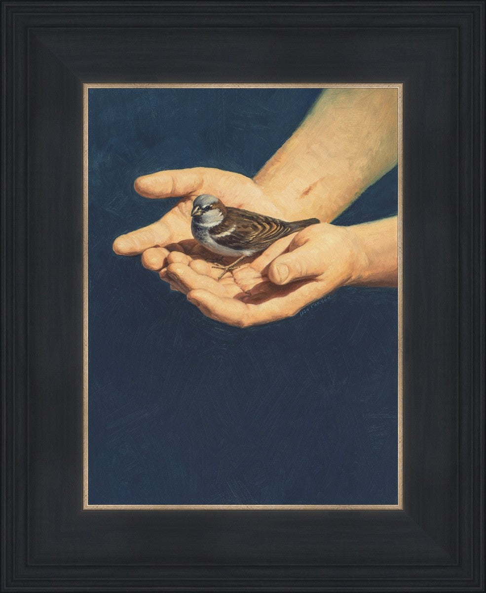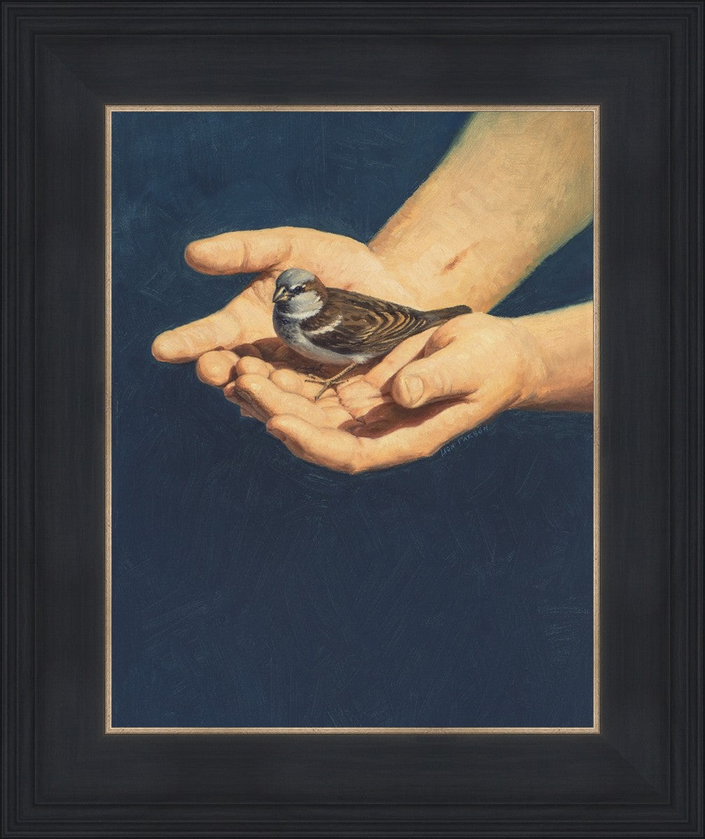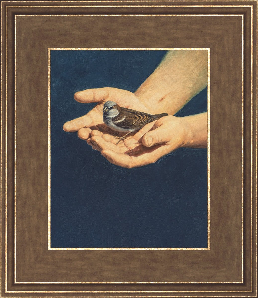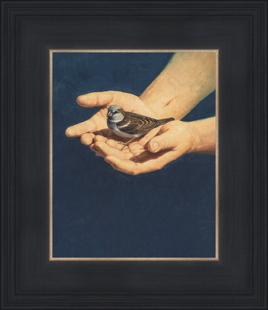 The composition was for a BYUI booklet. I used my friend’s hands and a mounted bird borrowed from the Biology Department. The English Sparrow markings were “invented” and painted on the shape of the mounted bird. Matthew 10:29