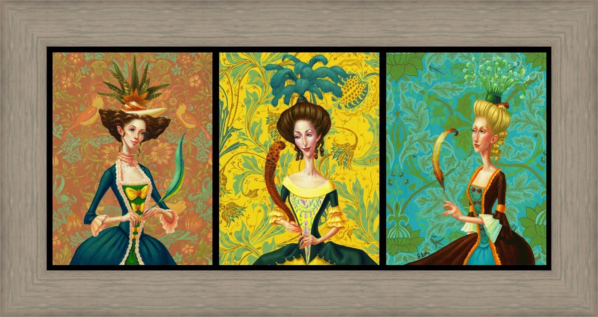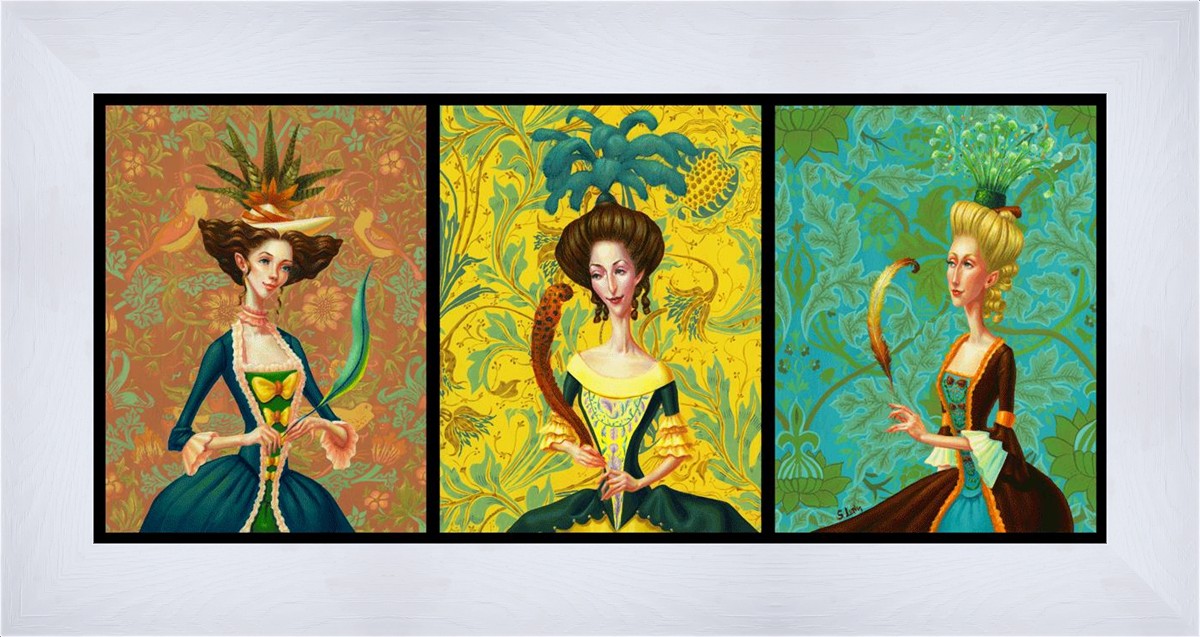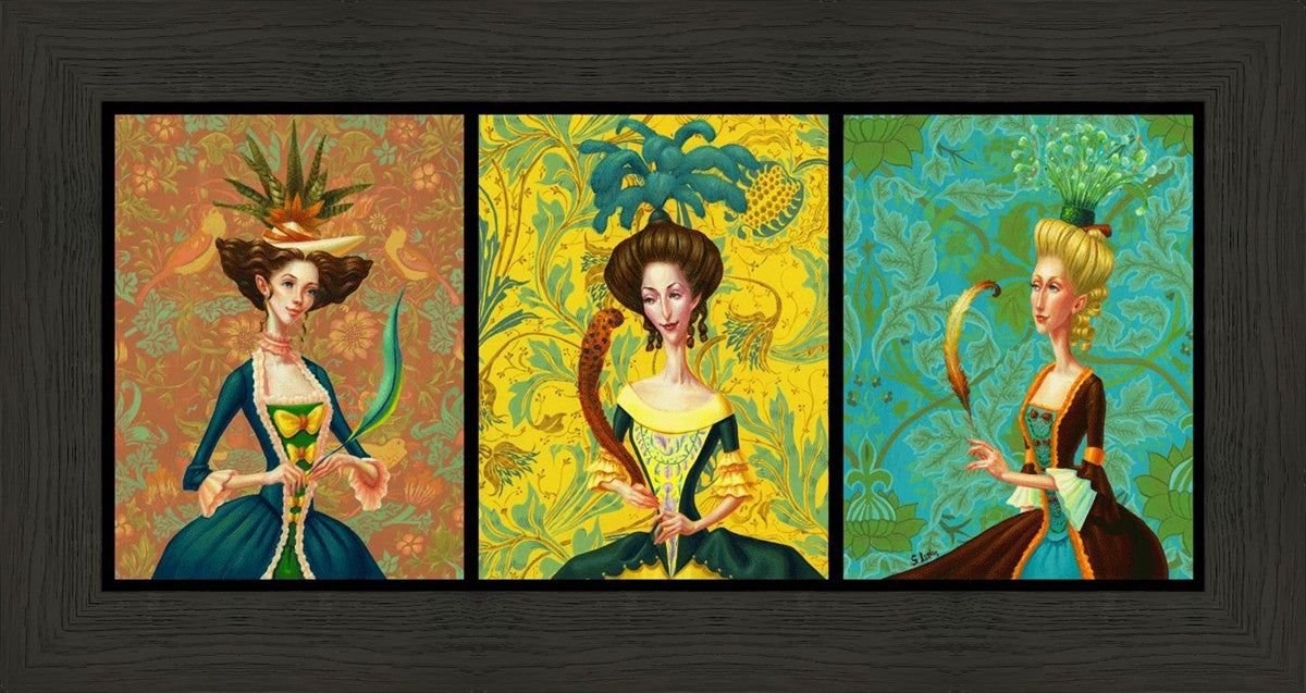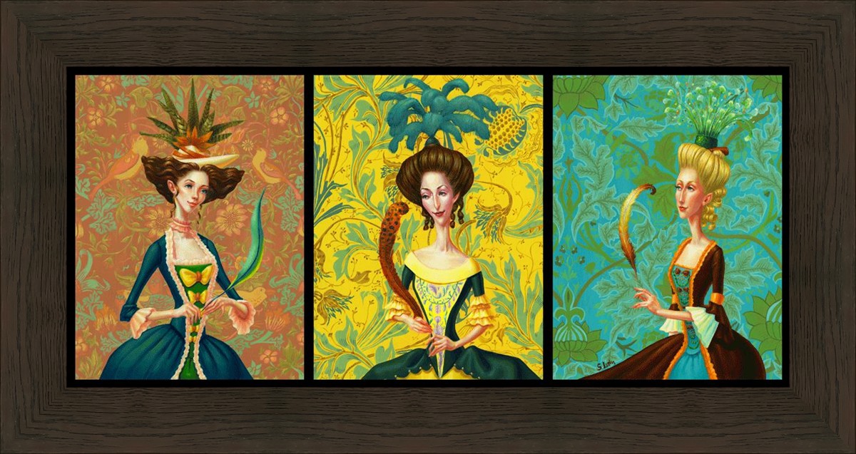 I love idioms. It's funny to me how each language cultivates their own unique turns of phrase and how the meanings can change over time. The history of the phrase, "another feather in your cap," begins in the 17th century with a negative connotation; a feather in your cap was seen a sign of foolishness. By the 18th century (possibly due to the more widespread use of plumage on one's garb) this has turned into a positive phrase of praise. I incorporate both meanings of this idiom into my collection of little paintings. Each of these women is adding yet another achievement to their long lists of accolades. Is it vain? I suppose it can be. It doesn't have to be, though. We each in our own way improve and develop and grow and add, as it were, feathers to our caps.